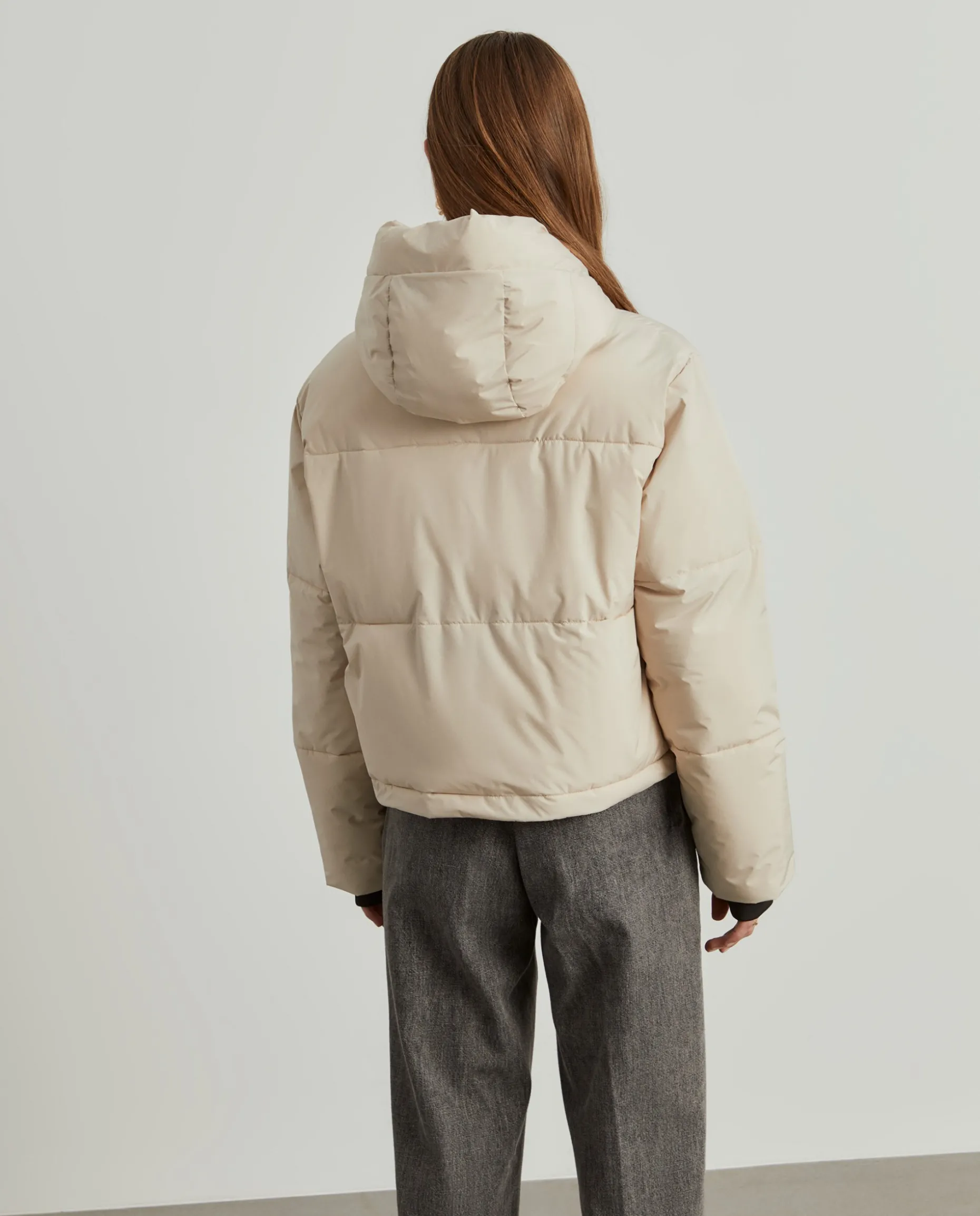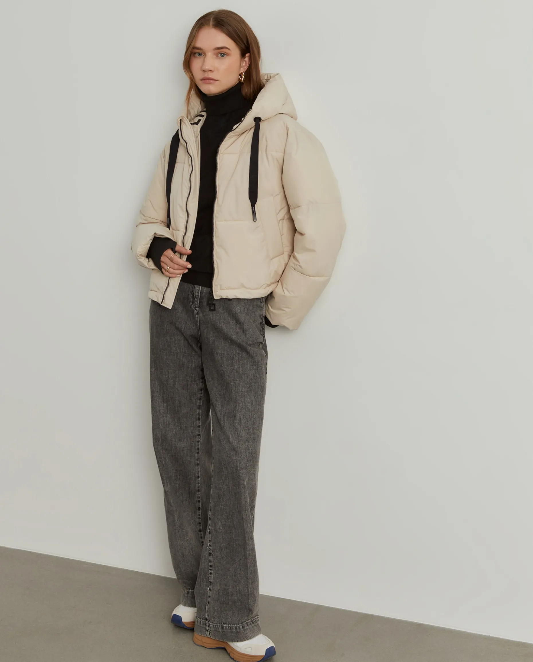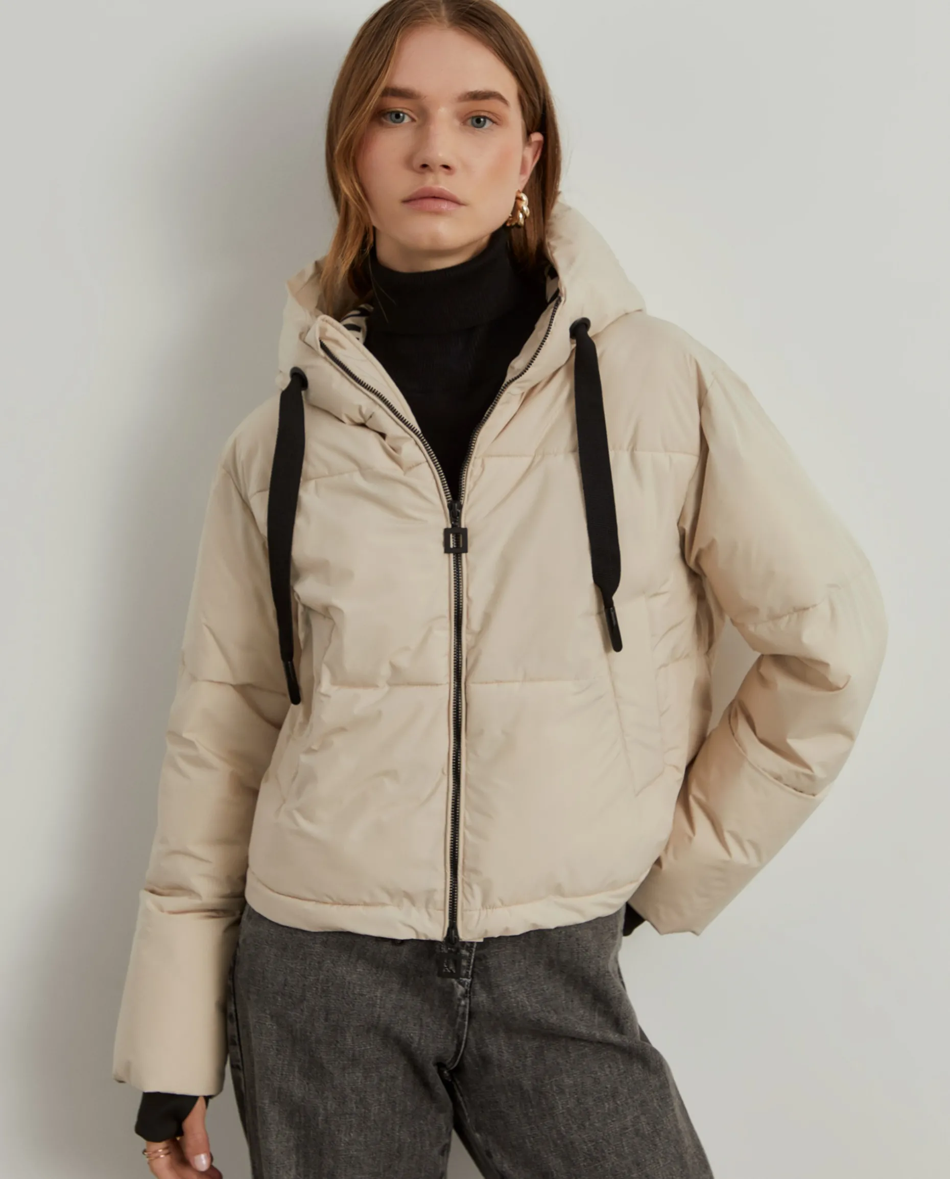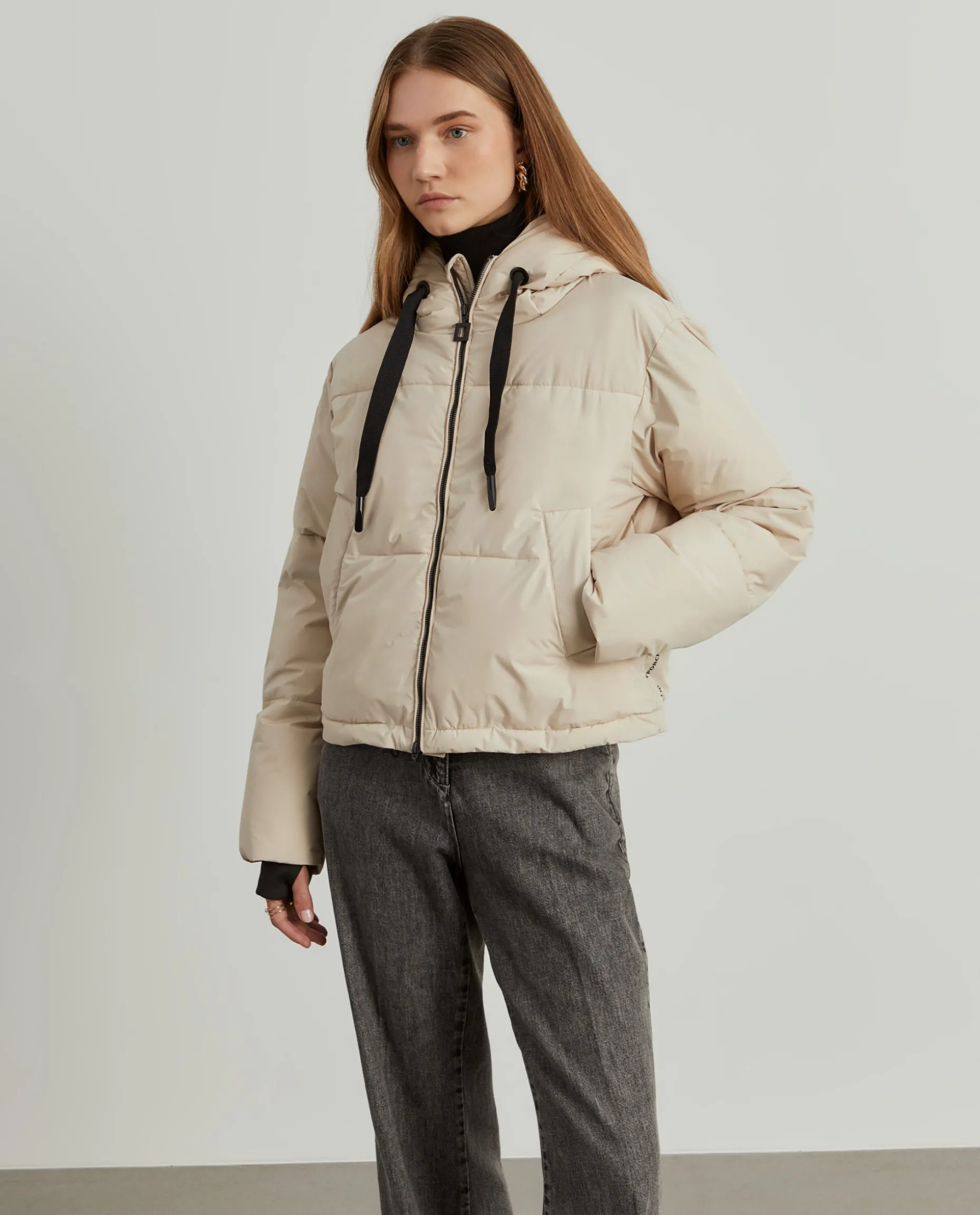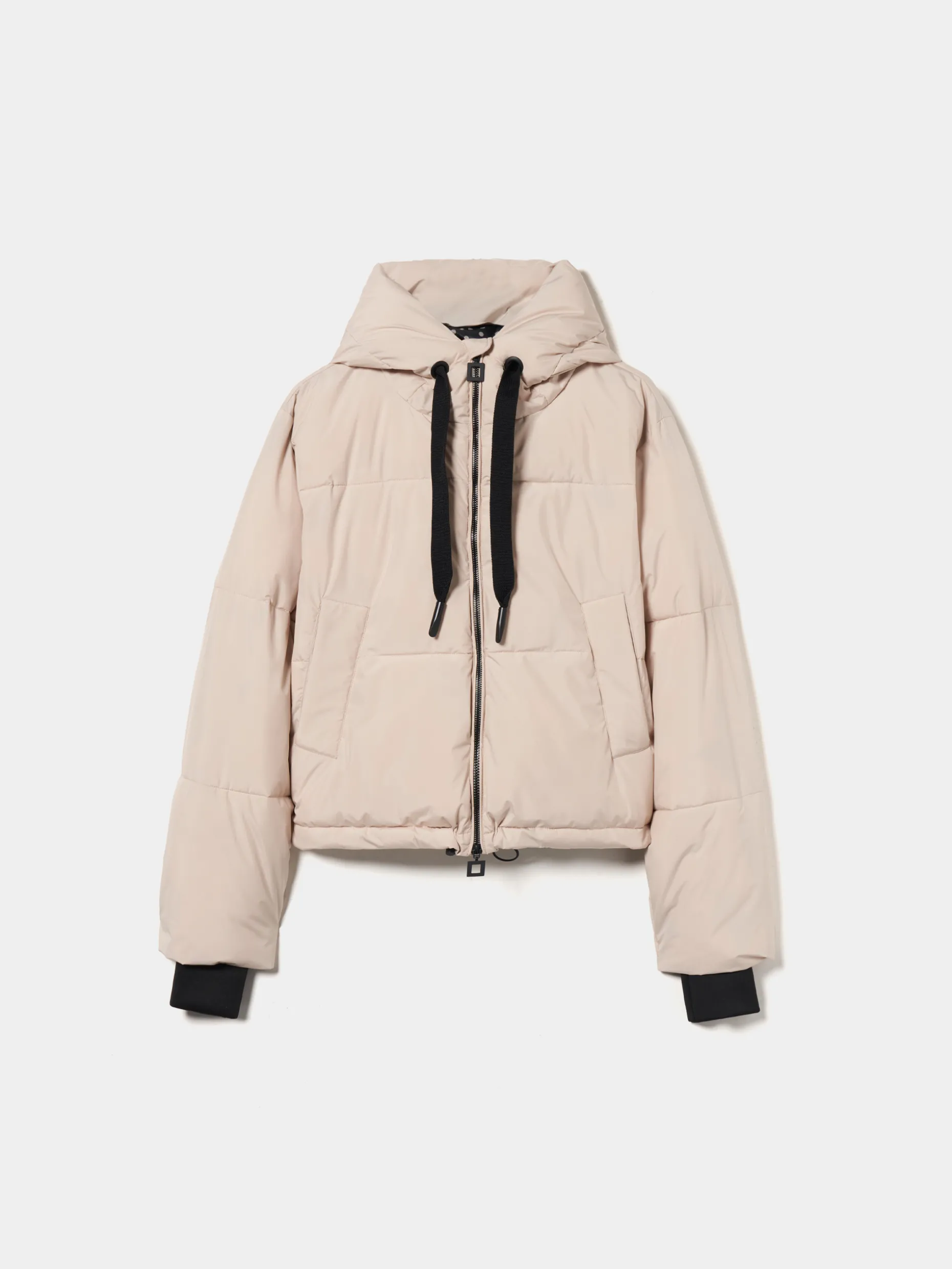 Mantenha-se quente e confortável no seu dia-a-dia com este blusão curto acolchoado. Com capuz ajustável por cordão em contraste de cor. Aperta com fecho duplo de correr, também em contraste. Finaliza com punhos elásticos e bolsos laterais. A cintura é ajustável. No interior, forro com padrão polka dots e elásticos para pendurar o casaco às costas quando não o quiser usar.