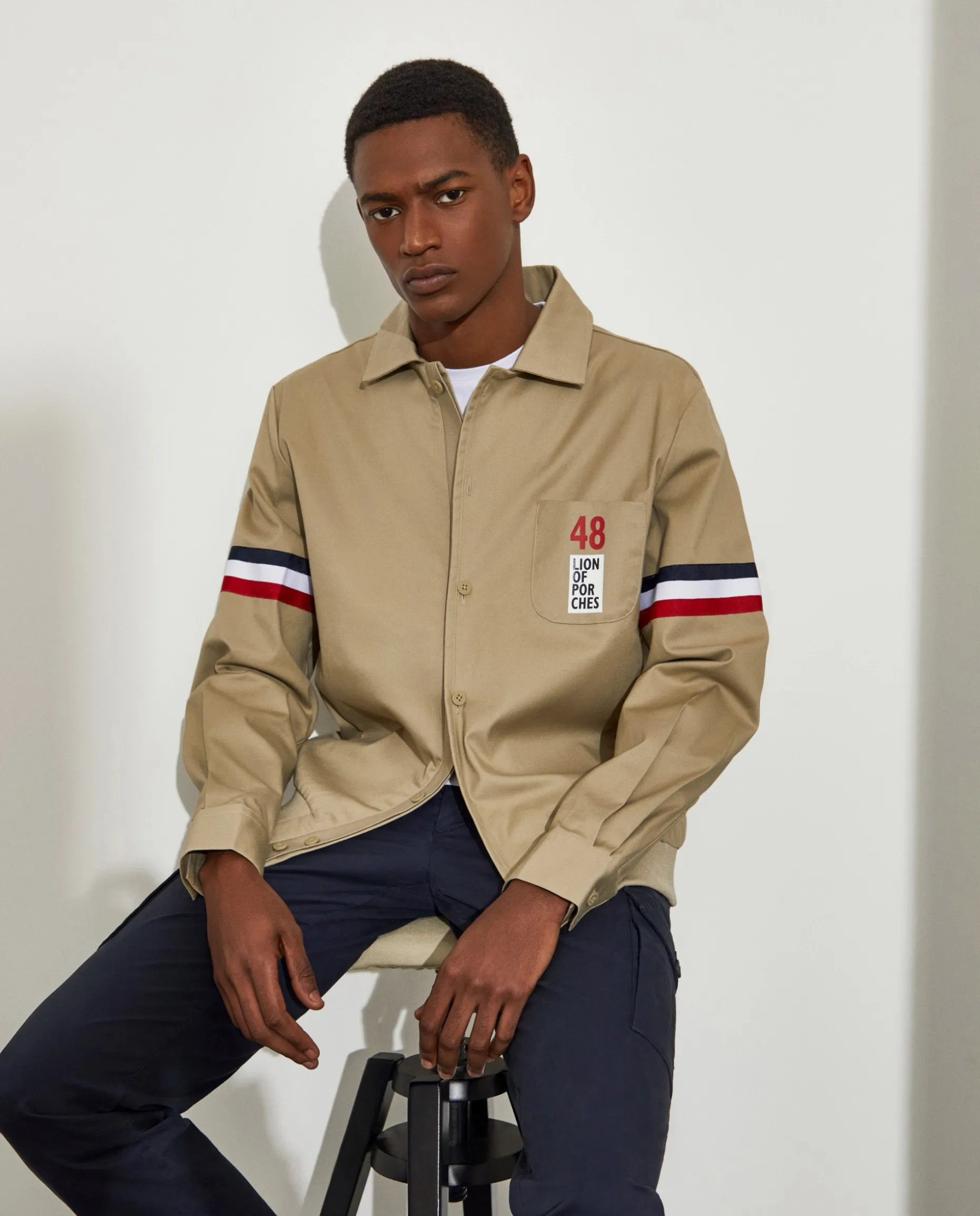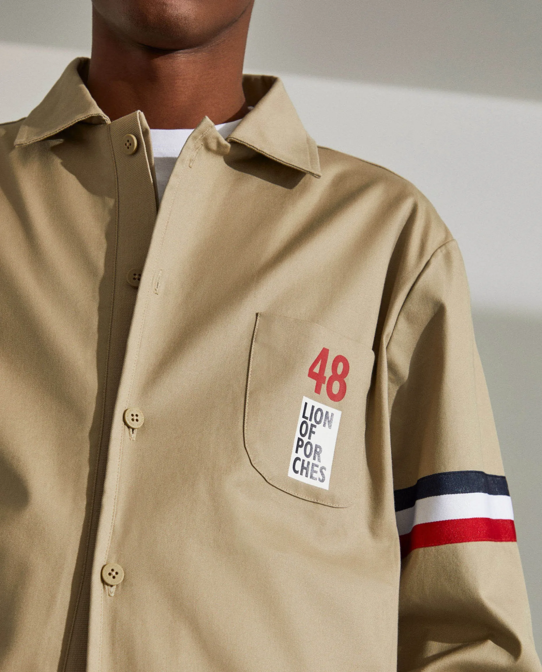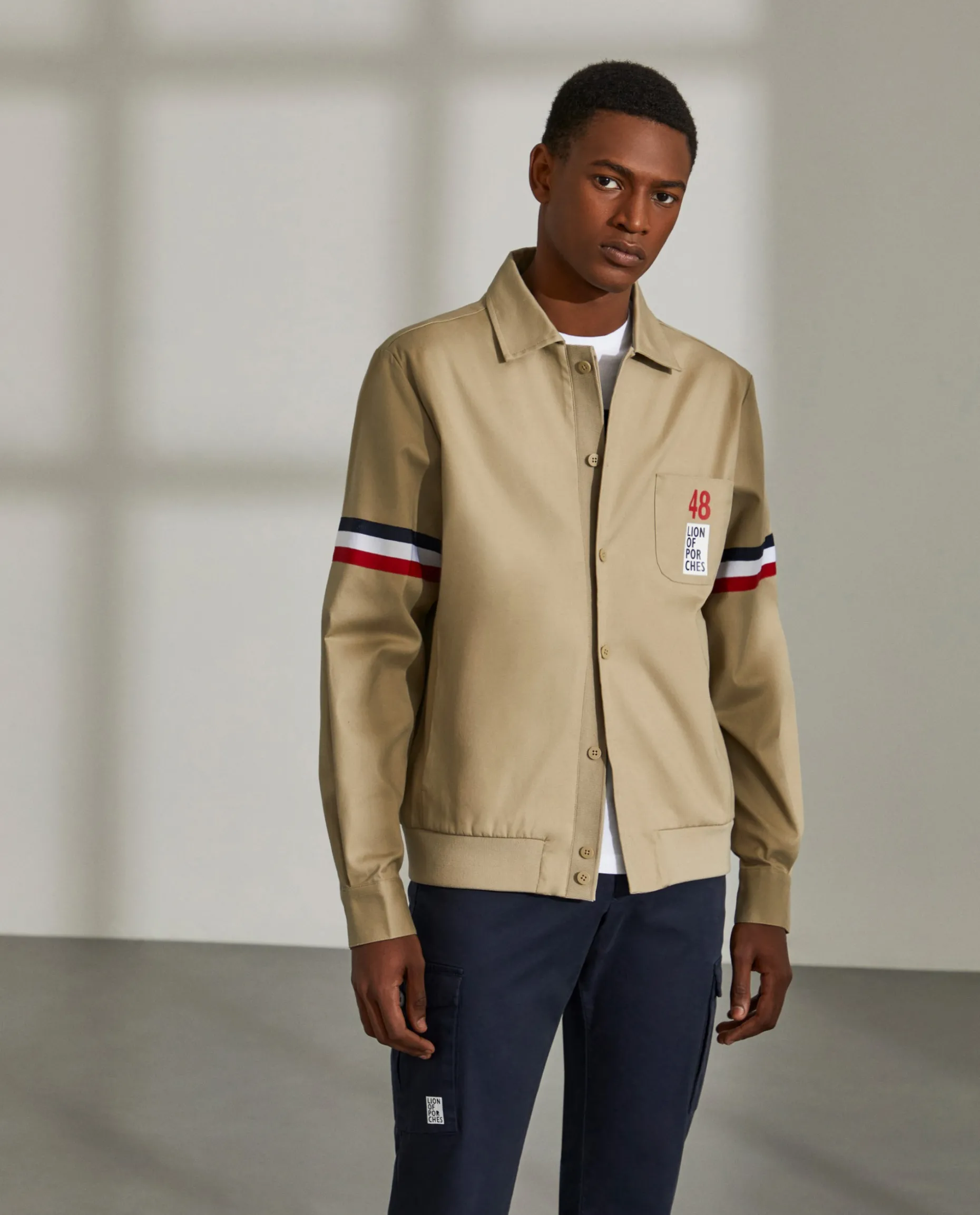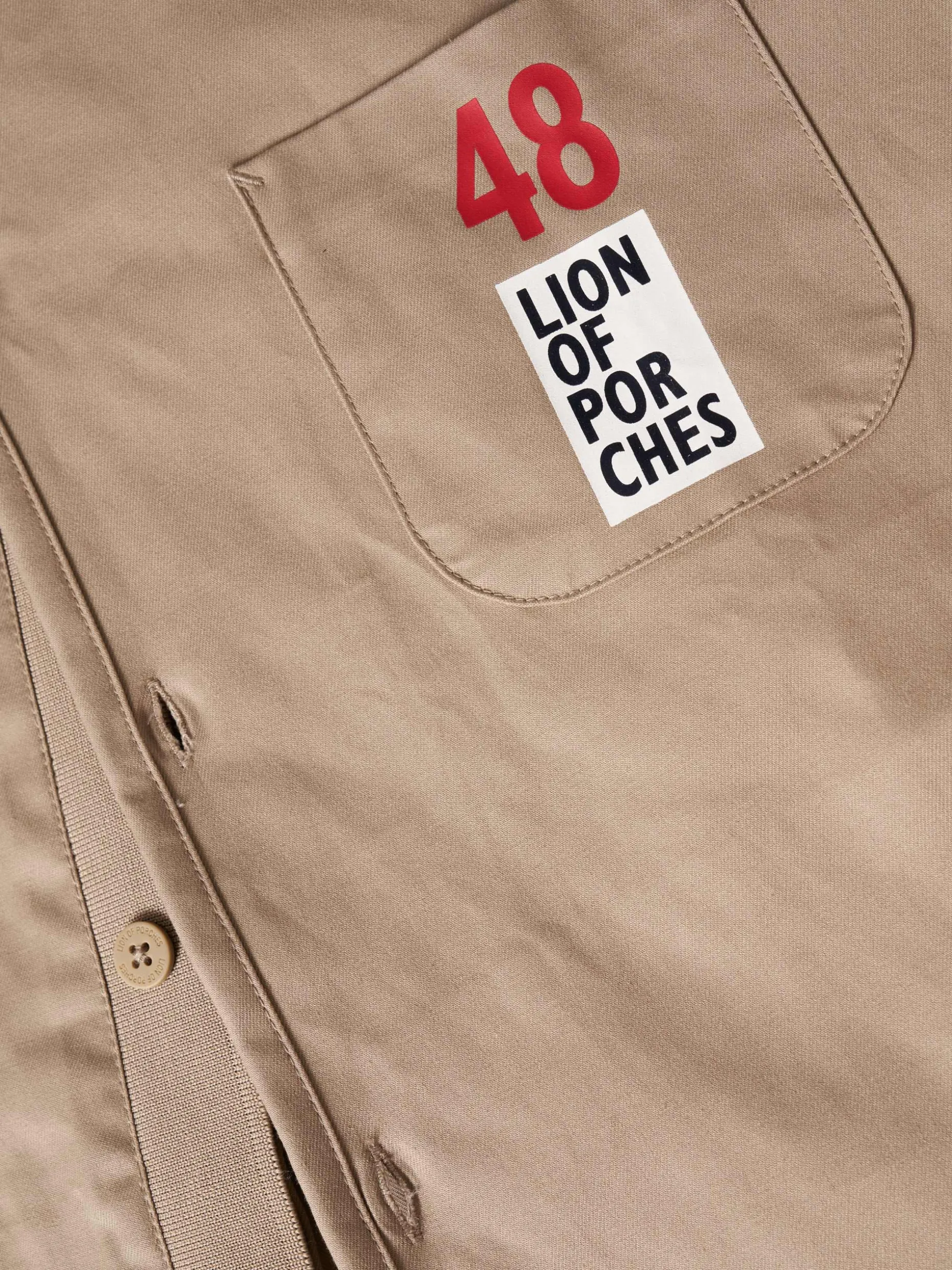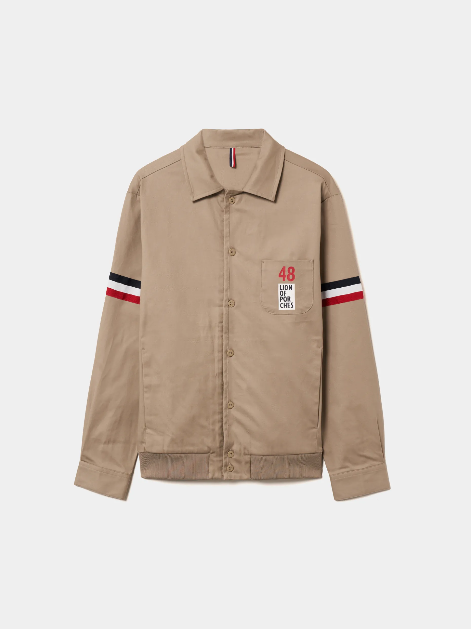 Blusão Regular Fit. Confecionado em algodão e lycra. Sem forro. Aperta com botões na frente. Bolso de chapa no peito com estampado “Lion Of Porches”. Dois bolsos laterais. Fita tricolor aplicada nas mangas. Cós em malha canelada.