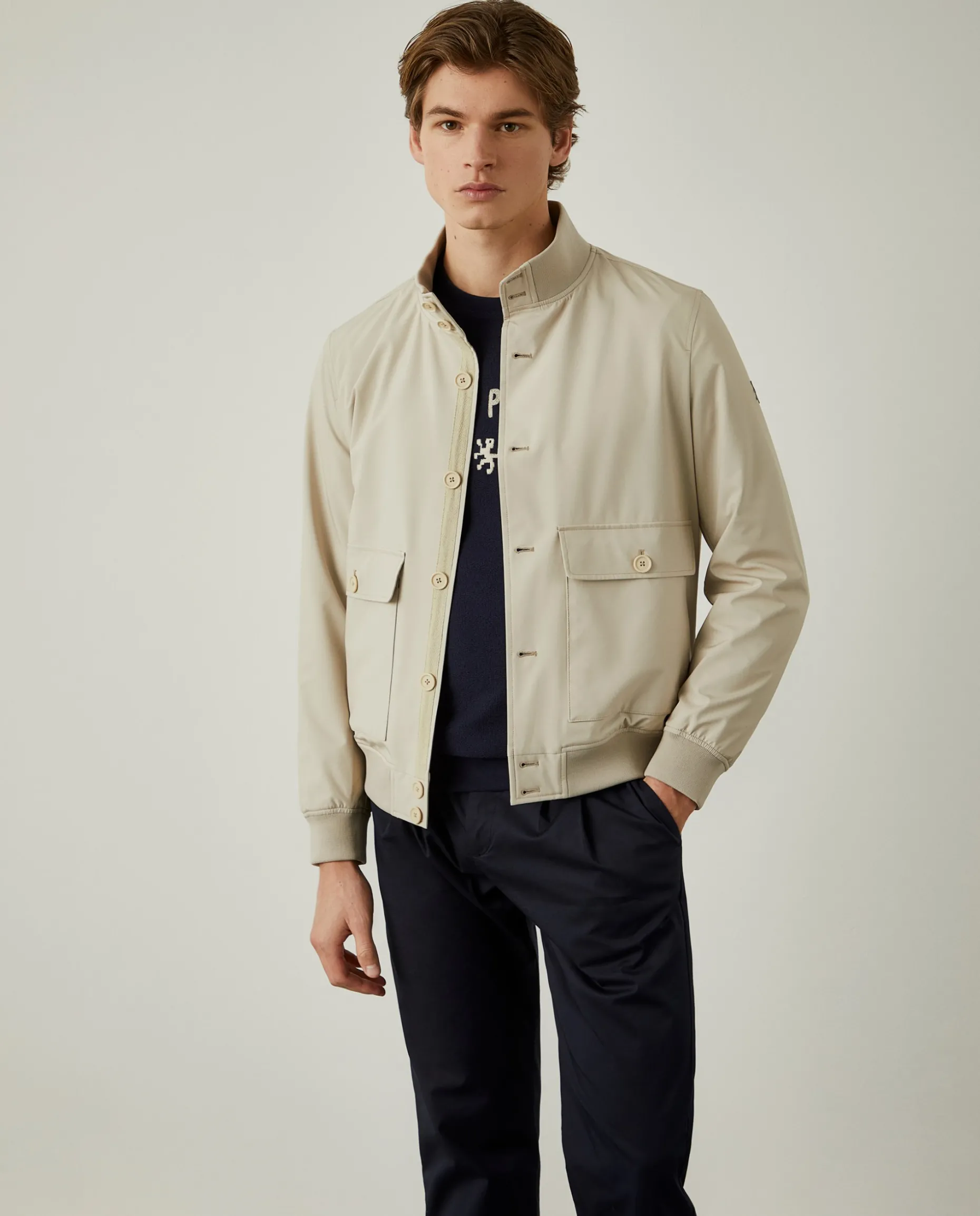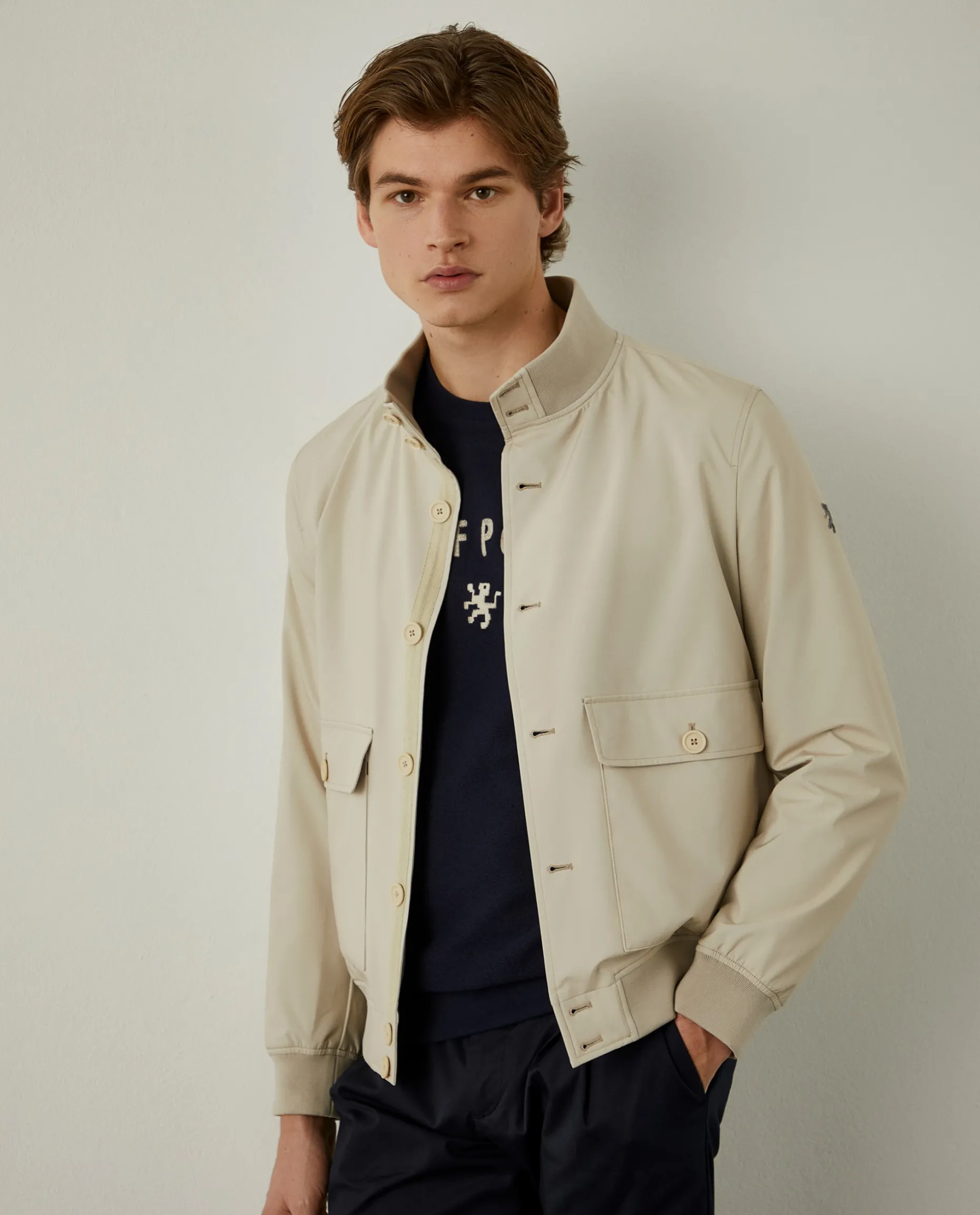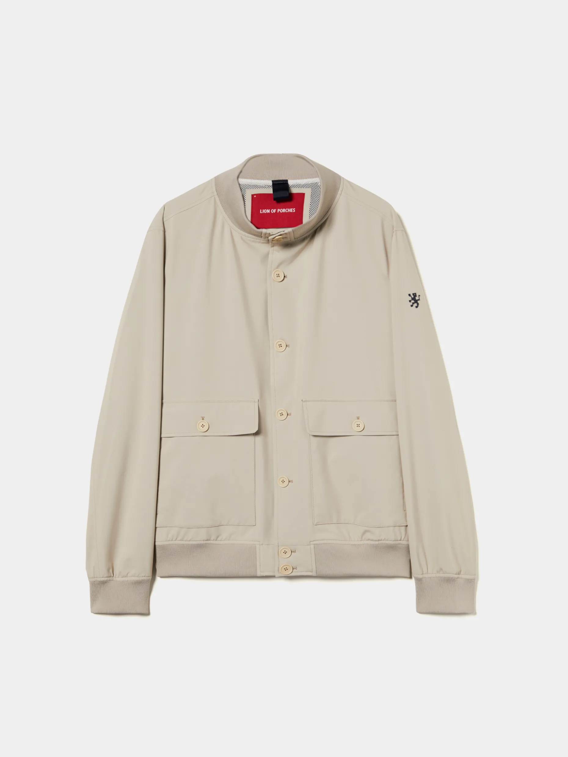 Blusão em tecido técnico com gola subida. Aperta com botões ao tom e conta com dois bolsos de chapa com pala na frente, que fecham também com botões. A gola, punhos e base são em malha canelada. Finaliza com emblema Lion of Porches na manga esquerda.