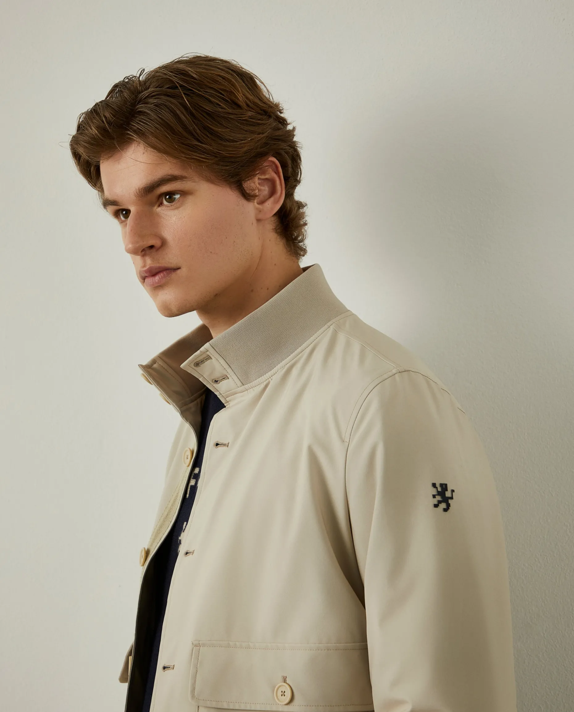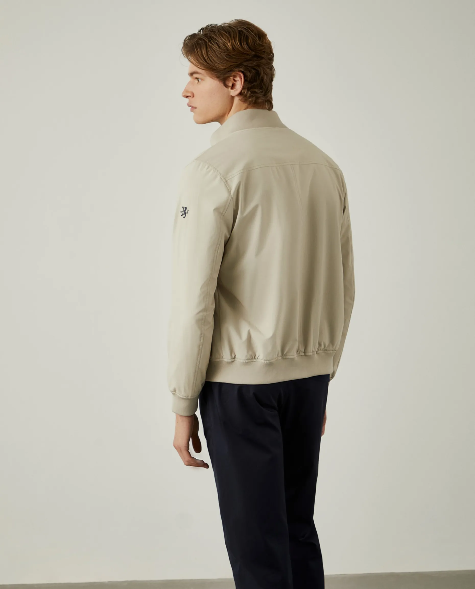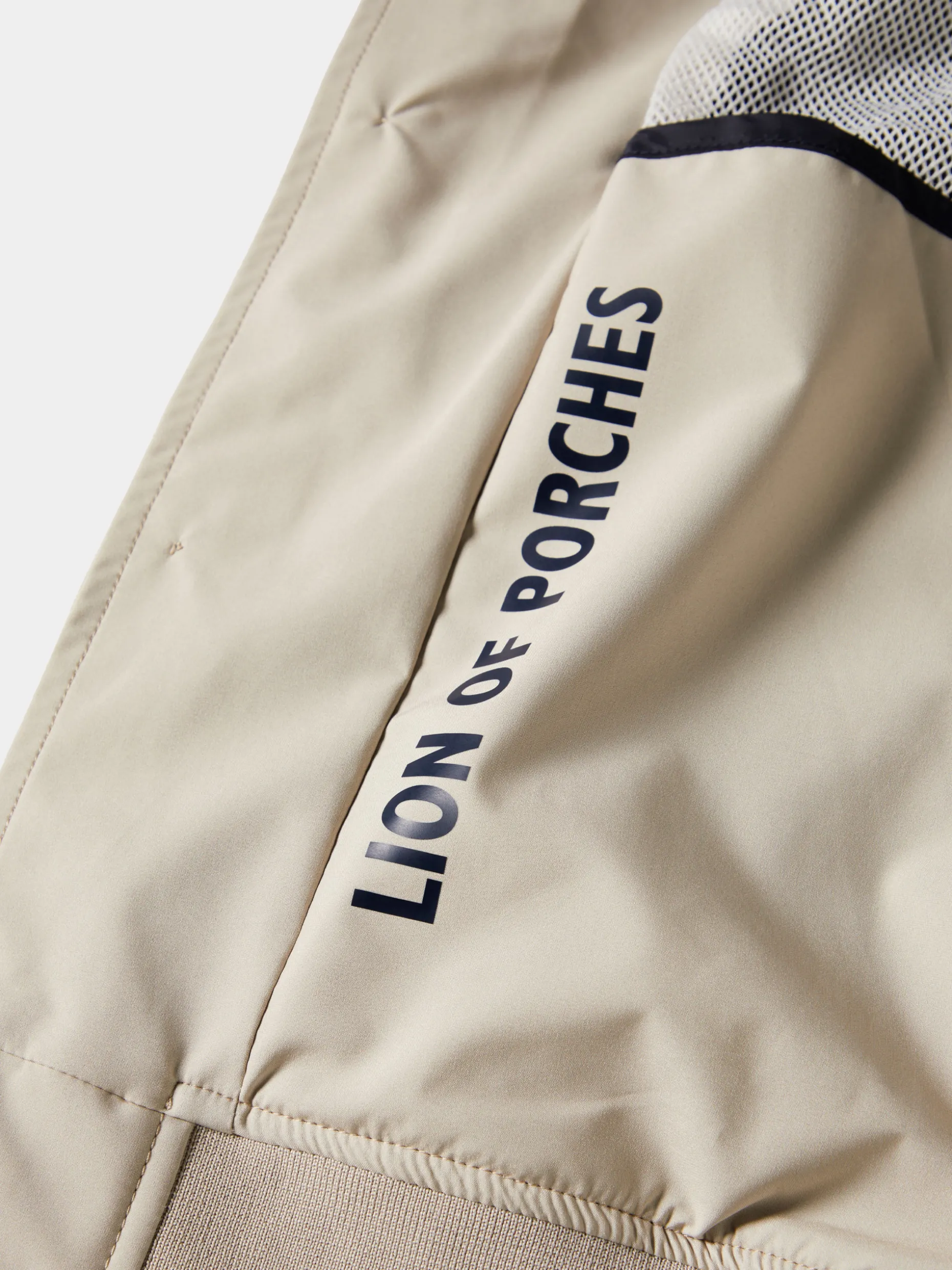 Blusão em tecido técnico com gola subida. Aperta com botões ao tom e conta com dois bolsos de chapa com pala na frente, que fecham também com botões. A gola, punhos e base são em malha canelada. Finaliza com emblema Lion of Porches na manga esquerda.