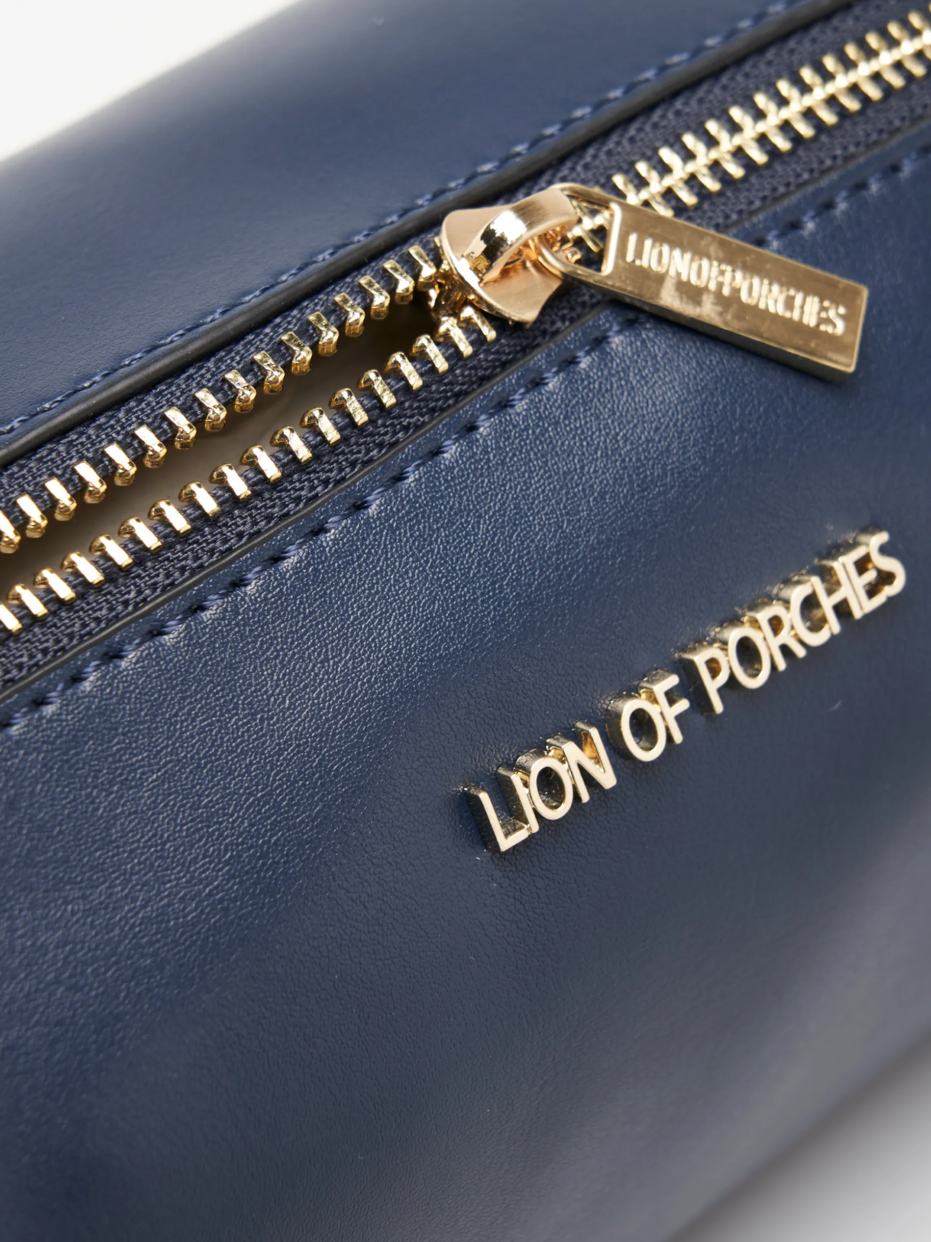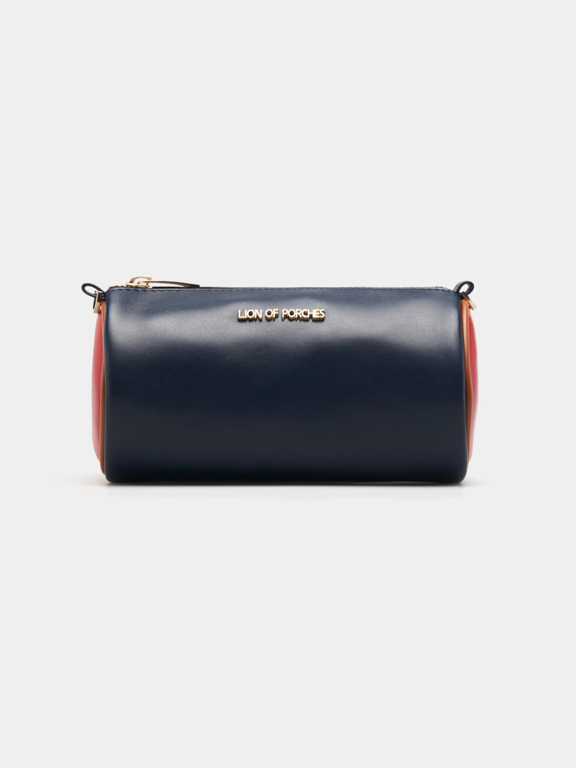 Bolsa/necessaire tricolor de formato cilíndrico. Com alça a tiracolo ajustável e removível. Finaliza com aplicação metálica com logotipo Lion of Porches.