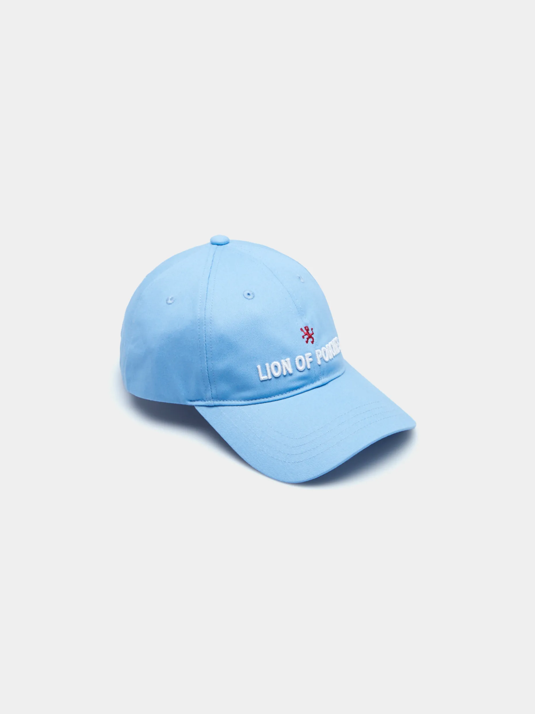 Boné de algodão com pala curva e logotipo Lion of Porches bordado em relevo na frente. Regulador metálico na parte traseira e metal de encaixe final.