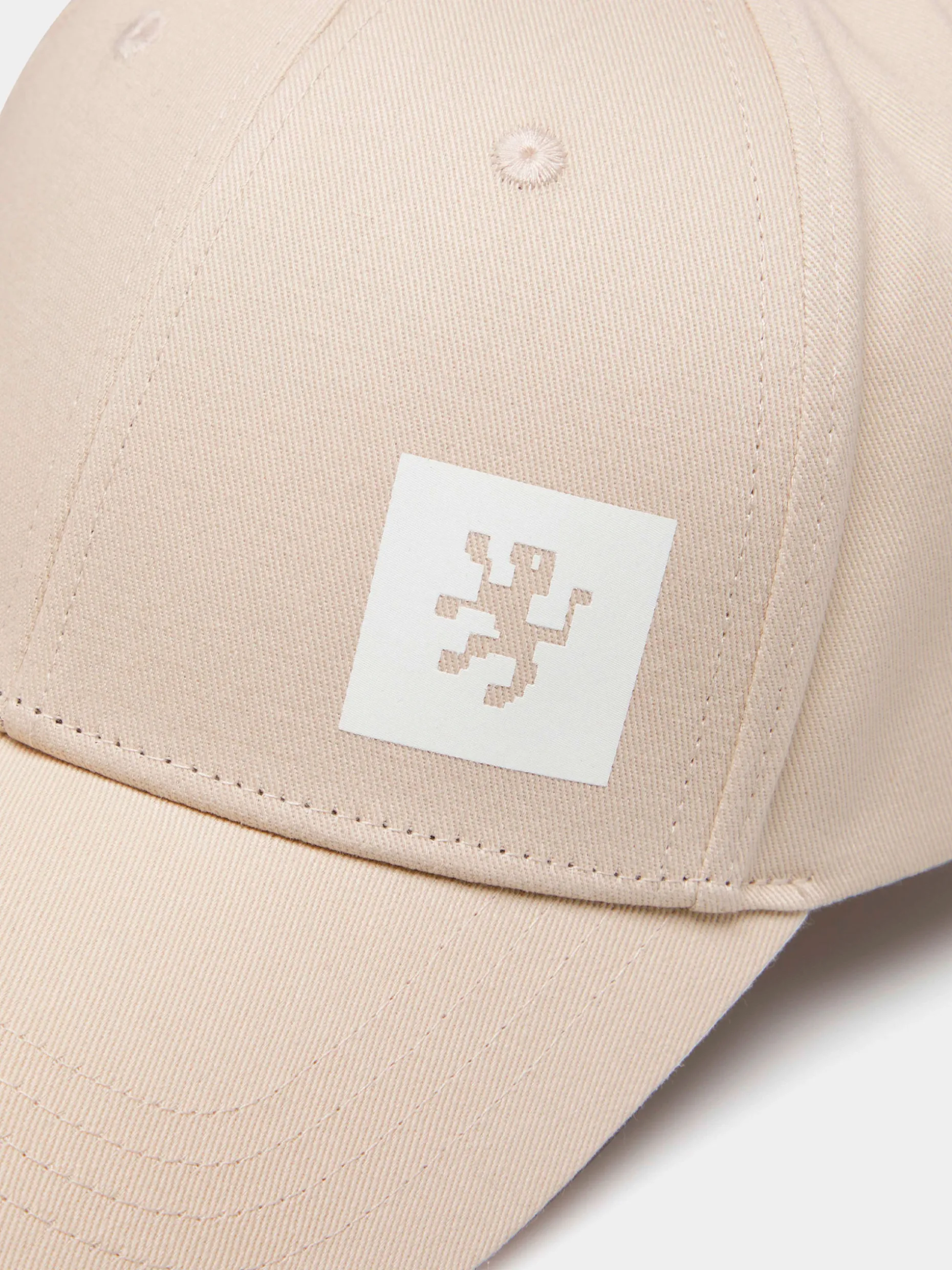 Boné de algodão com pala curva e leão pixelizado da marca em transfer branco aborrachado na frente. Parte traseira com regulador metálico e metal de encaixe.