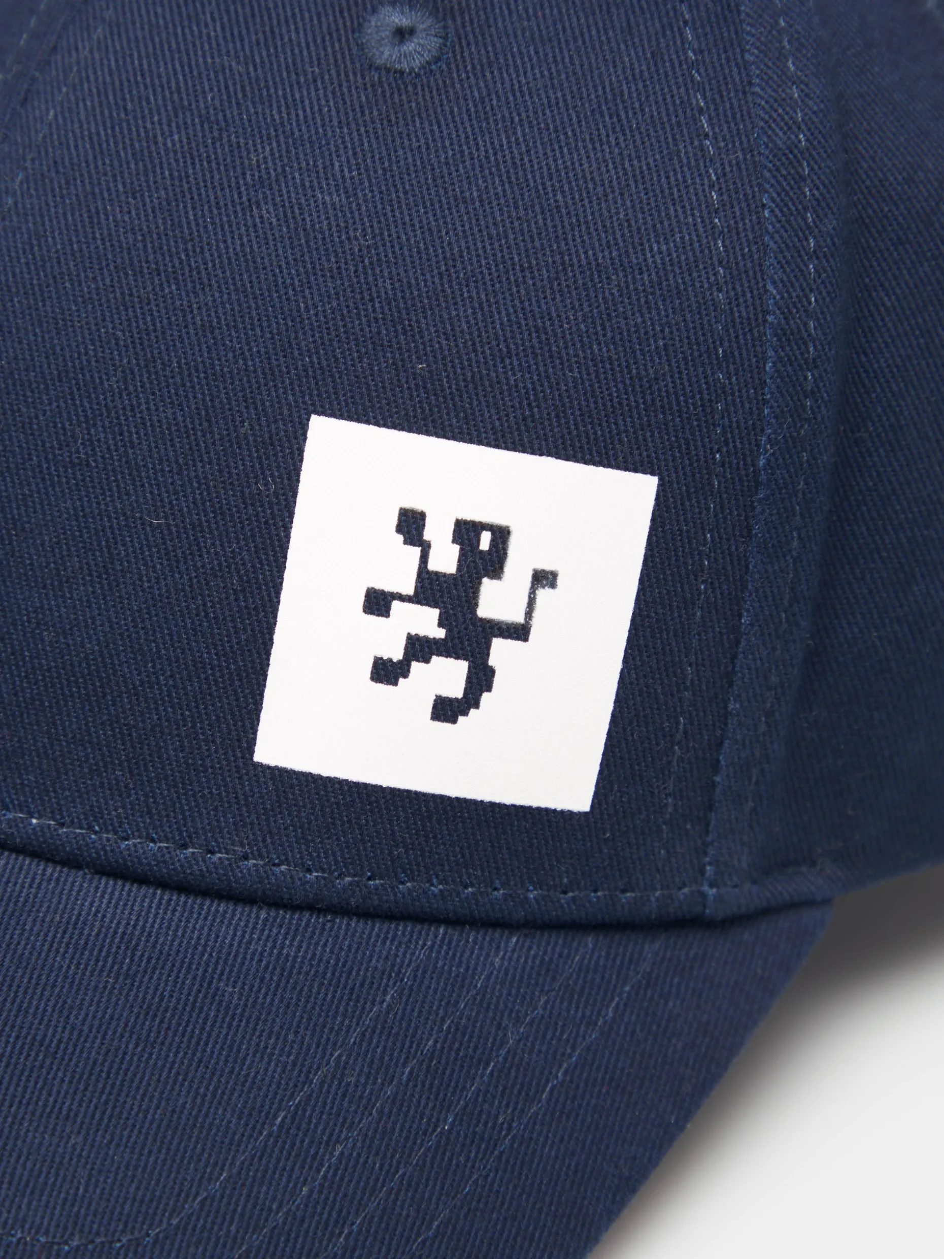 Boné de algodão com pala curva e leão pixelizado da marca estampado em transfer branco aborrachado na frente. Parte traseira com regulador metálico e metal de encaixe.