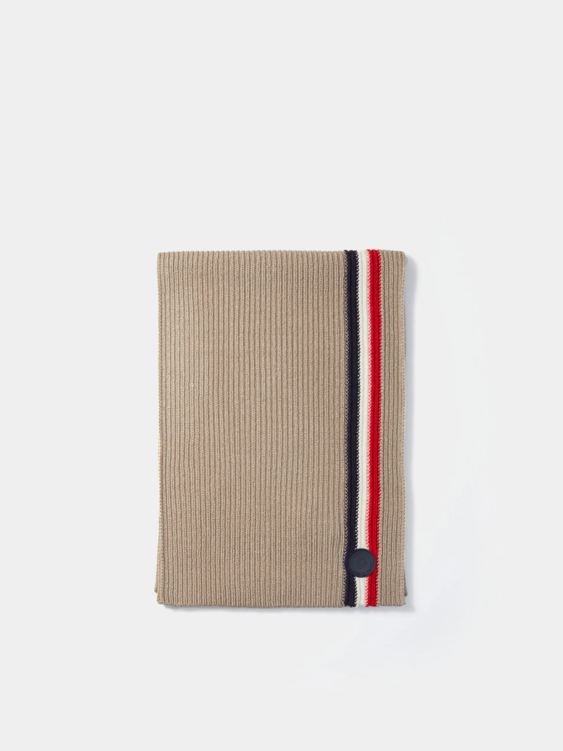 Garanta que os miúdos estão protegidos do frio com este cachecol de malha canelada com riscas tricolor. Finaliza, numa das pontas, com etiqueta de borracha redonda com branding Lion of Porches.