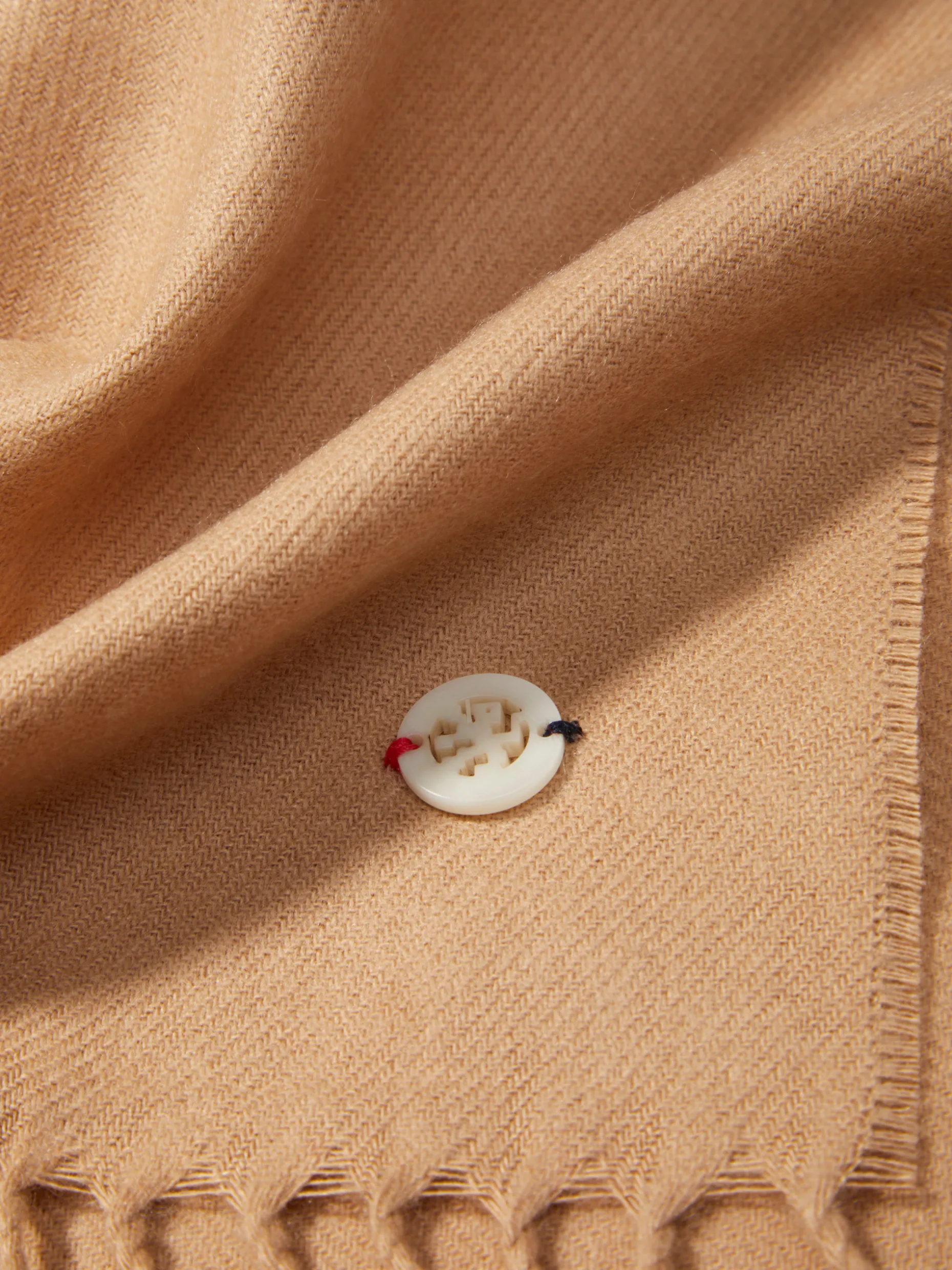 Mantenha as miúdas quentes e confortáveis com este cachecol liso com franjas e placa redonda de leão nas extremidades. Disponível em várias cores.