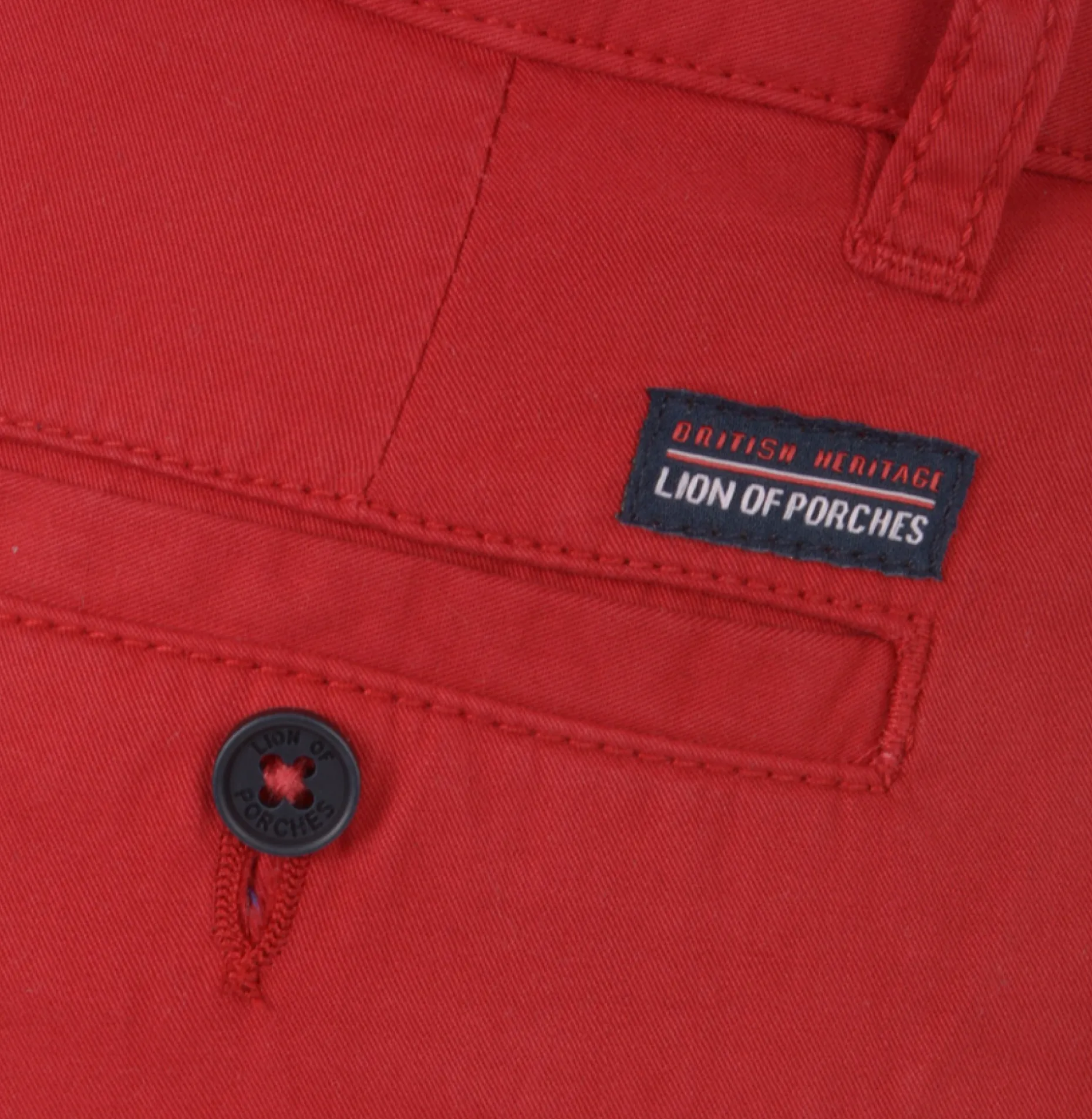 Um toque de classe no estilo dos mais pequenos. Calças chino com bolsos laterais à frente e dois bolsos retos com botão ao centro. Detalhe de etiqueta acima do bolso com a designação Lion of Porches | British Heritage.
