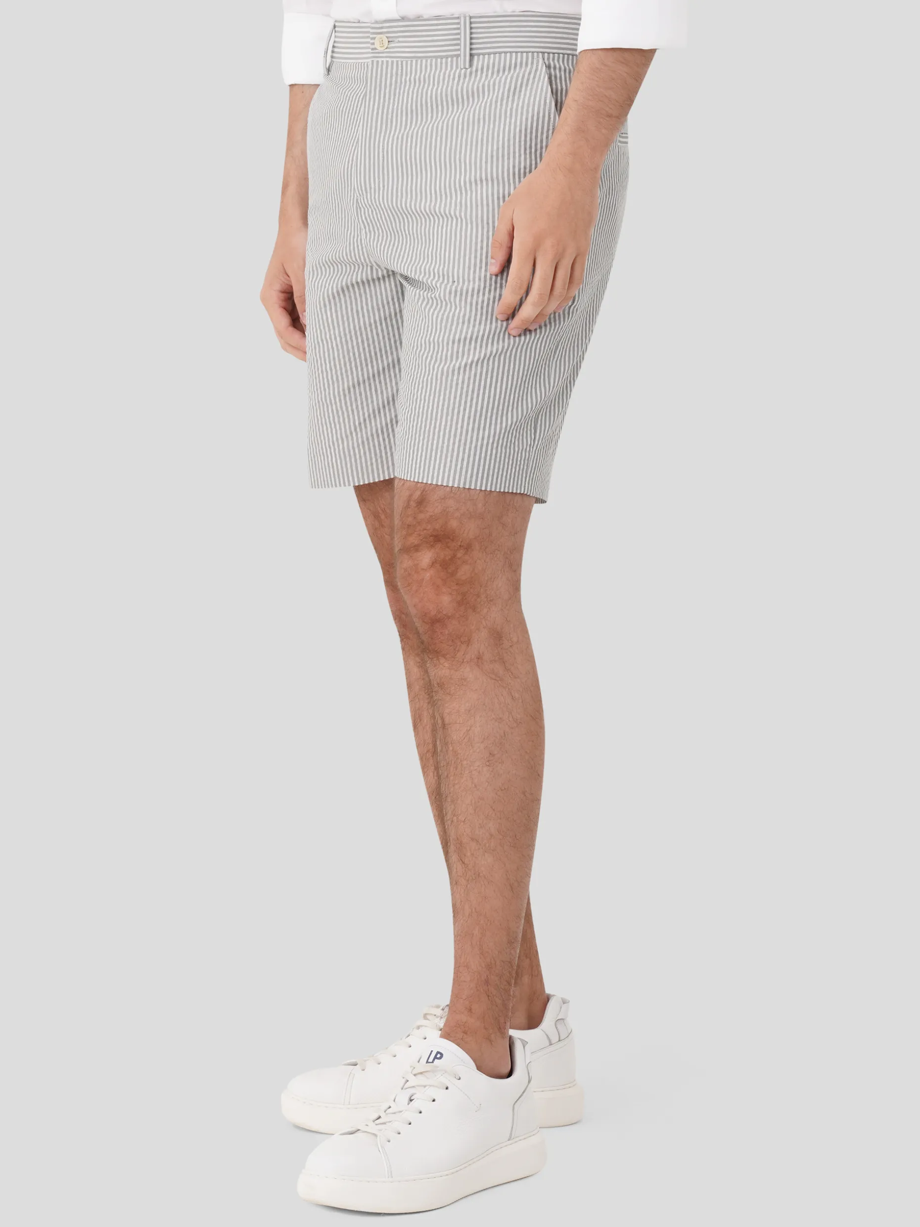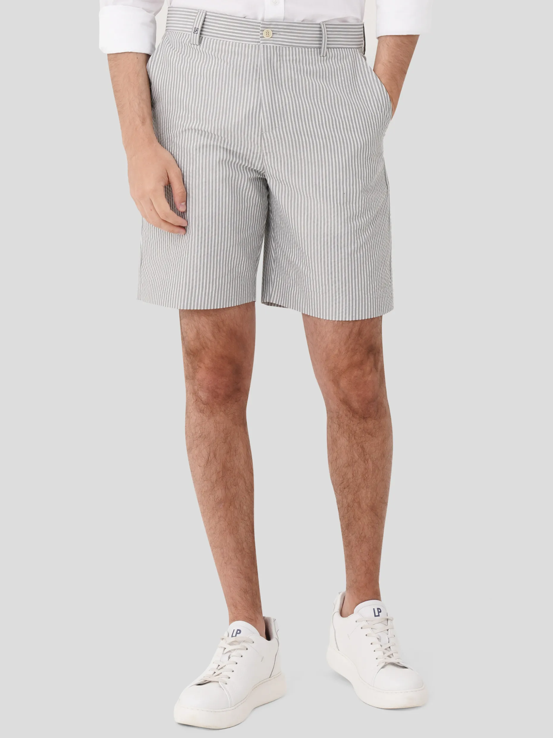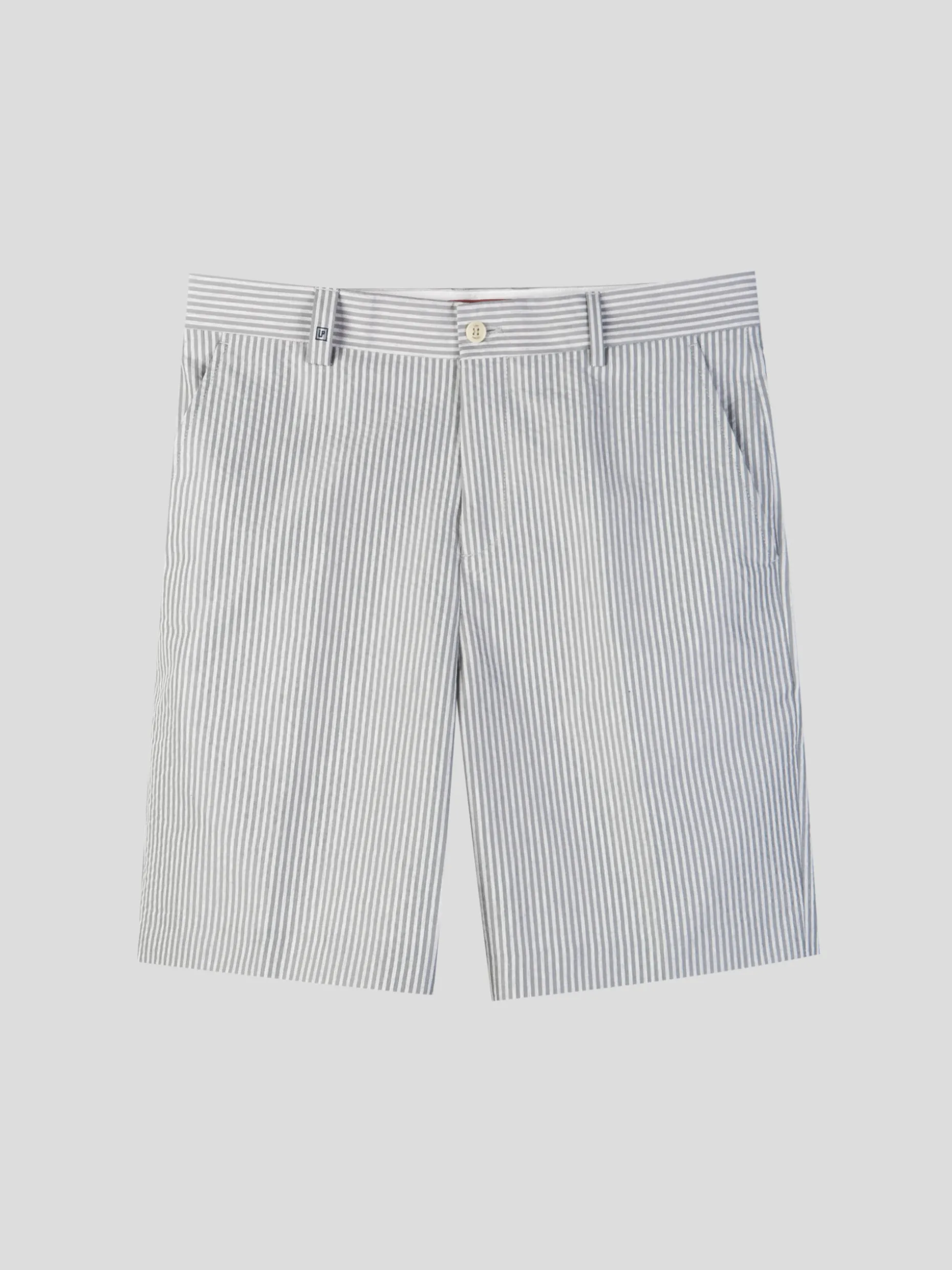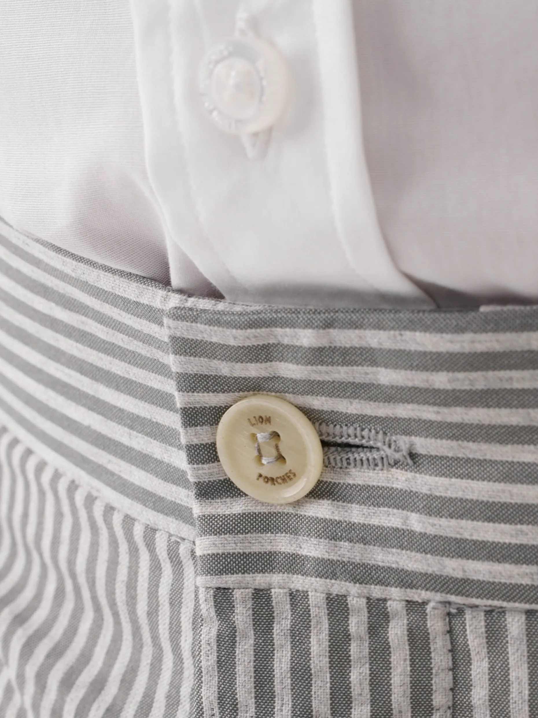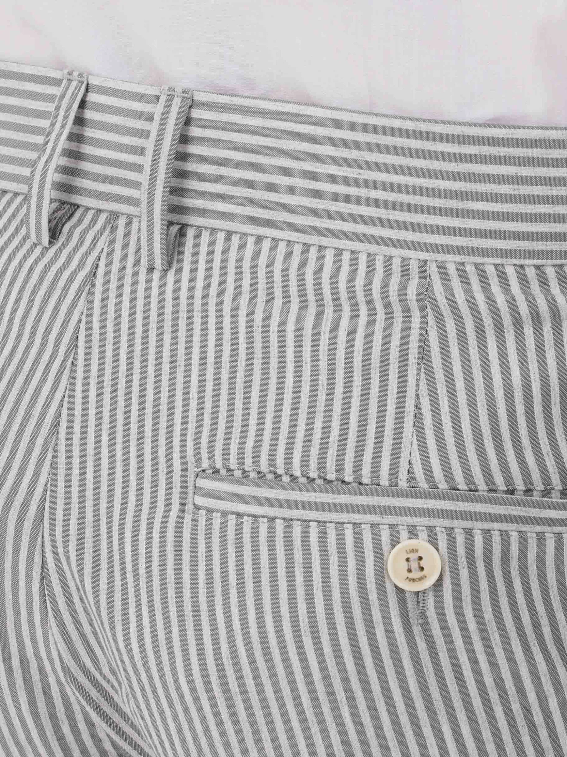 Bermudas em tecido de riscas. Bolsos laterais. Dois bolsos retos atrás com botão. Personalizadas com pequeno bordado quadrado “LP” na presilha e detalhes tricolores no interior do cinto.