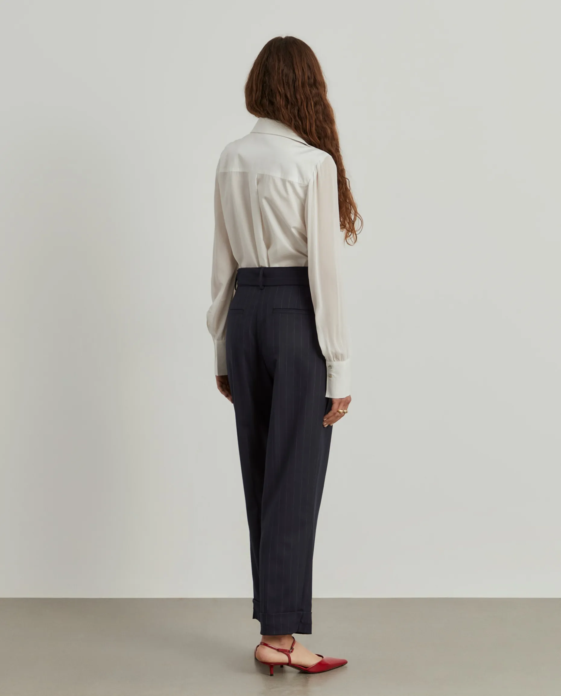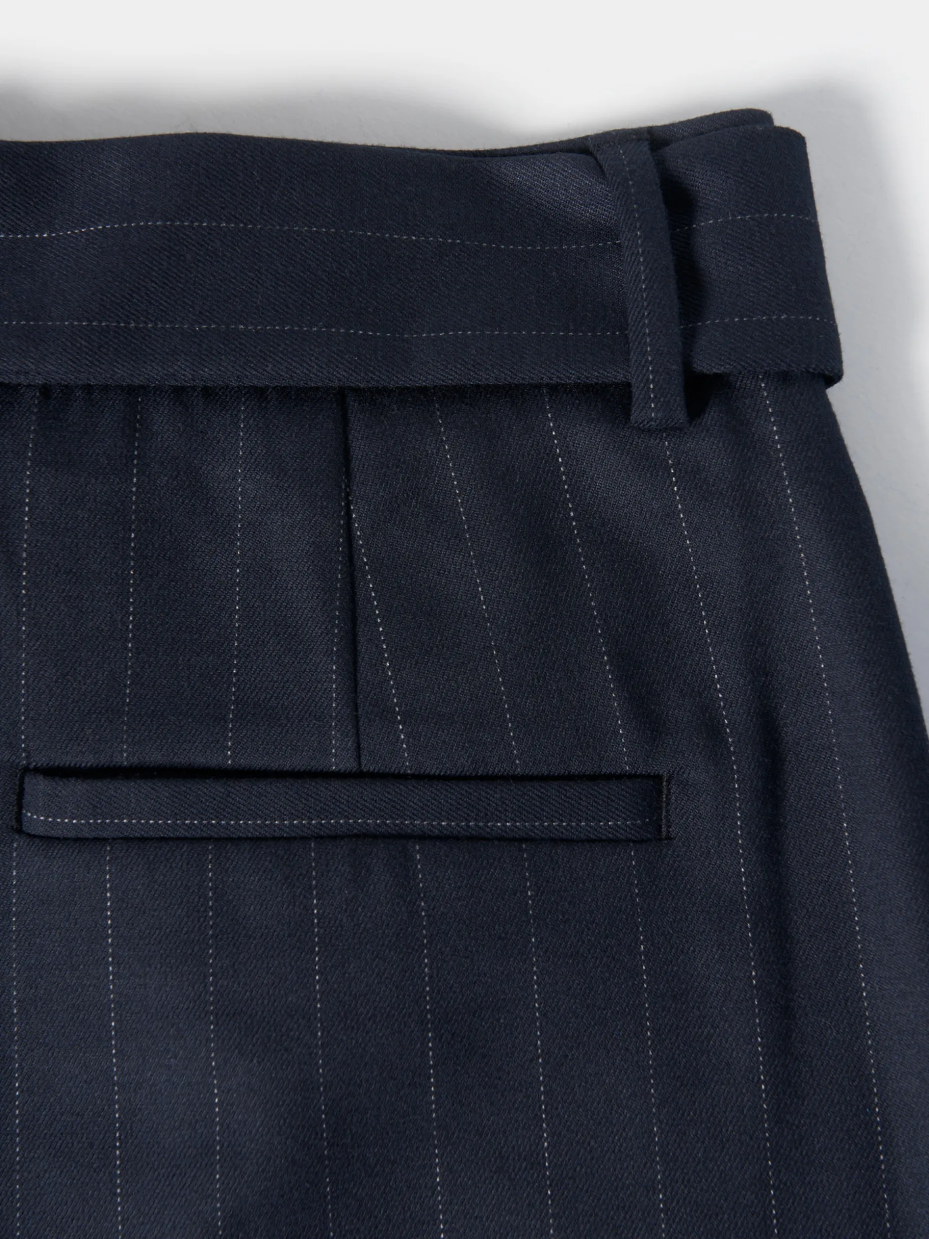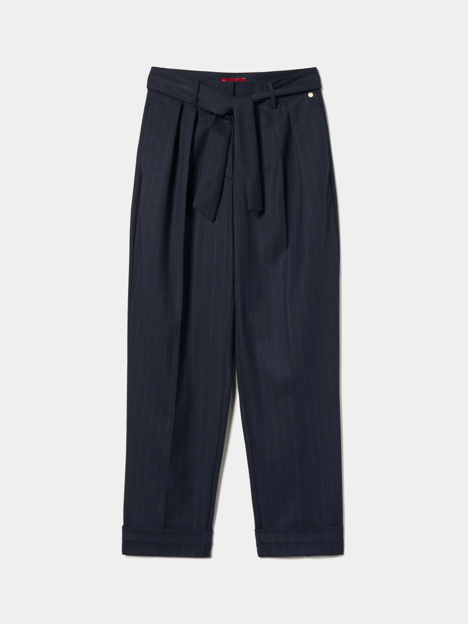 Versáteis e elegantes, estas calças com prega têm um padrão subtil de finas riscas verticais. Apertam com fecho de correr e guto ocultos por carcela e tem ainda um cinto removível, no mesmo tom e tecido, para ajustar a gosto. Com bolsos laterais e traseiros, e dobra no fundo da perna.