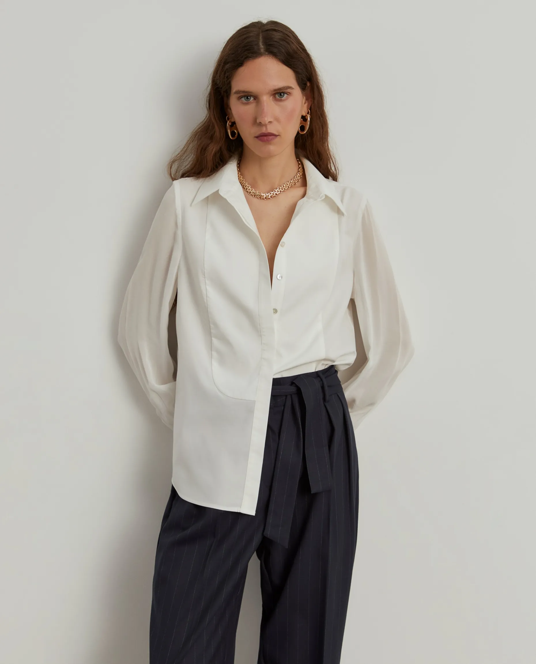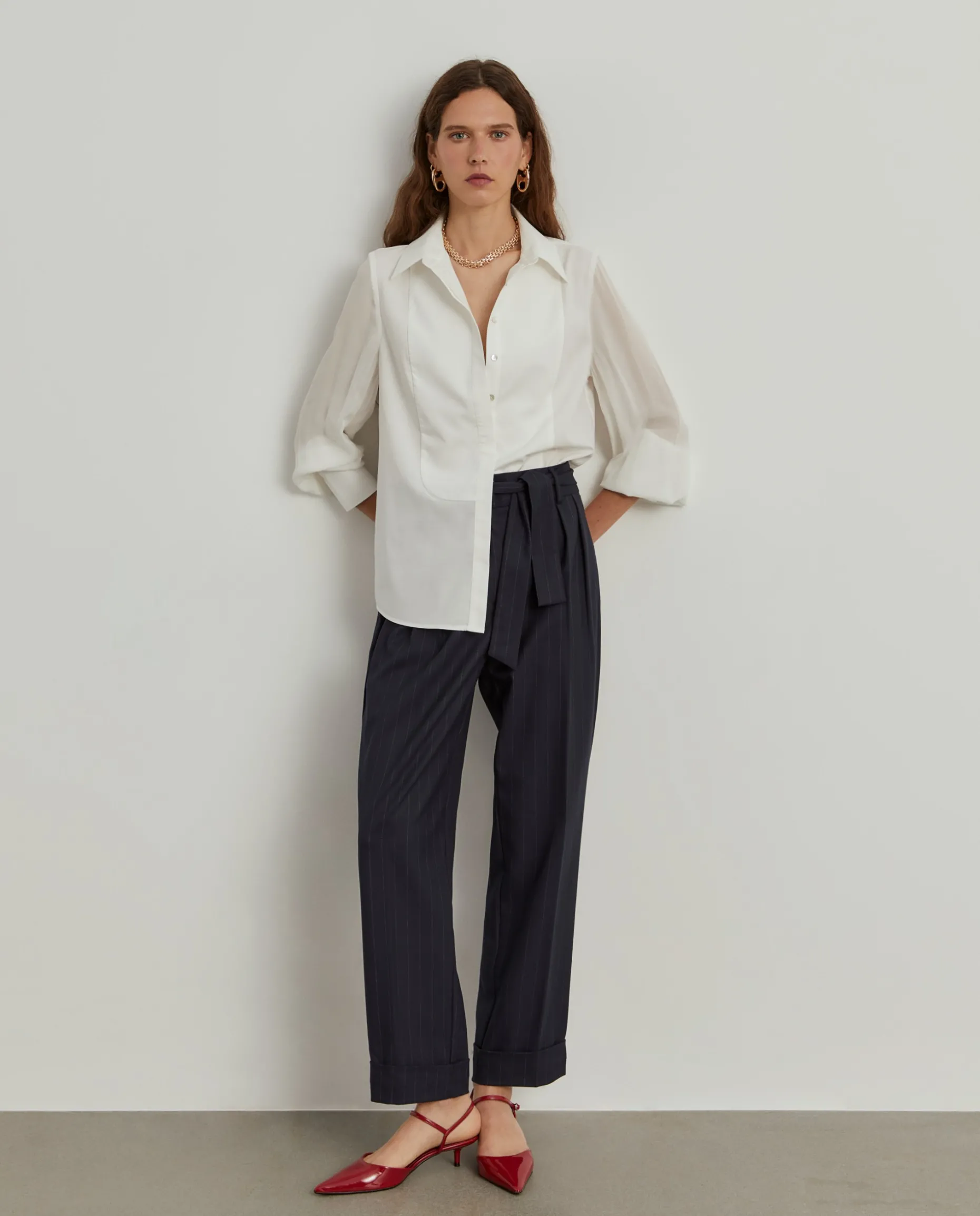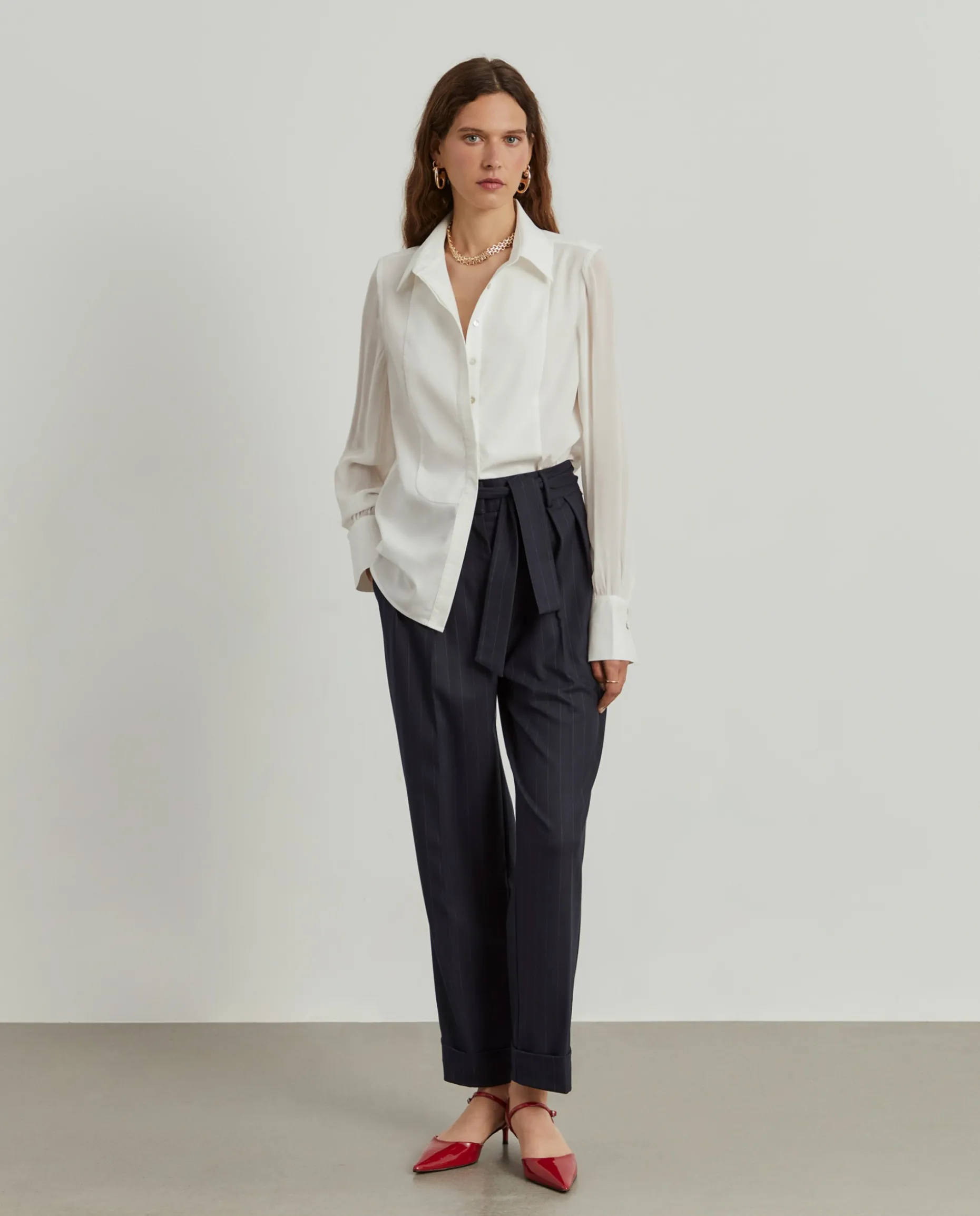 Versáteis e elegantes, estas calças com prega têm um padrão subtil de finas riscas verticais. Apertam com fecho de correr e guto ocultos por carcela e tem ainda um cinto removível, no mesmo tom e tecido, para ajustar a gosto. Com bolsos laterais e traseiros, e dobra no fundo da perna.