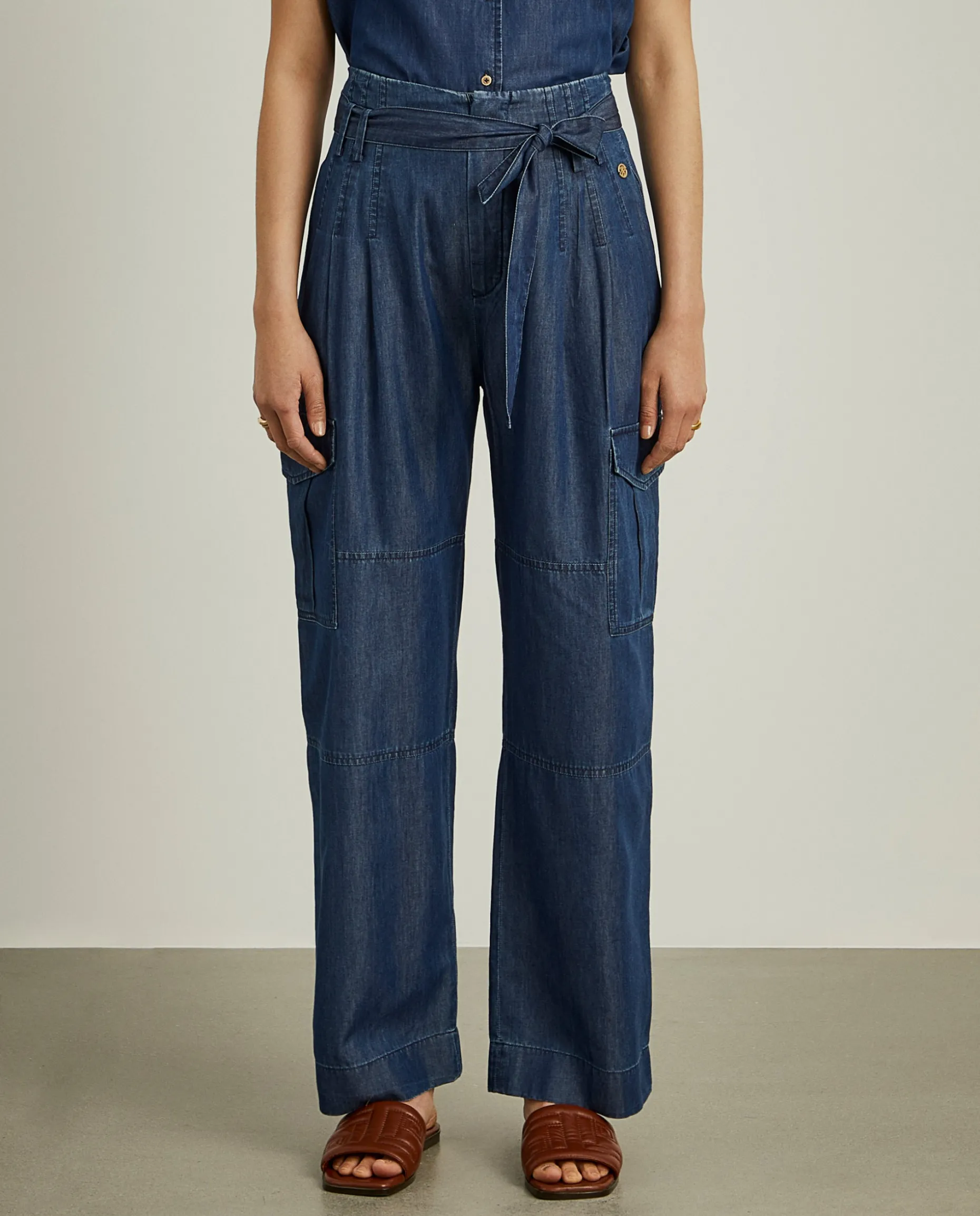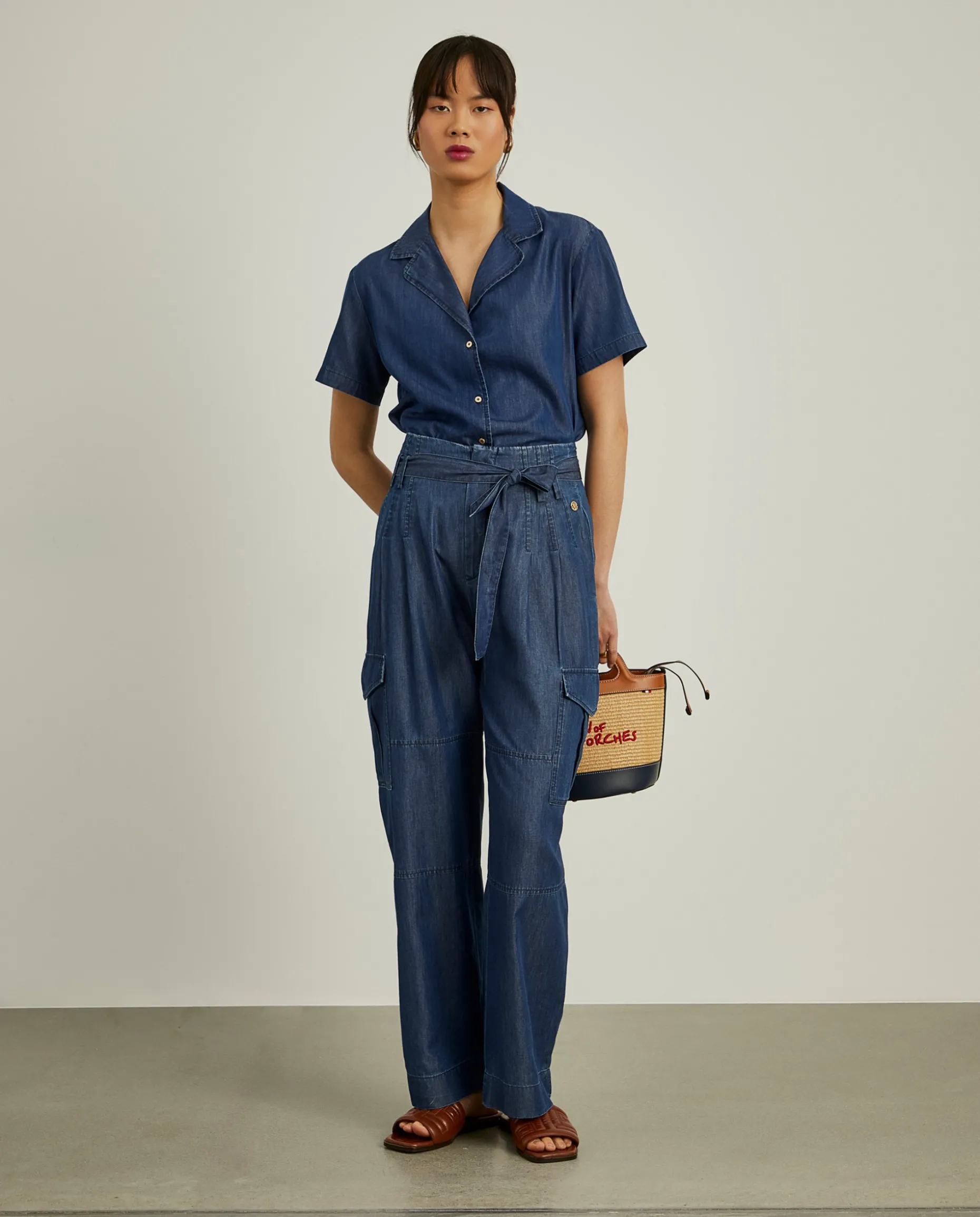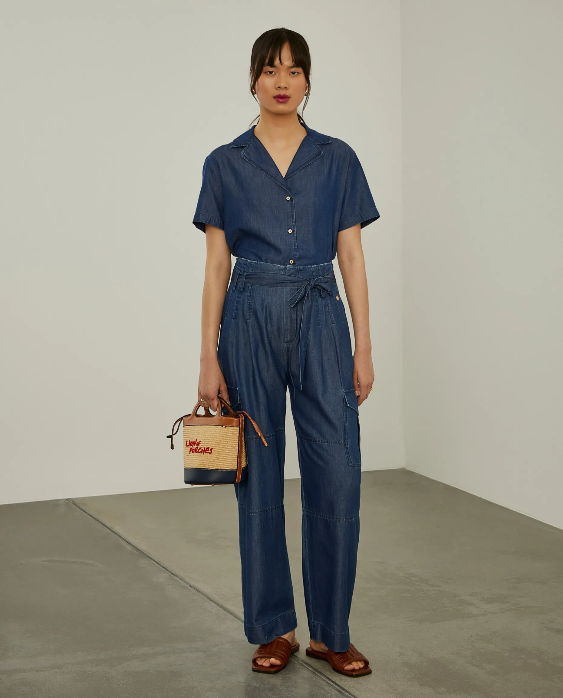 Calças cargo, de cintura subida, e com pregas na frente. Perfeitas para um look leve e descontraído, com cinto no mesmo tecido e tom para dar laçada. Para um total look, veja também a camisa de manga curta, da mesma coleção.