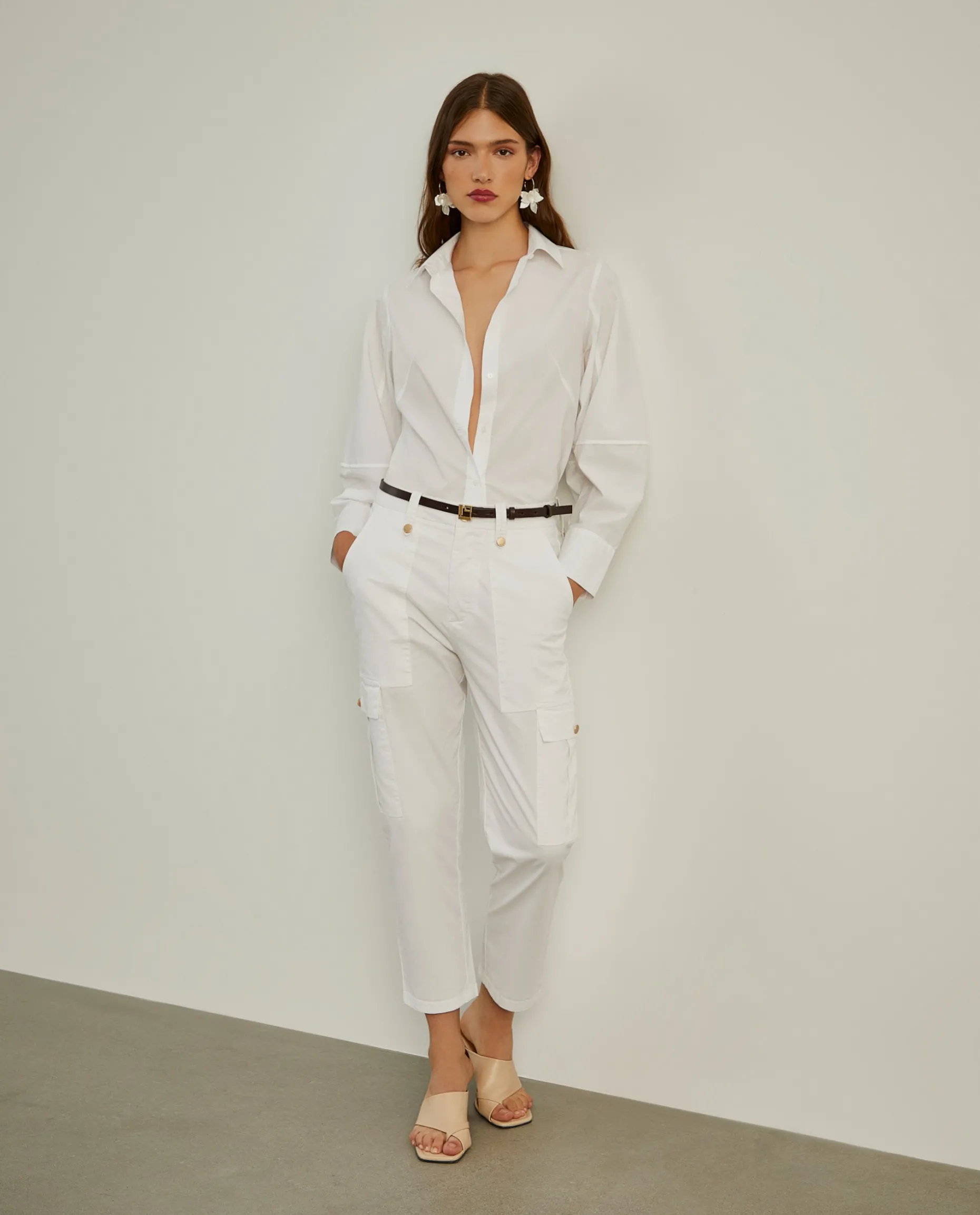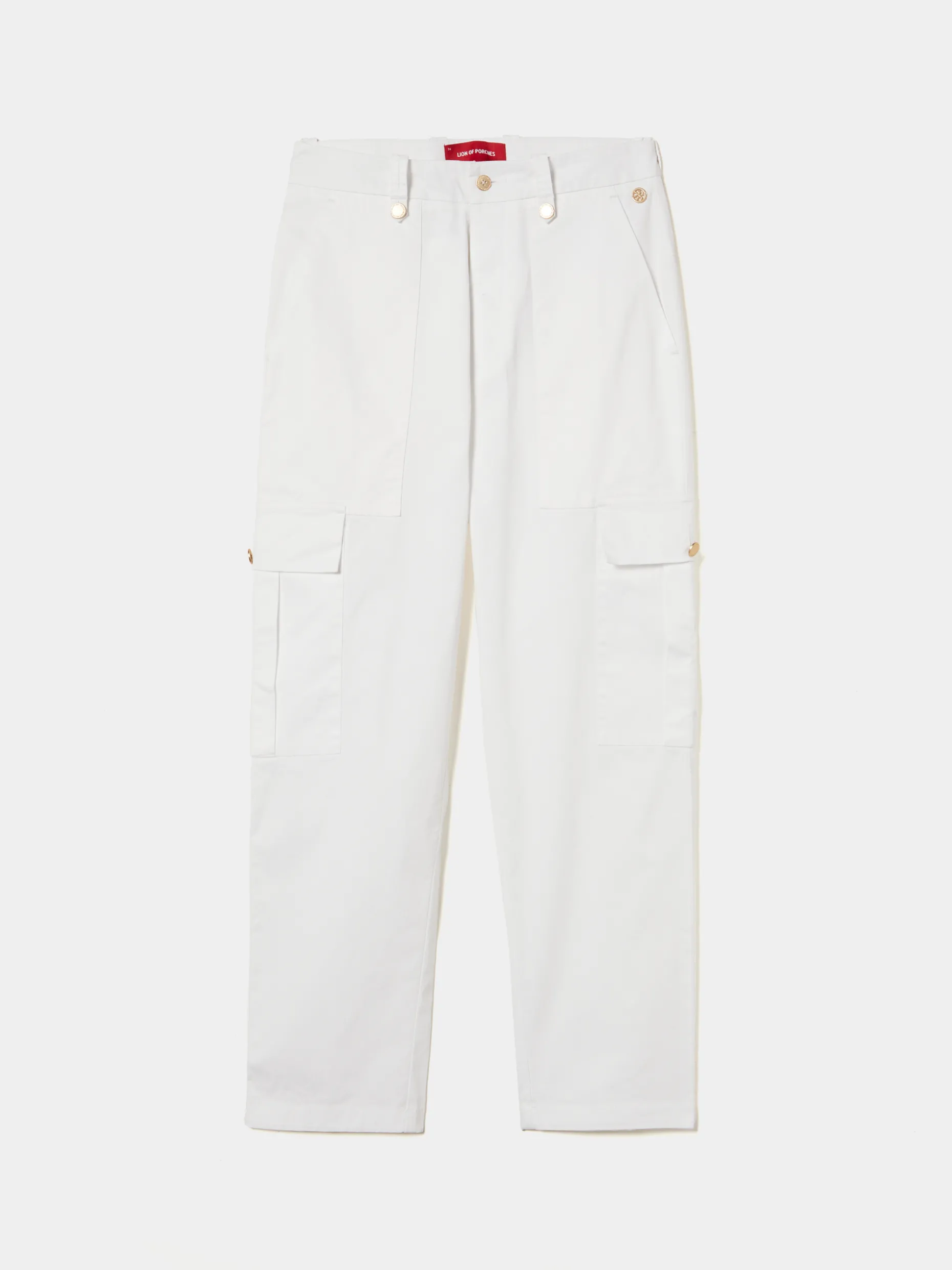 Calças cargo, de fit regular. Apertam com botão dourado e fecho de correr oculto por carcela. Além dos bolsos laterais típicos das calças cargo, têm também dois bolsos frontais e outros dois traseiros. São confecionadas em algodão com uma pequena percentagem de elastano para maior conforto e liberdade de movimentos.