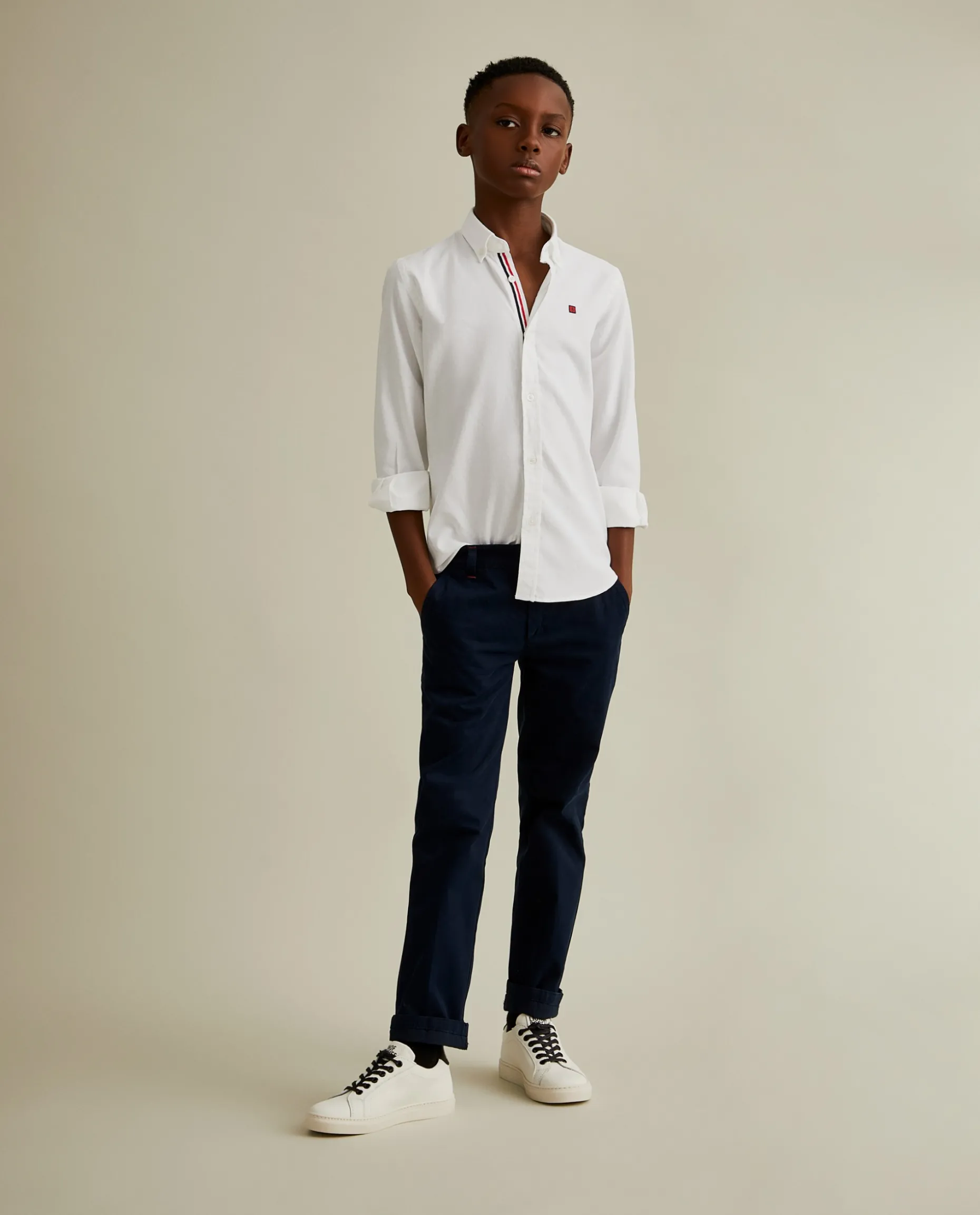 Calças chino, regular fit, em sarja. Apertam com fecho zíper e botão personalizado. Pormenor de fita corporativa tricolor, de lado, na cintura. Dois bolsos laterais. Costuras com cor em contraste.