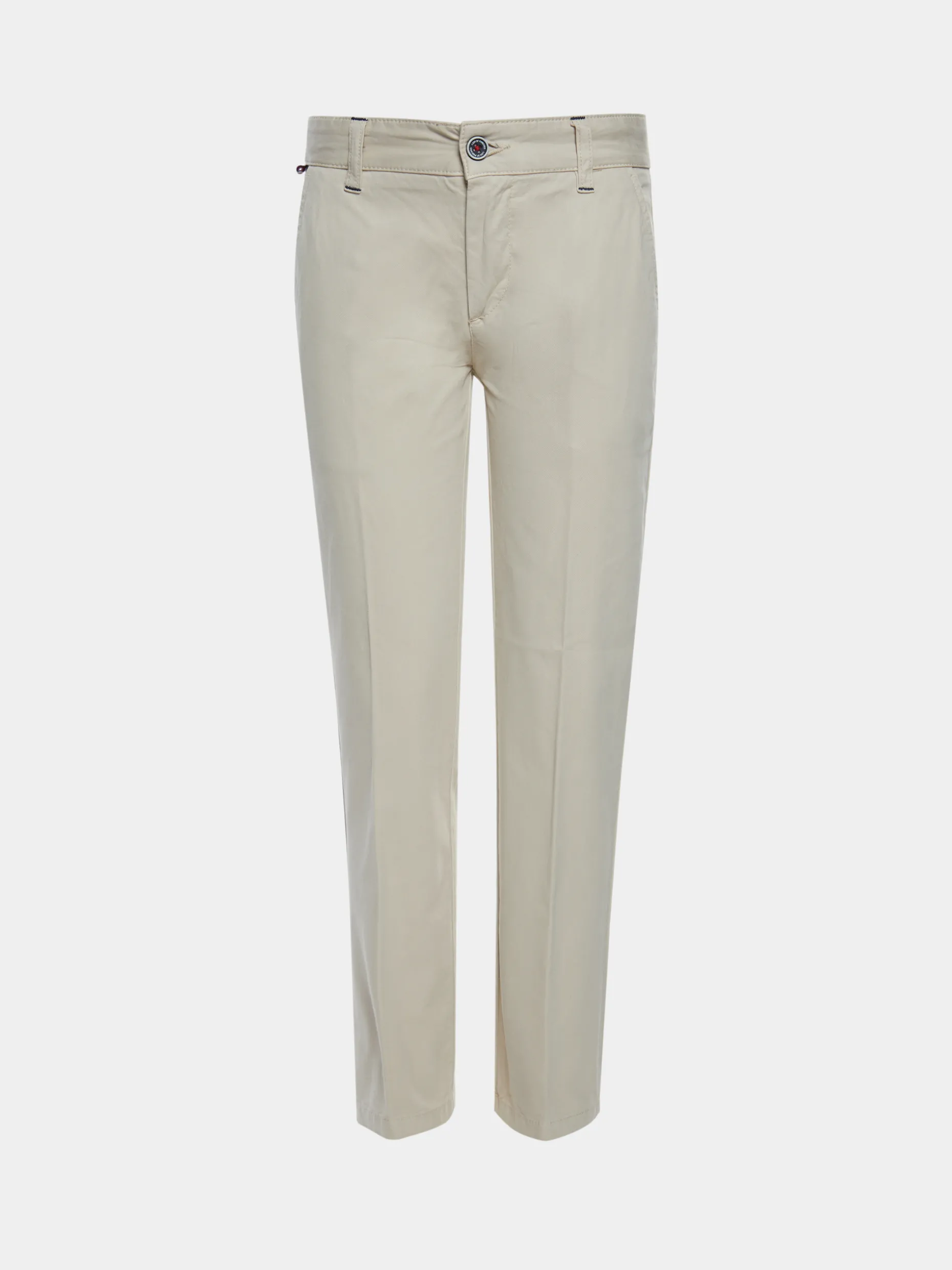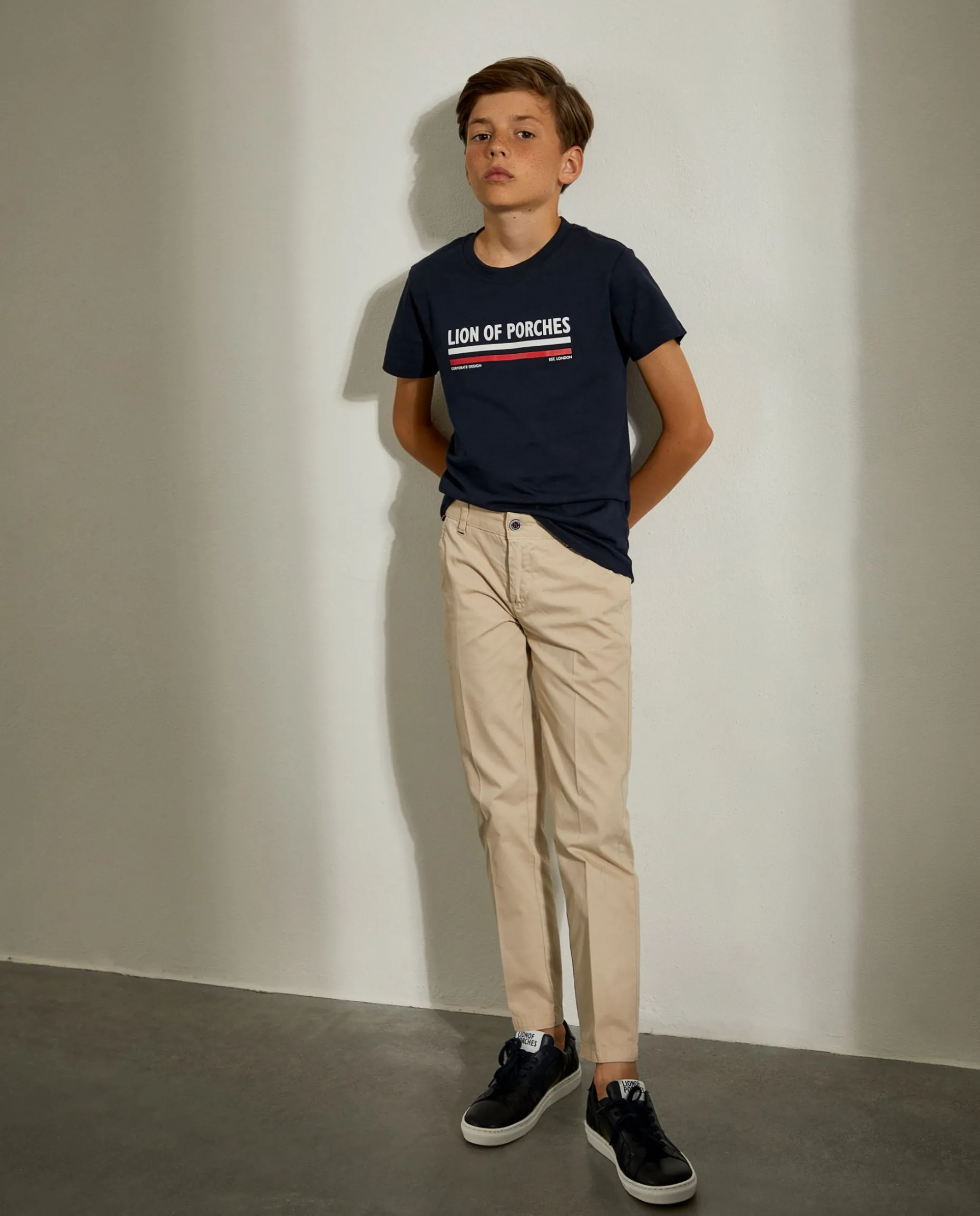 Calças chino, regular fit, em sarja. Apertam com fecho zíper e botão personalizado. Pormenor de fita tricolor, de lado, na cintura. Dois bolsos laterais. Costuras com cor em contraste.