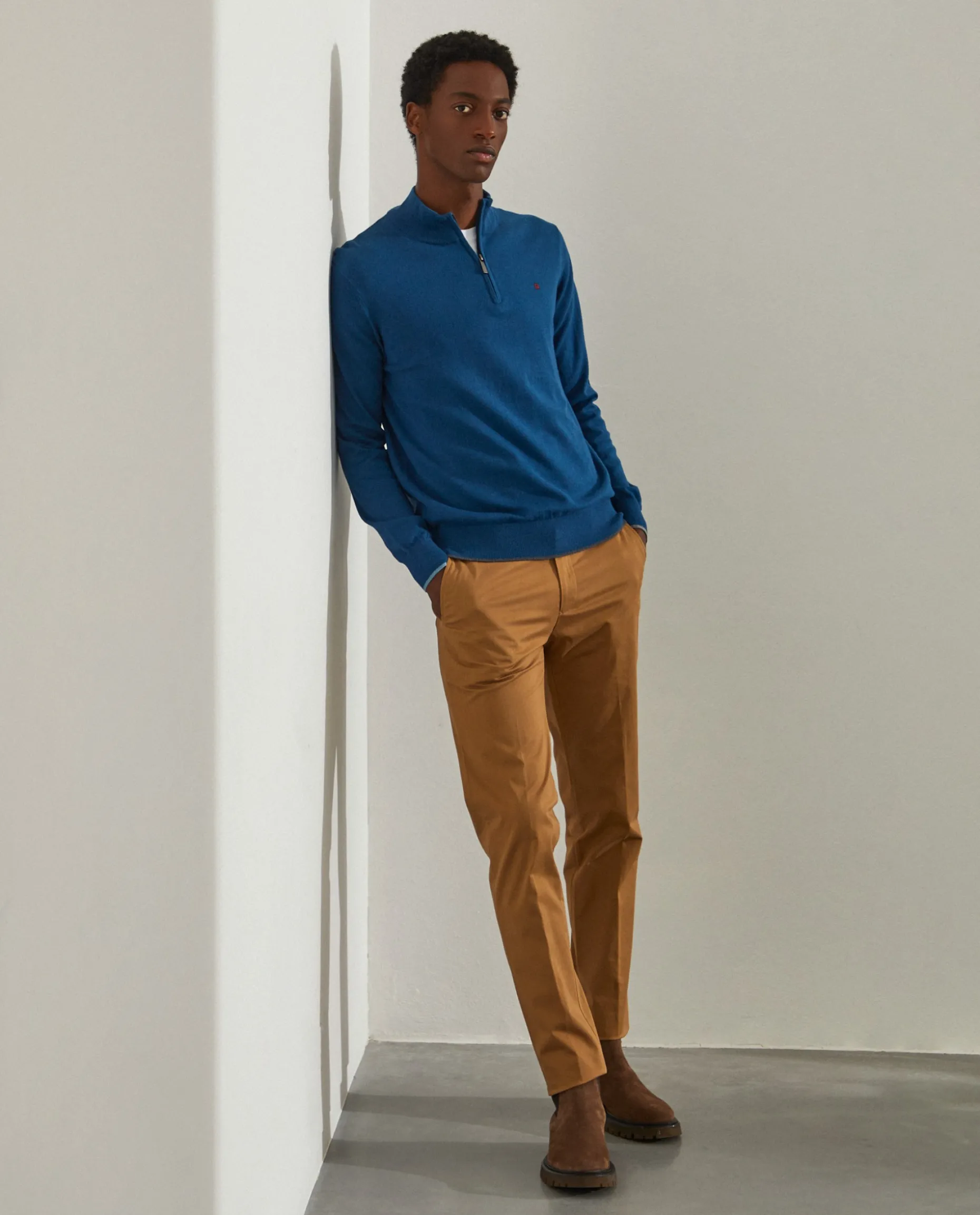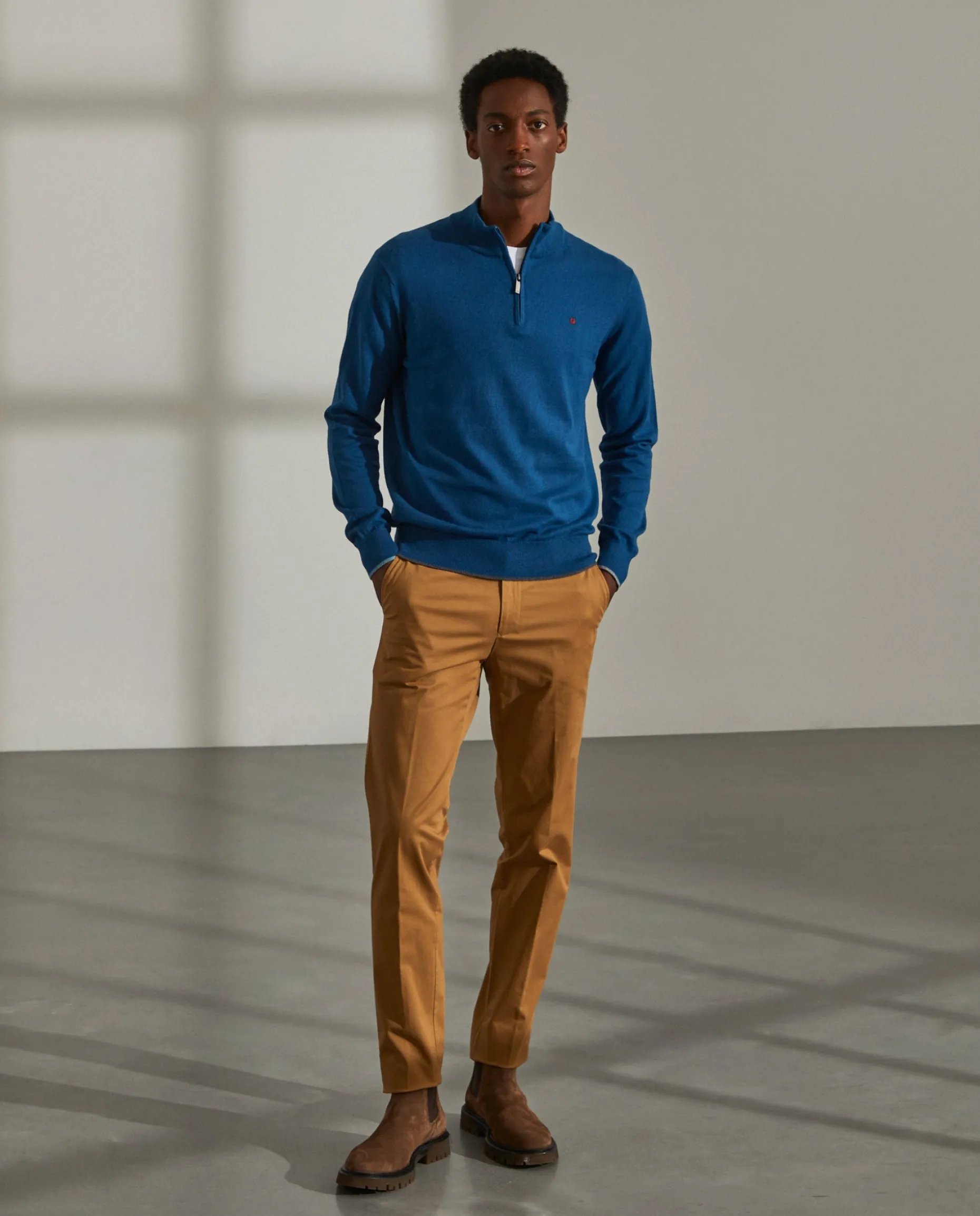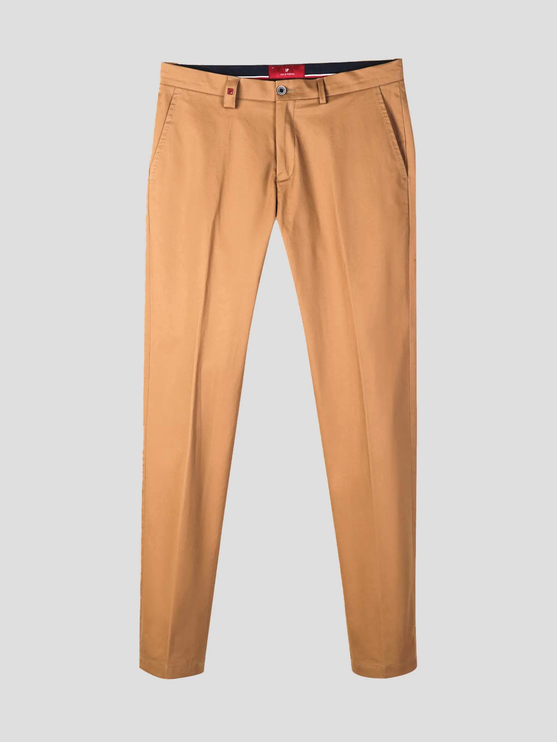 Calça chino sport com corte slim fit. Bolsos laterais. Dois bolsos retos atrás com botão. Personalizadas com pequeno bordado na presilha. e detalhes tricolores no bolso traseiro, costura lateral e interior do cinto.