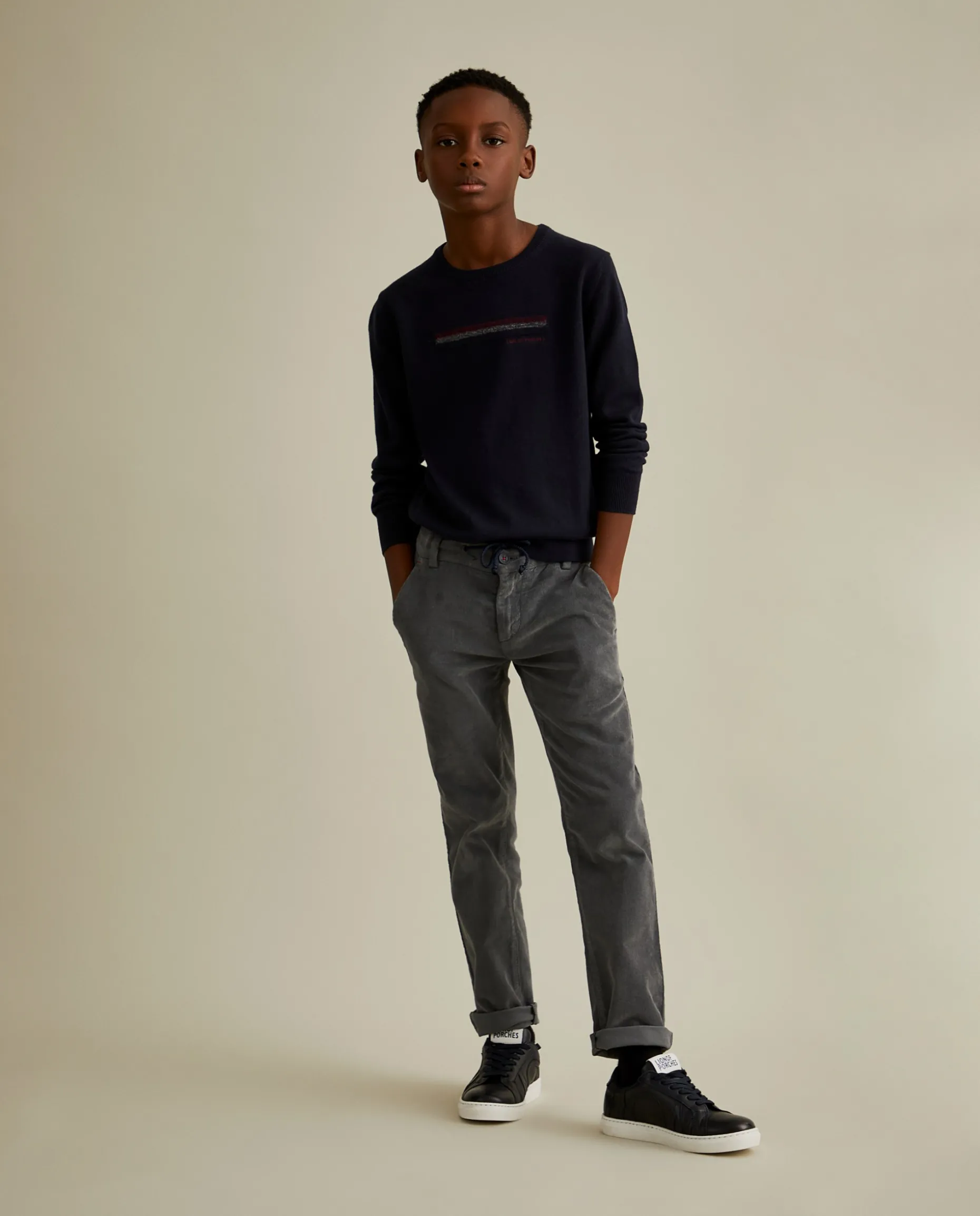 Calças chino confecionadas em bombazina stretch para um look de inverno quente e confortável. Apertam na cintura com botão, fecho de correr e cordão ao tom. Finalizam com bolsos laterais e traseiros.