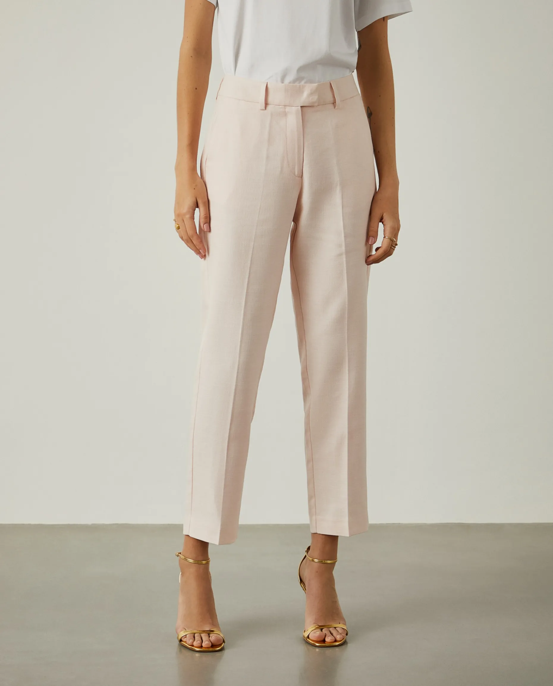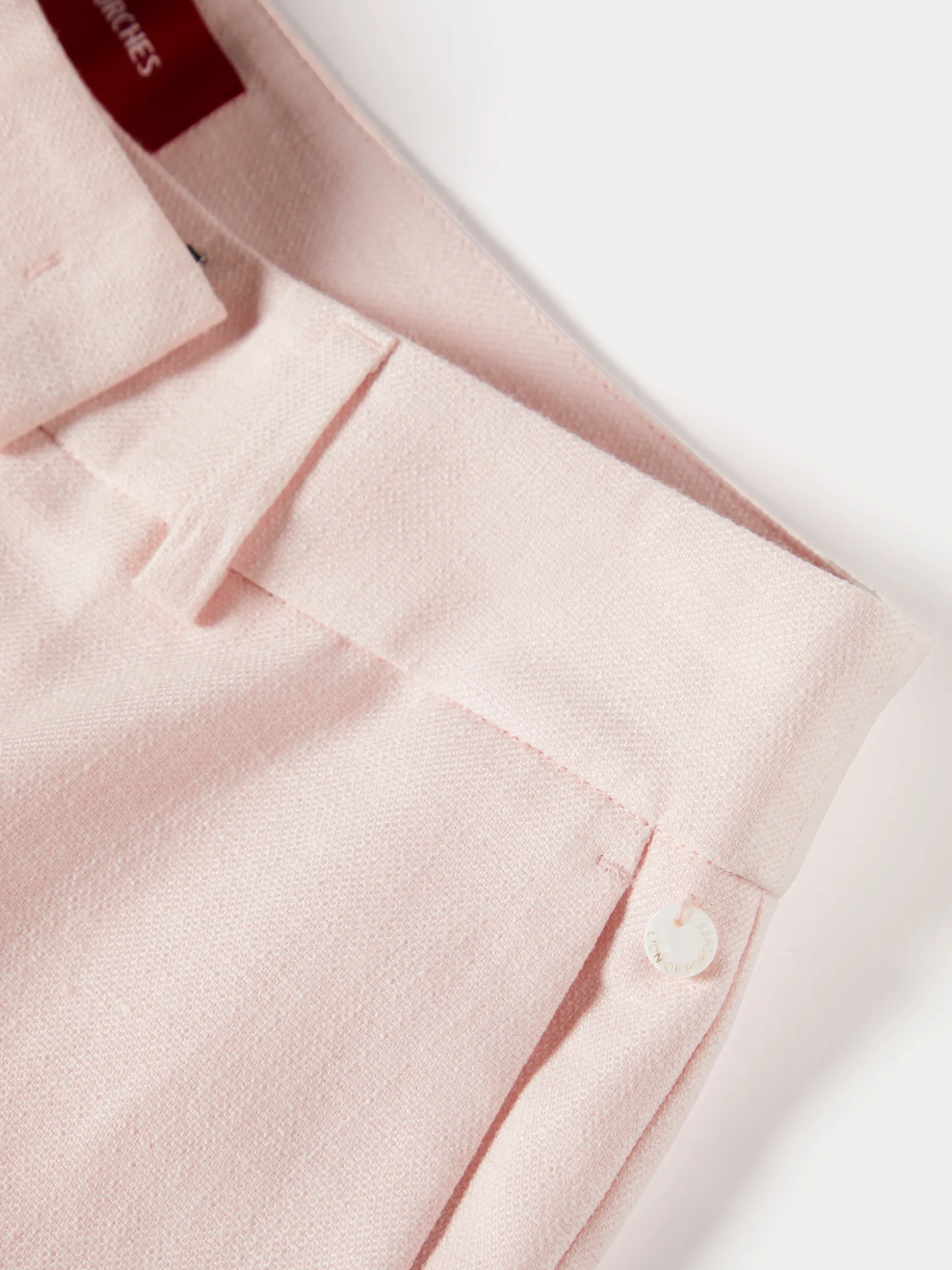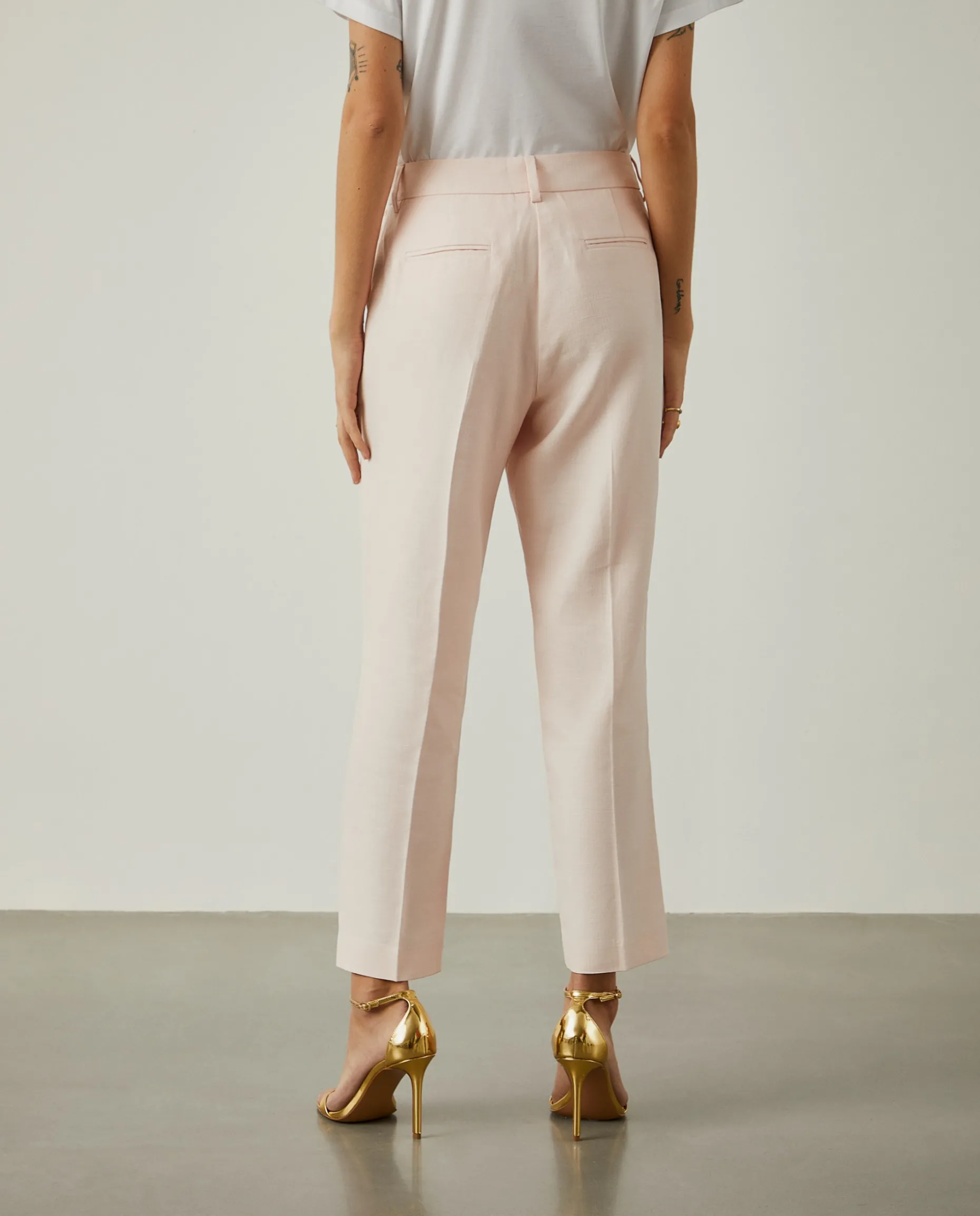 Calças chino clássicas, vincadas, perfeitas para um look elegante de verão. Apertam na frente com botão, guto e fecho de correr oculto por carcela. Finalizam com bolsos laterais. São confecionadas com uma percentagem de linho na sua composição, o que tornam a peça leve e confortável. Para um look completo, veja também o blazer da mesma coleção.