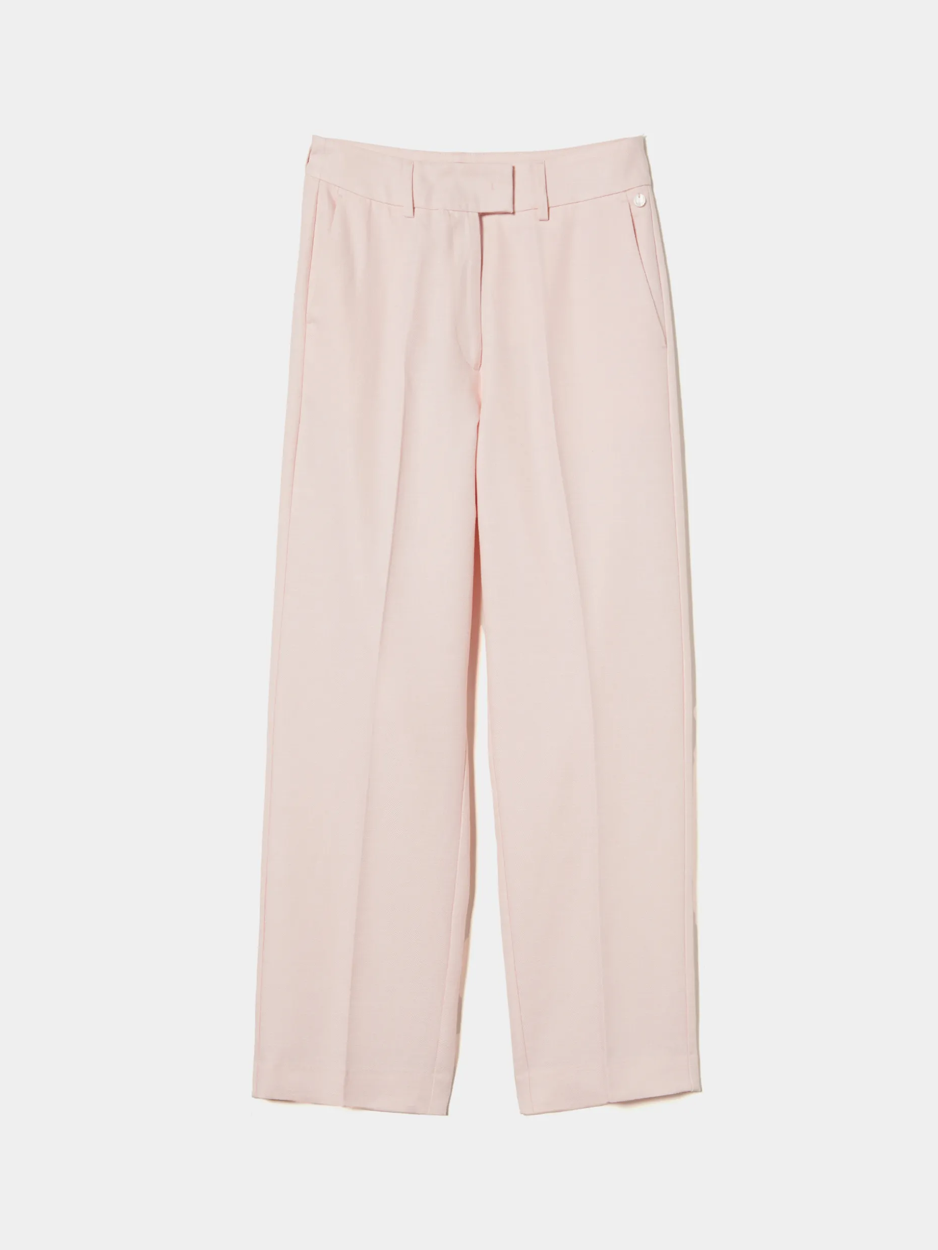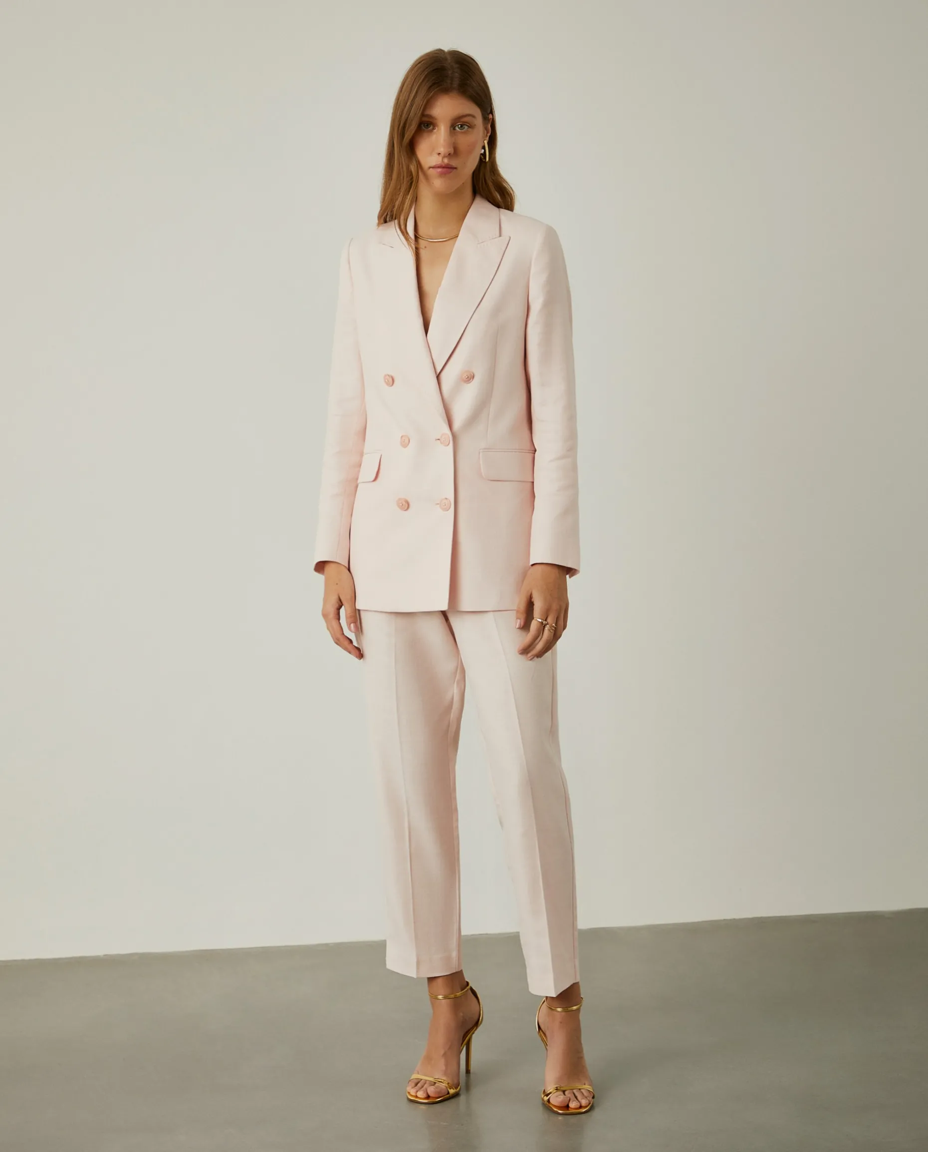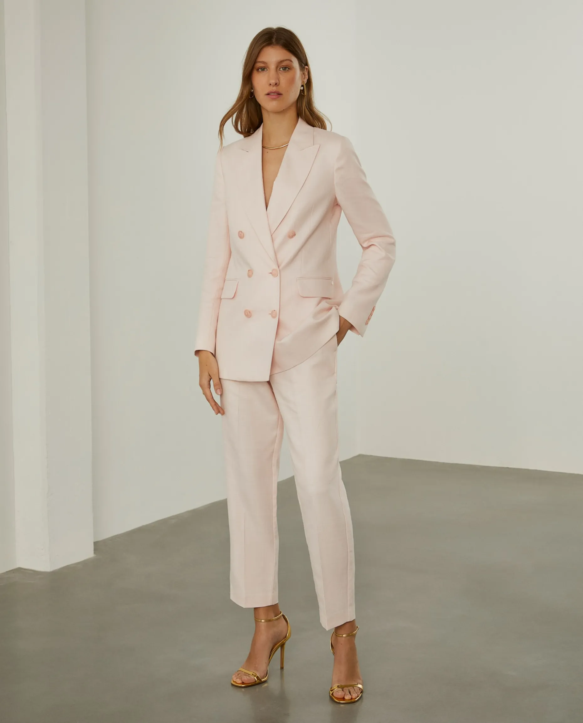 Calças chino clássicas, vincadas, perfeitas para um look elegante de verão. Apertam na frente com botão, guto e fecho de correr oculto por carcela. Finalizam com bolsos laterais. São confecionadas com uma percentagem de linho na sua composição, o que tornam a peça leve e confortável. Para um look completo, veja também o blazer da mesma coleção.