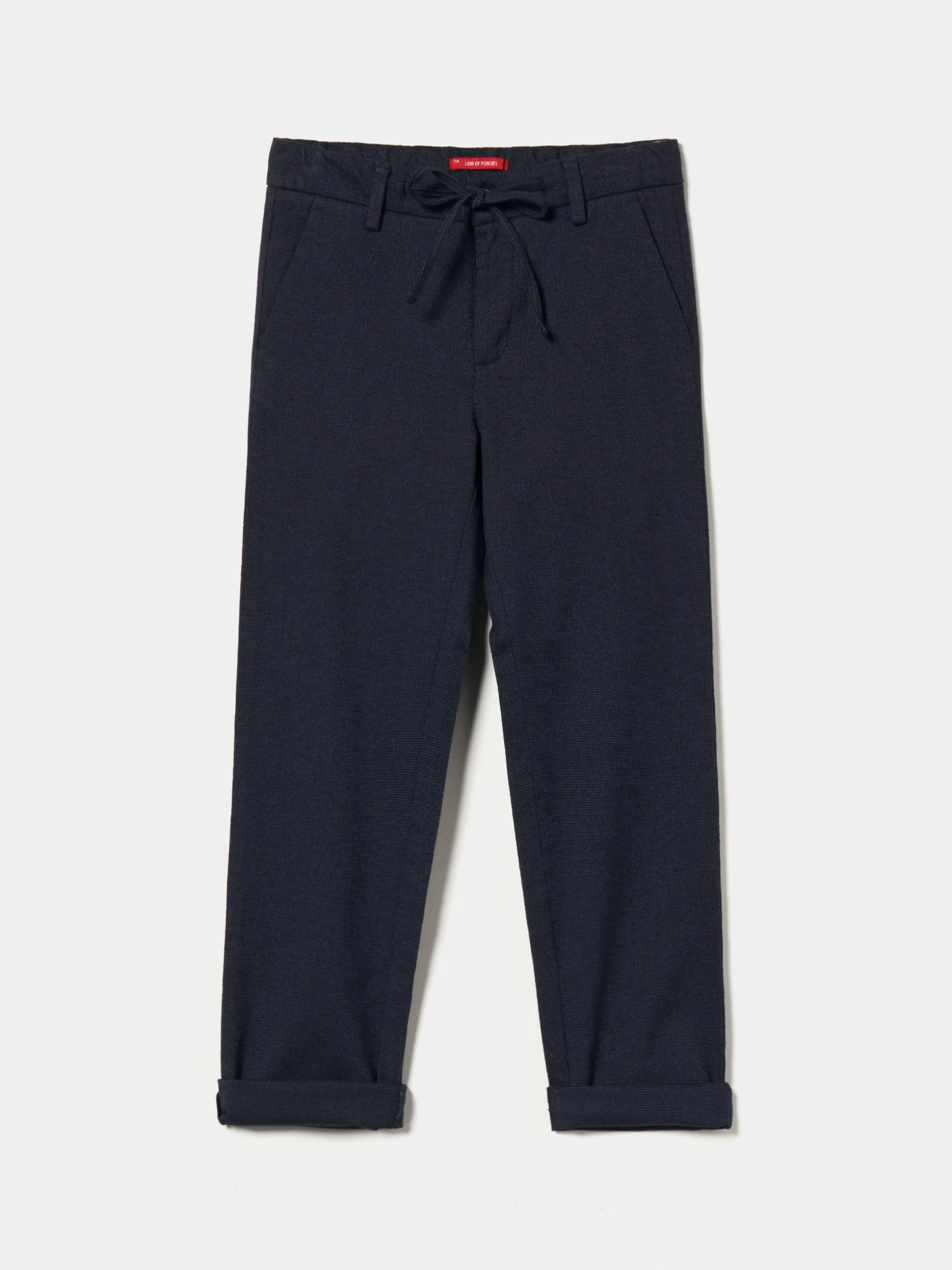 Confortáveis e com estilo, estas calças chino texturizadas apertam com botão e fecho zíper mas têm também cordão para ajustar a gosto. Com bolsos laterais e traseiros.