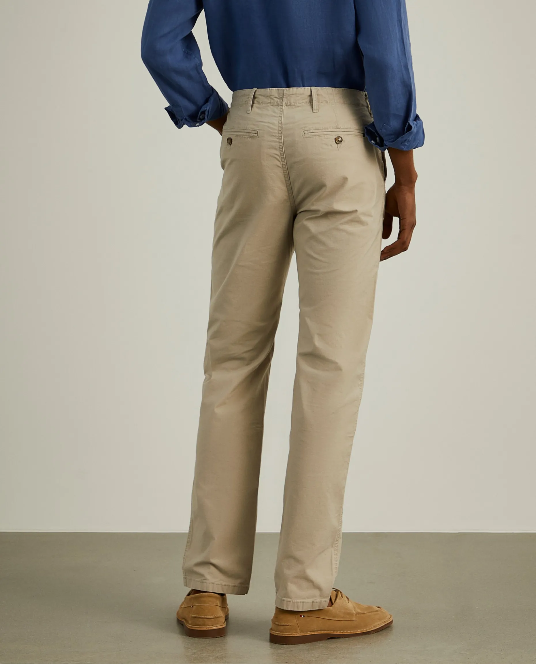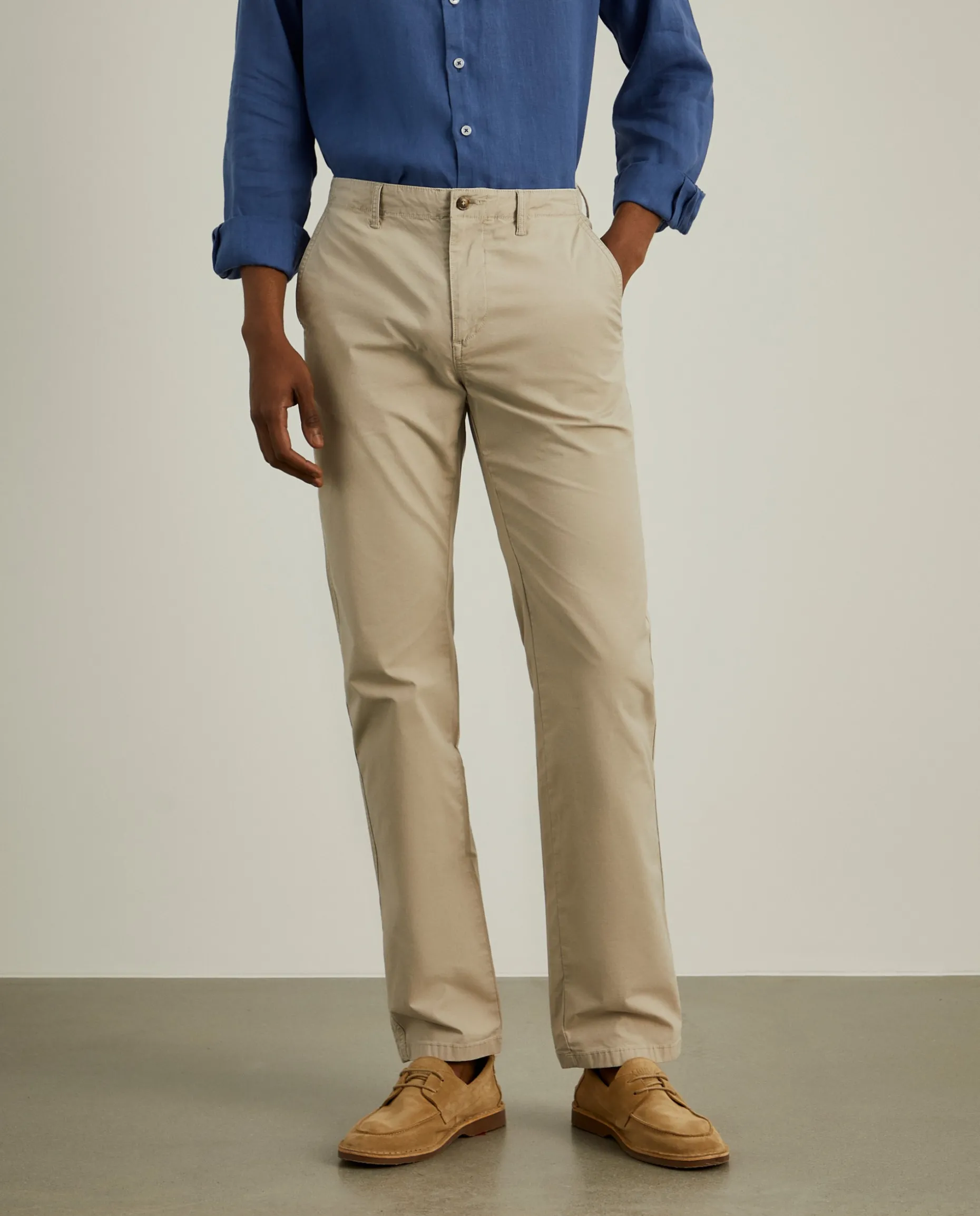 Calças chino, modelo regular fit. Apertam com botão e fecho de correr oculto por carcela. Têm bolsos laterais, assim como traseiros, que fecham com botão. São confecionadas em algodão com uma pequena percentagem de elastano para maior conforto e liberdade de movimento. Disponíveis em várias cores.