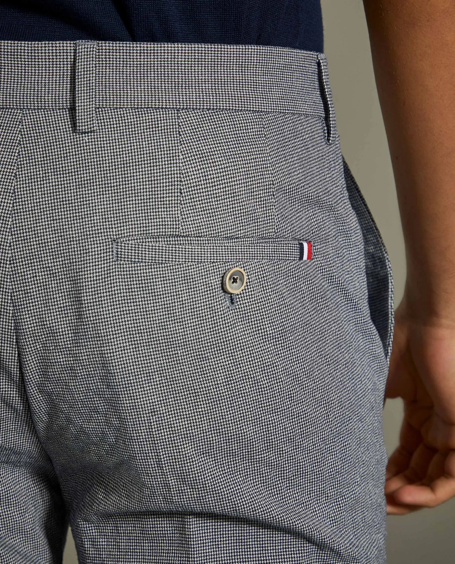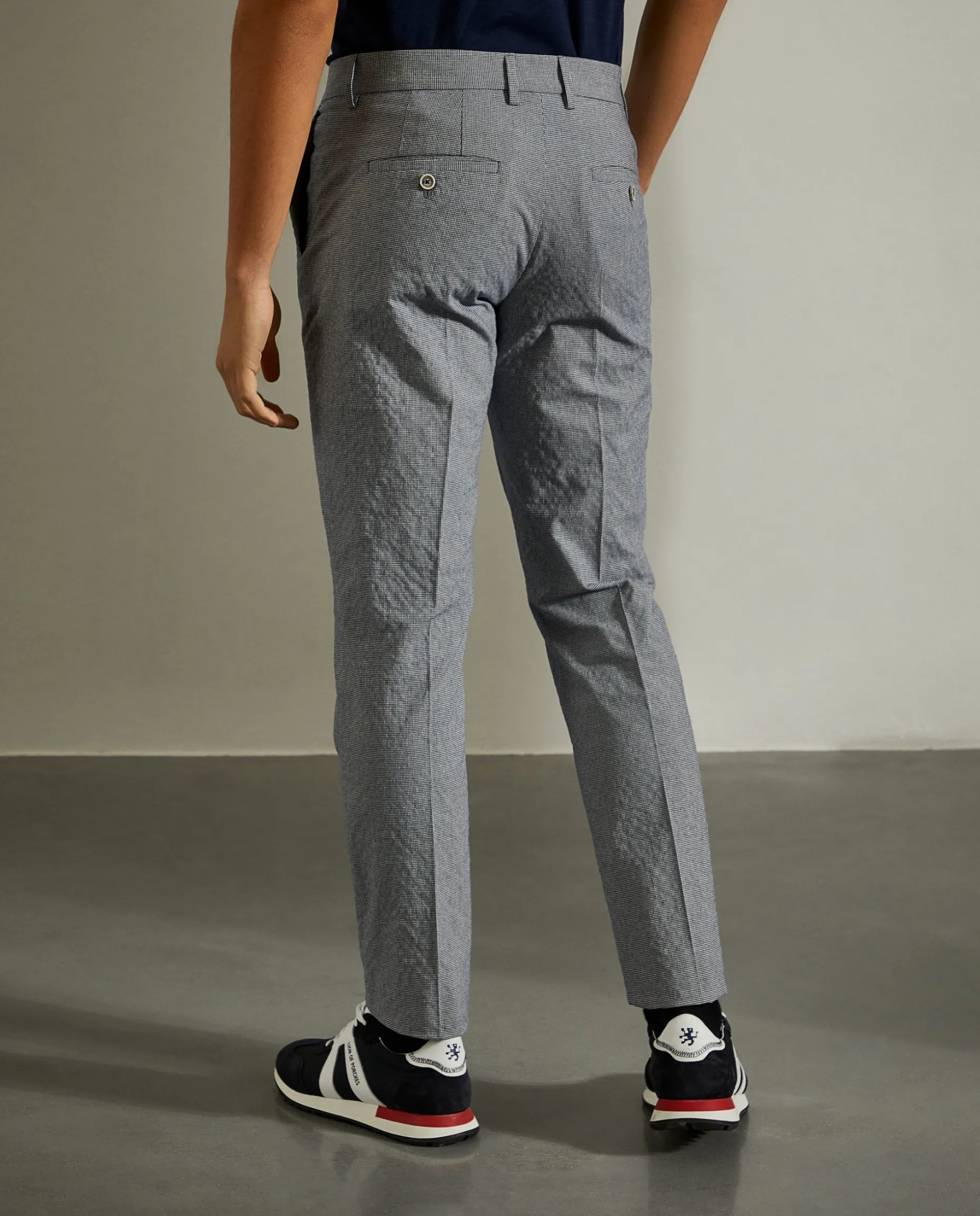 Calças chino regular fit, de padrão xadrez, com vinco. Apertam com fecho e guto. Bolsos laterais. Dois bolsos de um vivo e botão atrás com fita decorativa no bolso direito.