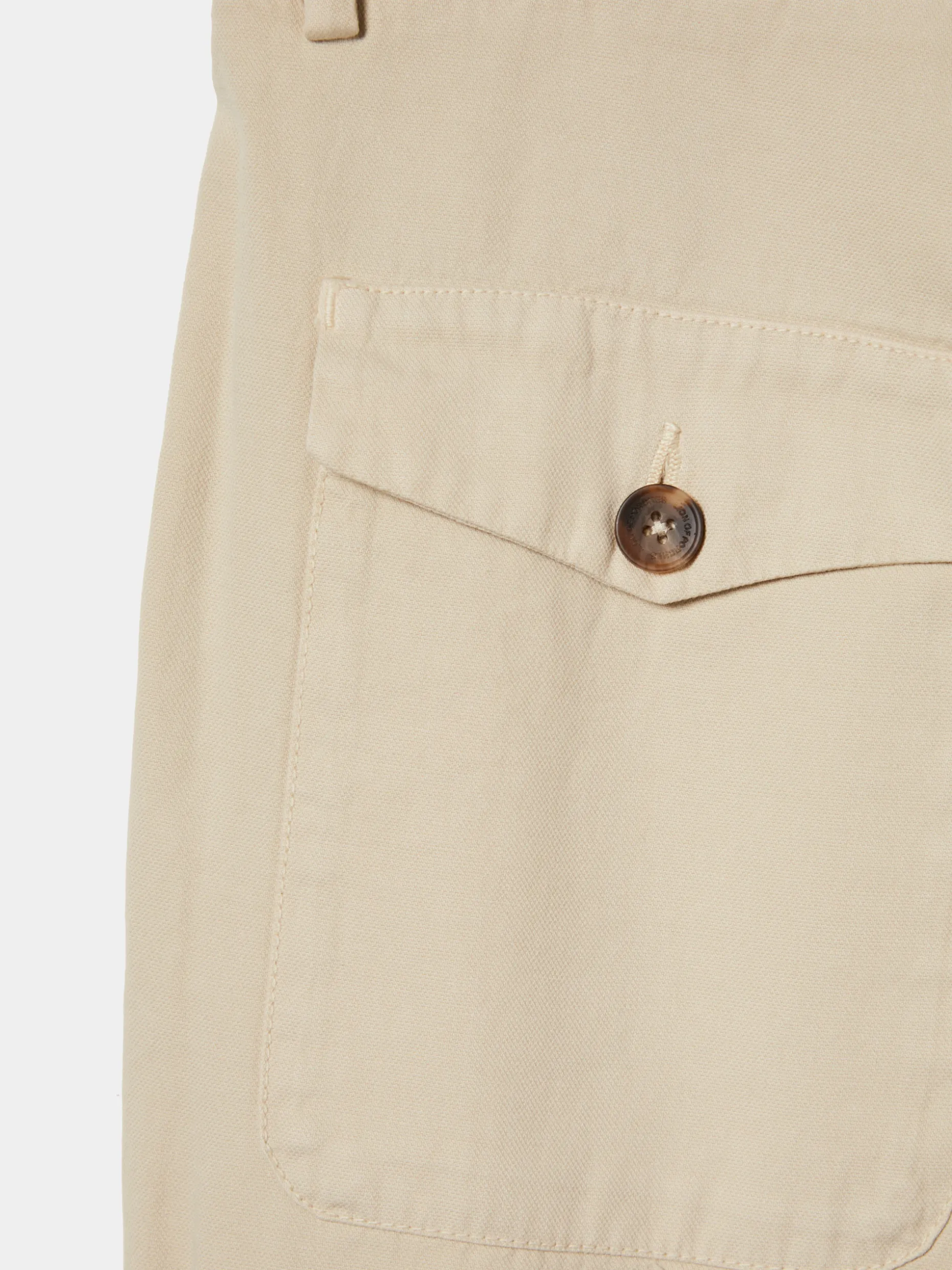 Calças chino regular fit com pregas. Apertam com fecho, cordão e botão personalizado. Bolsos laterais. Detalhe com fita de riscas na frente. Dois bolsos de chapa traseiros com pala e botão.