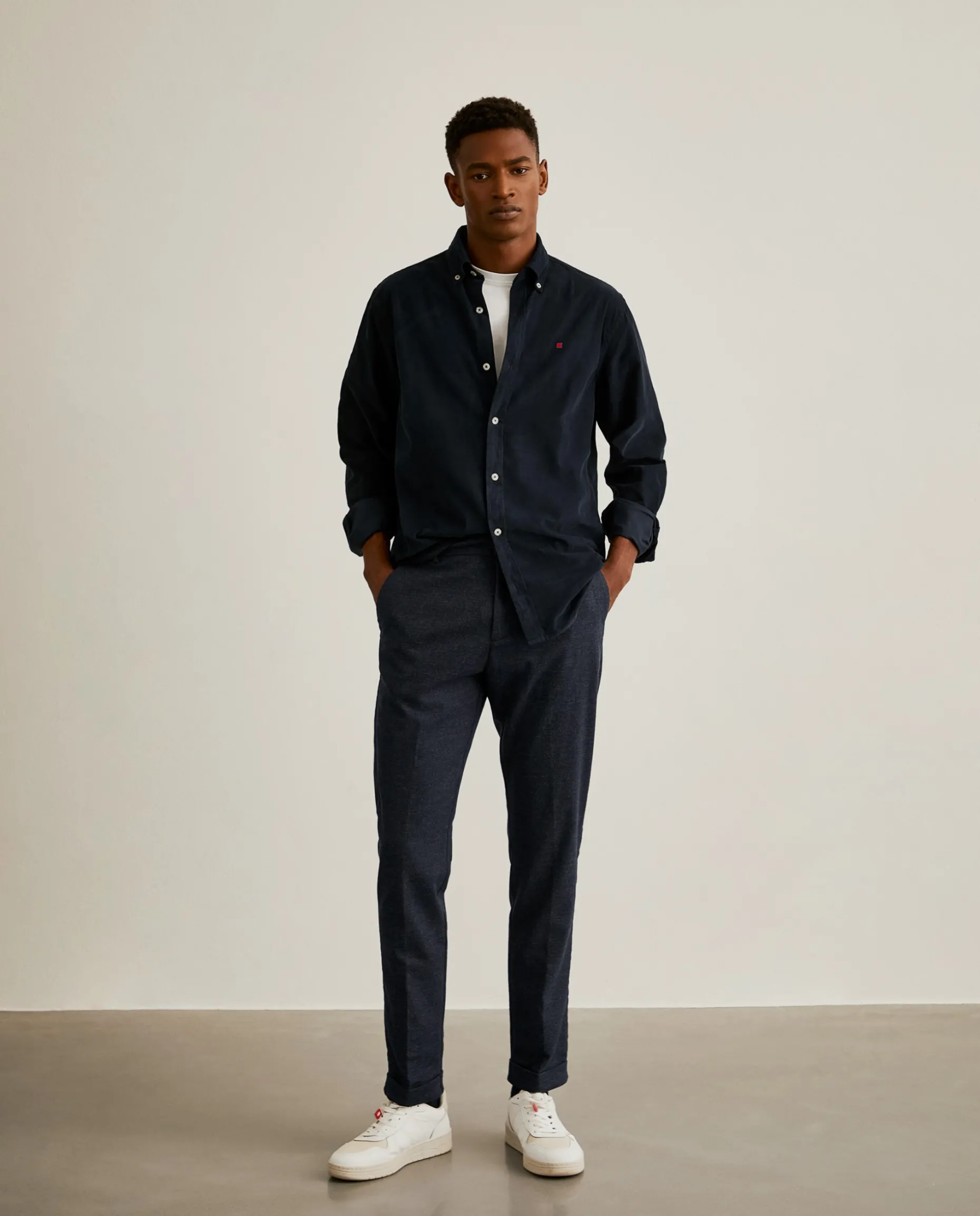 Versáteis e elegantes, estas calças chino regular fit têm micro padrão xadrez e são a escolha perfeita para o inverno já que são confecionadas com uma mistura de lã que lhes confere maior isolamento térmico. Apertam com botão e fecho oculto por carcela e têm bolsos laterais e traseiros.