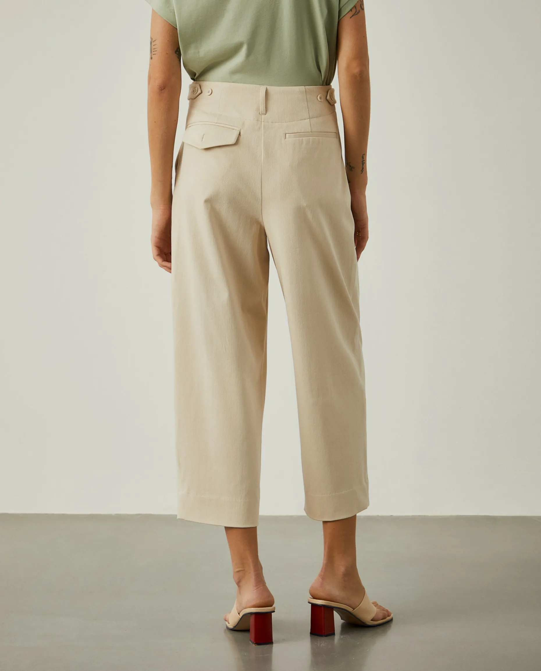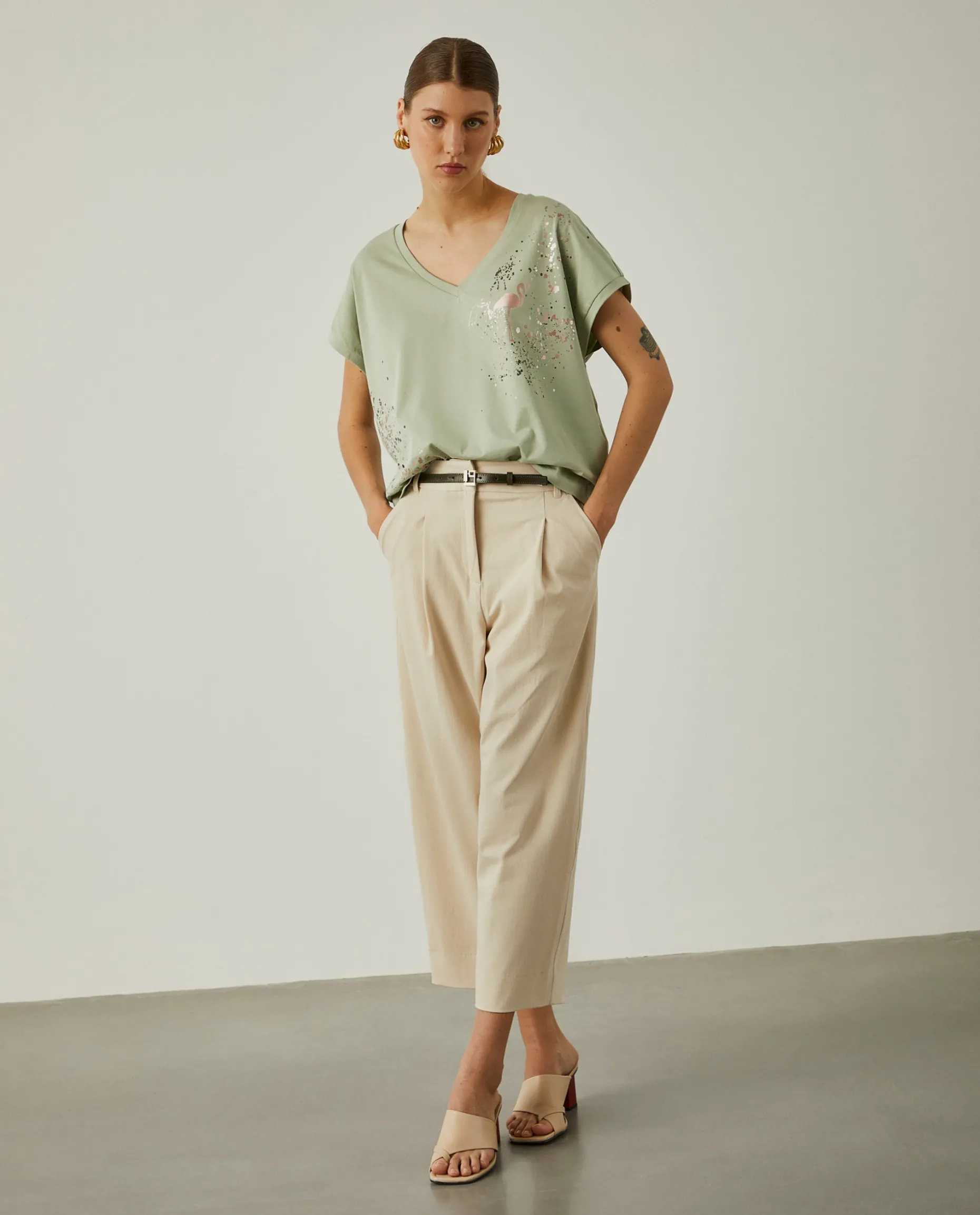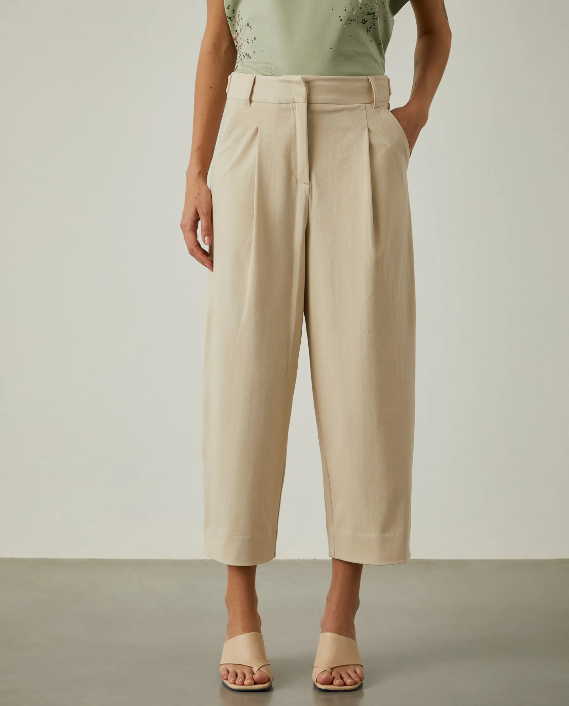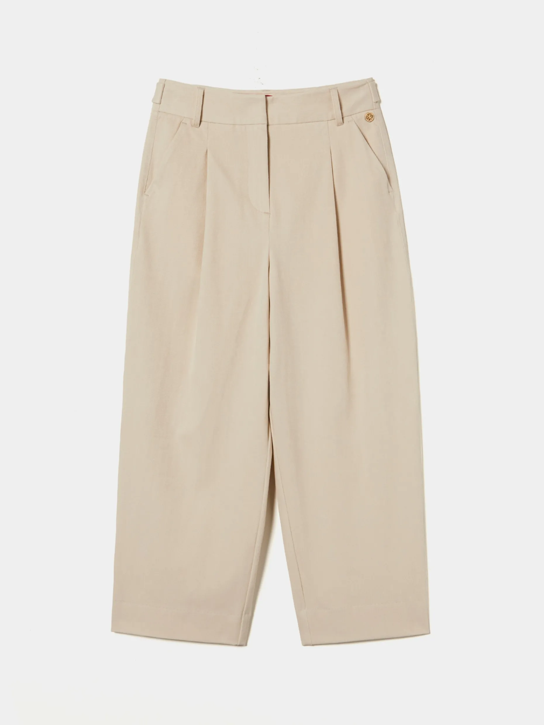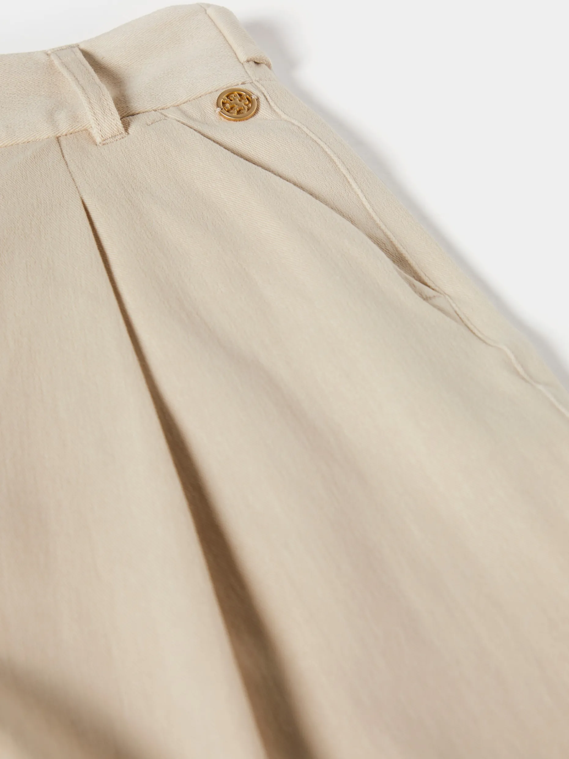 Calças de fit largo com pregas na frente. Com bolsos laterais e traseiros.