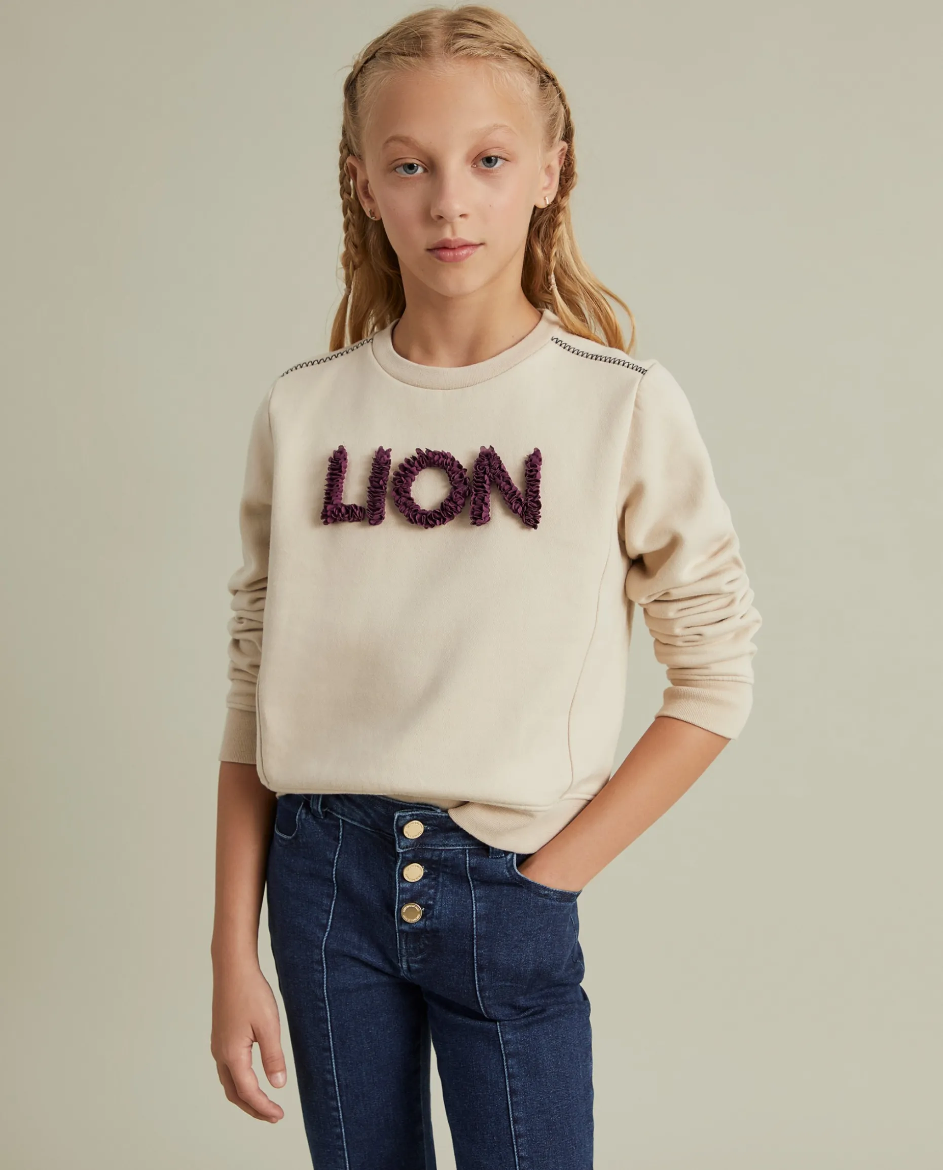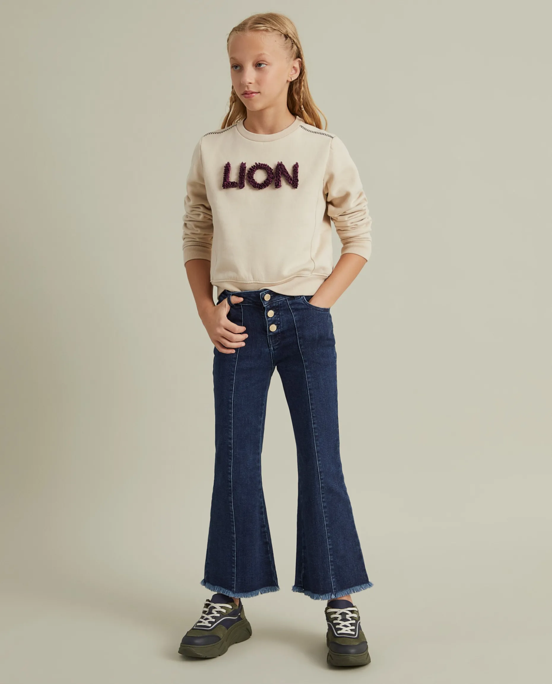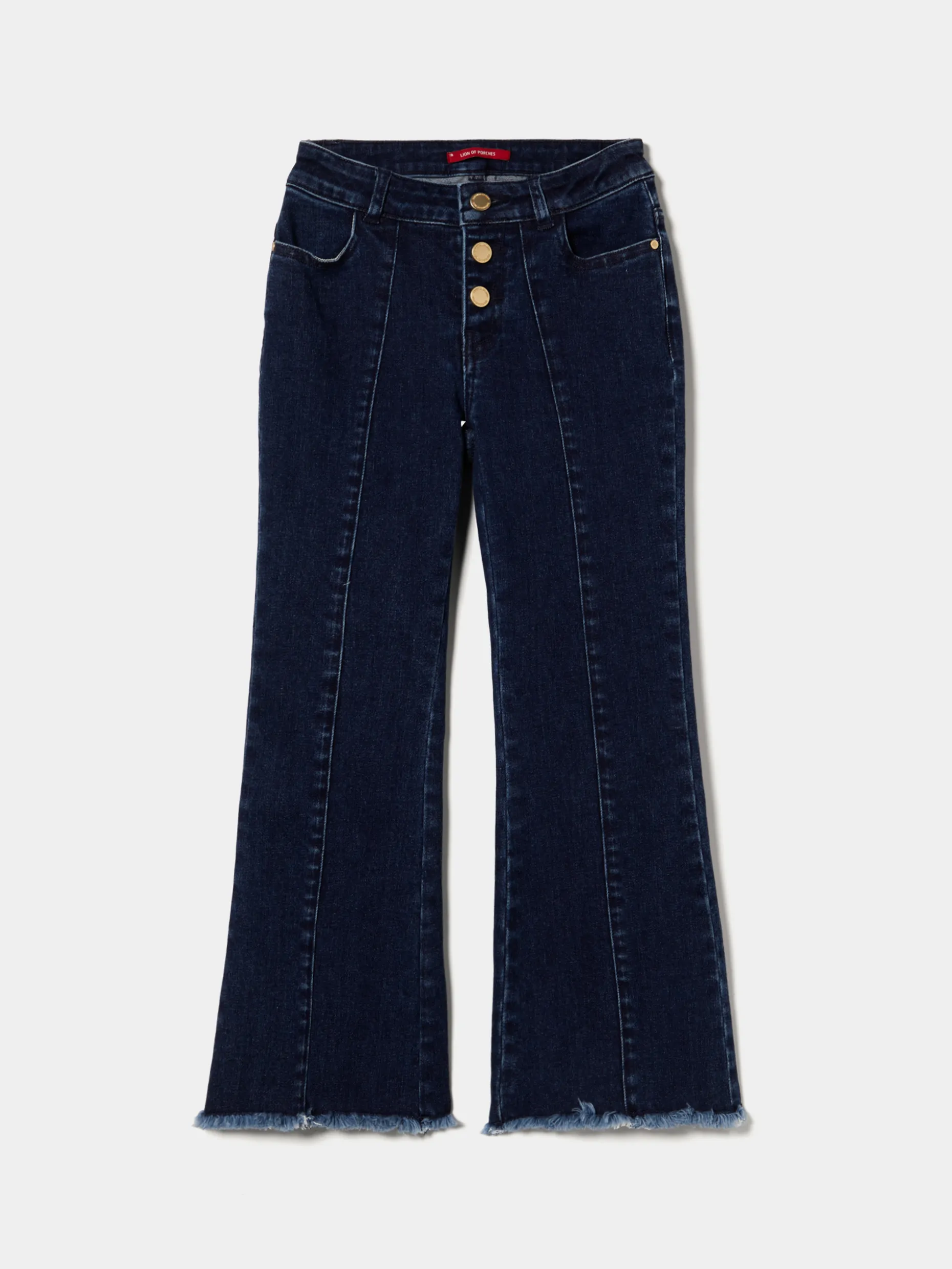 Para as meninas vaidosas, mas que privilegiam o conforto, propomos estas calças denim com pormenor diferenciador de franjas na base da perna. Apertam com três botões e têm nervuras na frente. Finalizam com bolsos frontais e traseiros.