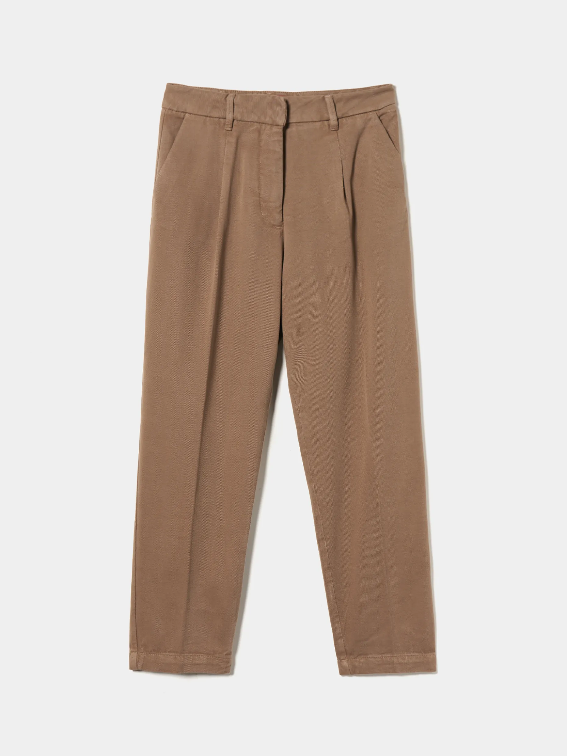 Calças denim vincadas com pregas na frente. Com bolsos laterais e traseiros. São confecionadas com uma mistura de algodão e liocel, um material sustentável, leve e agradável ao toque.