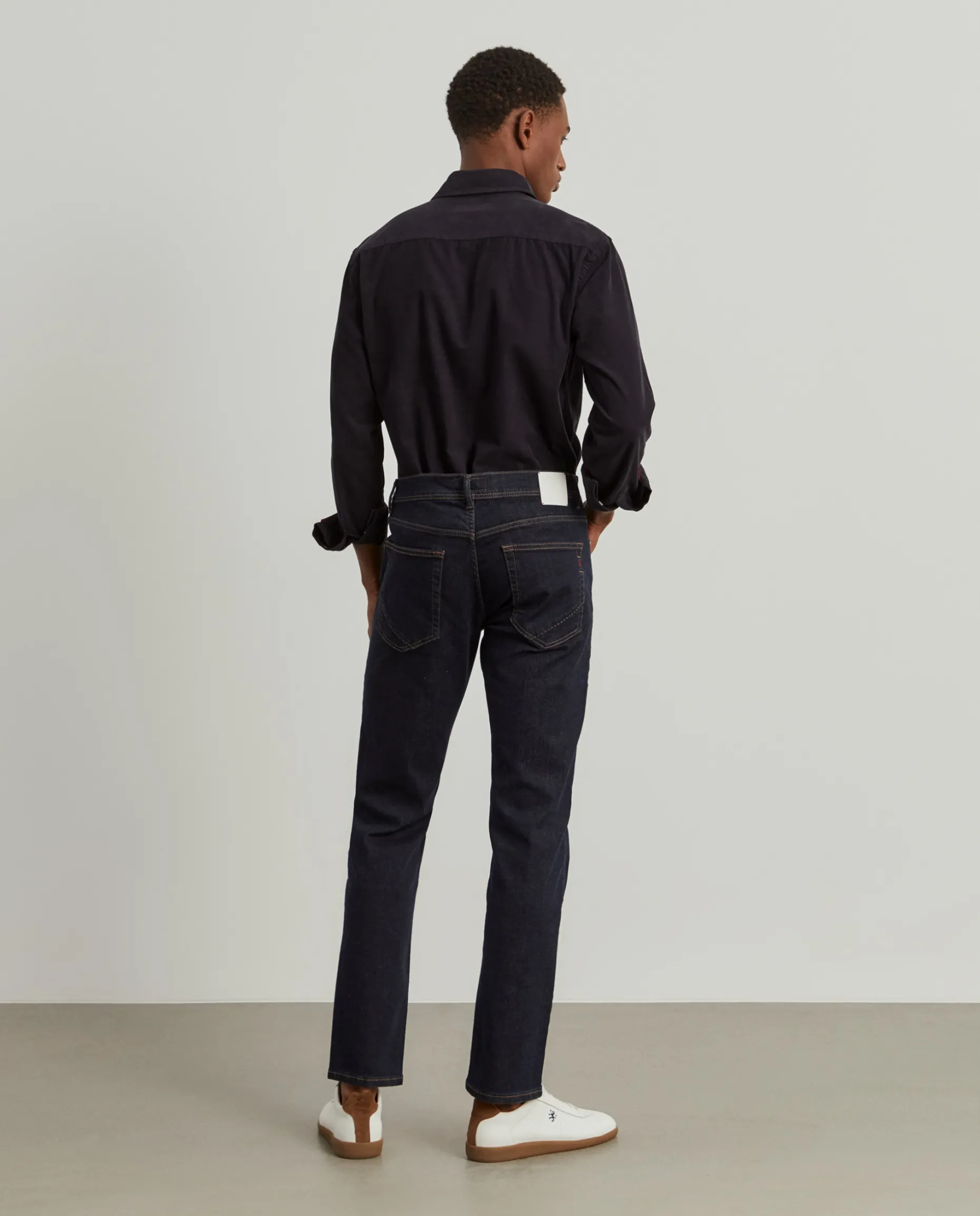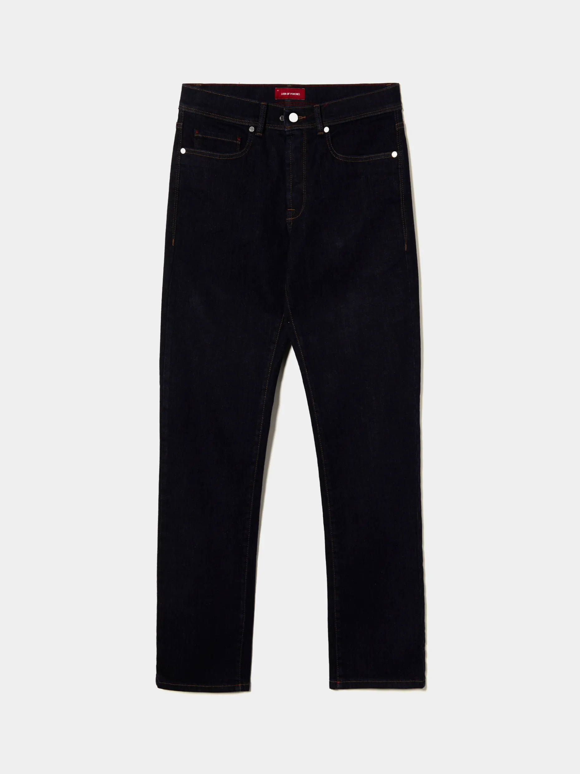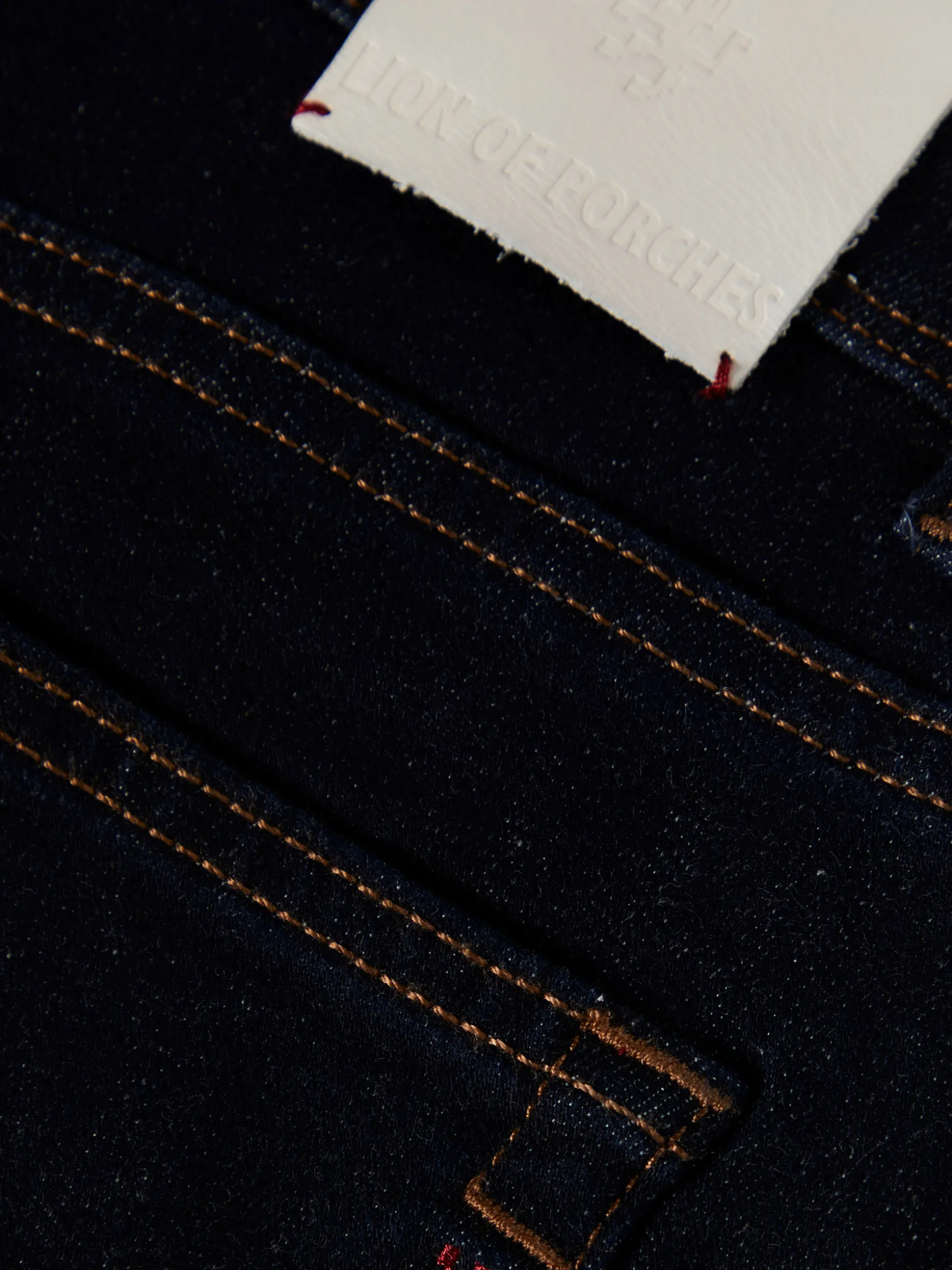 Calças denim, corte regular fit, de lavagem escura. Tem cinco bolsos: três na frente (um deles para moedas) e dois traseiros. A costura é em contraste e aperta com botão e fecho de correr oculto por carcela. Finaliza com etiqueta Lion of Porches na parte de trás do cinto. São confecionadas em algodão com uma pequena percentagem de elastano para maior liberdade de movimento.