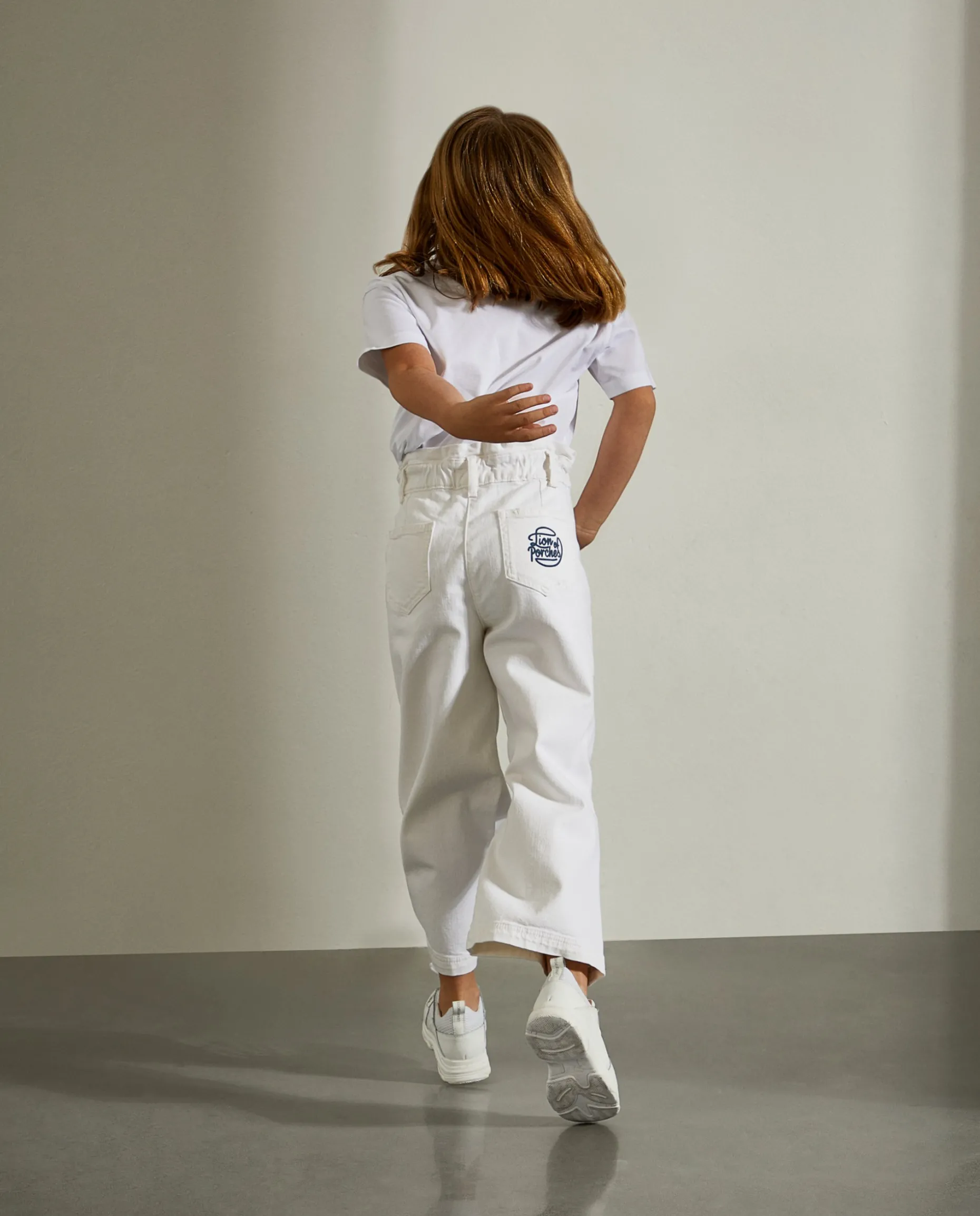 Calças largas em sarja com cinto na própria sarja para fazer laço. Estampado no bolso traseiro em contraste.