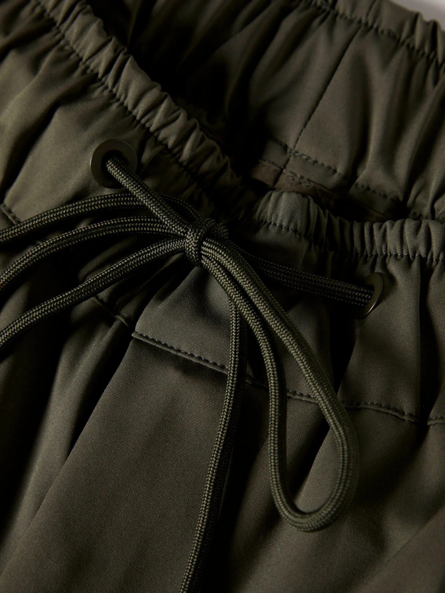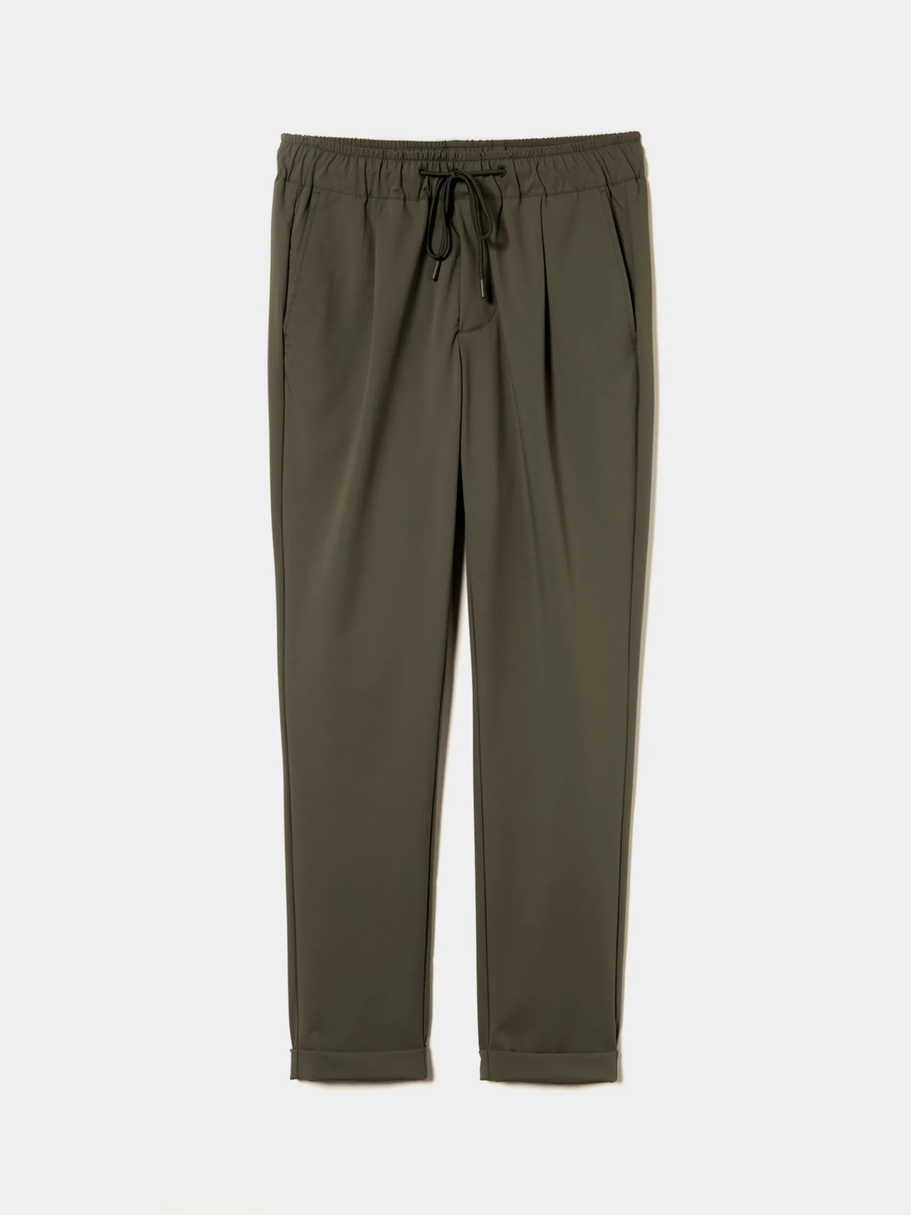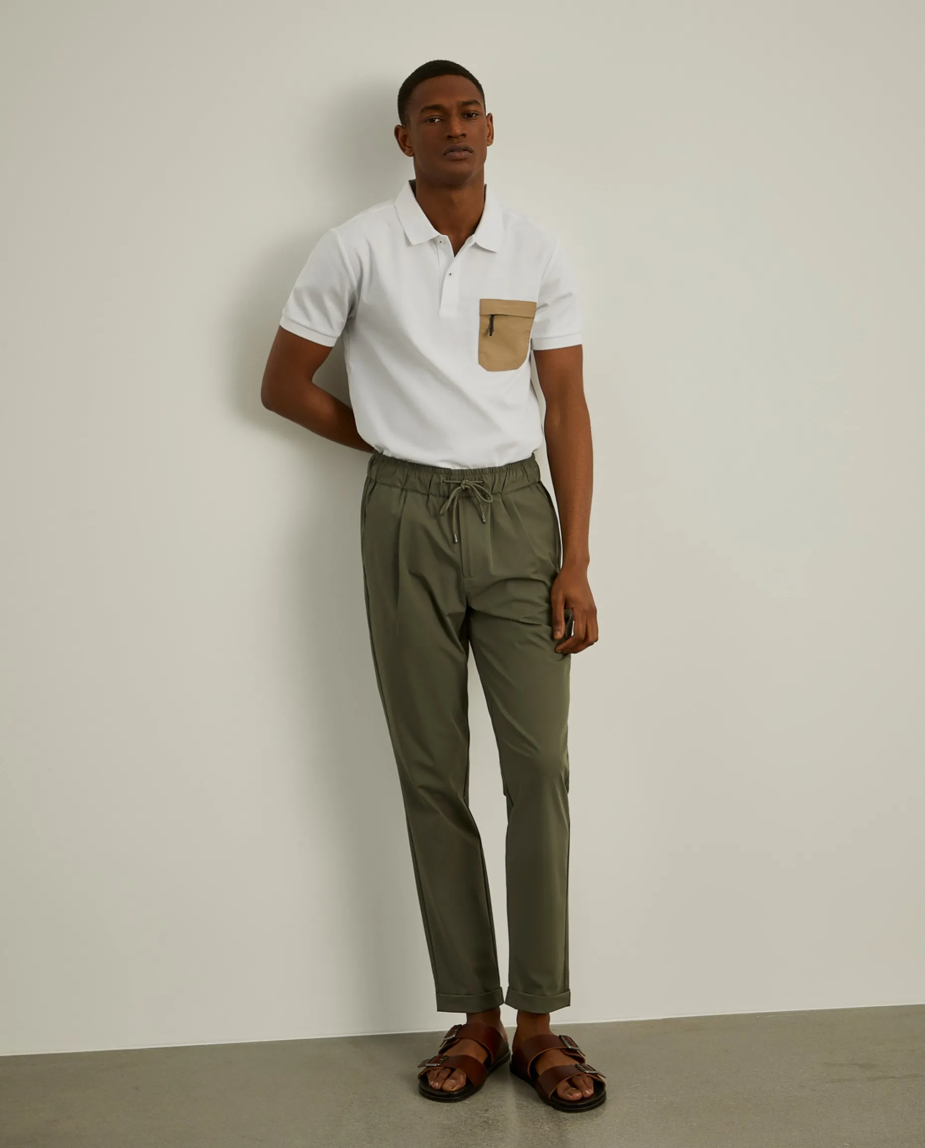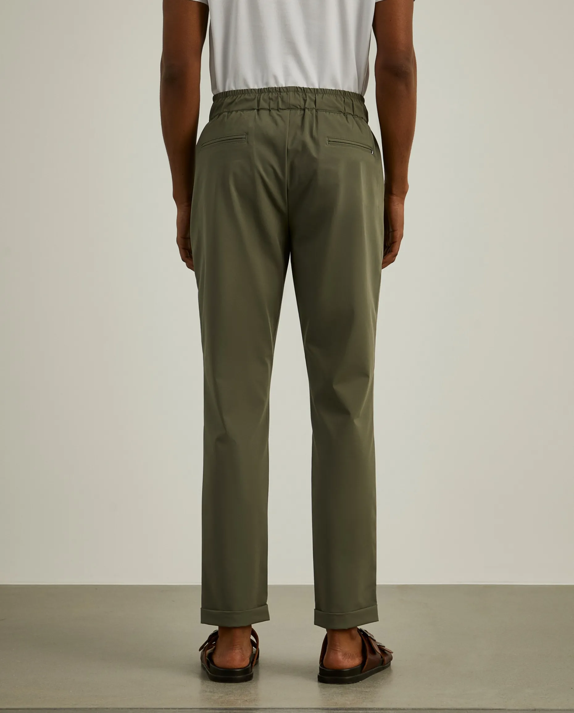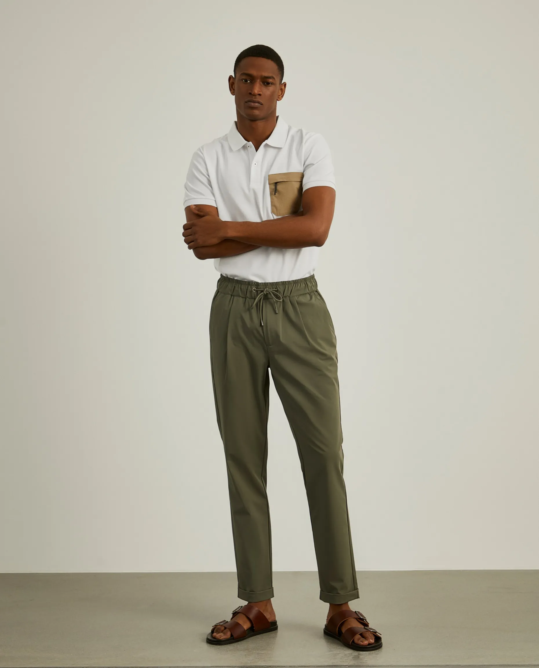 Calças jogger em malha técnica com cintura elástica ajustável por cordão. Com bolsos laterais e atrás, finalizam com dobra na base da perna.