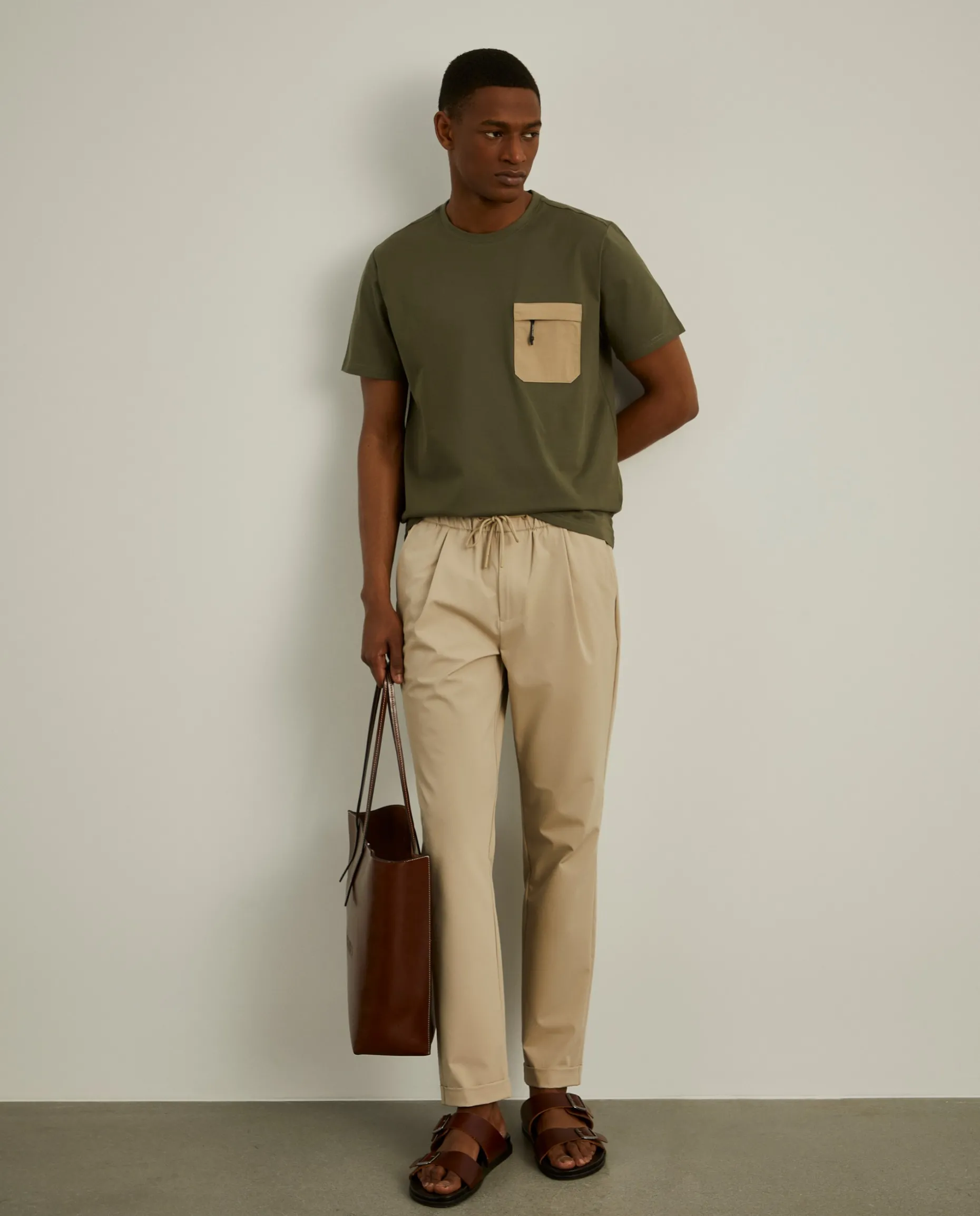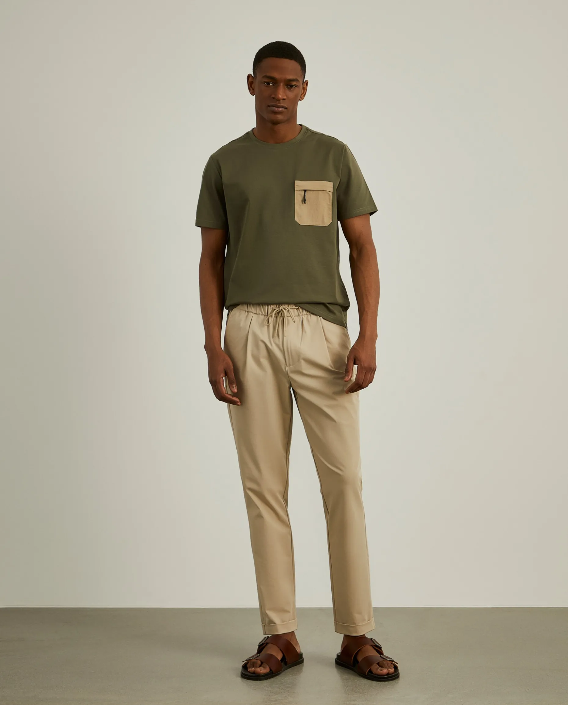 Calças jogger em malha técnica com cintura elástica ajustável por cordão. Com bolsos laterais e atrás, finalizam com dobra na base da perna.