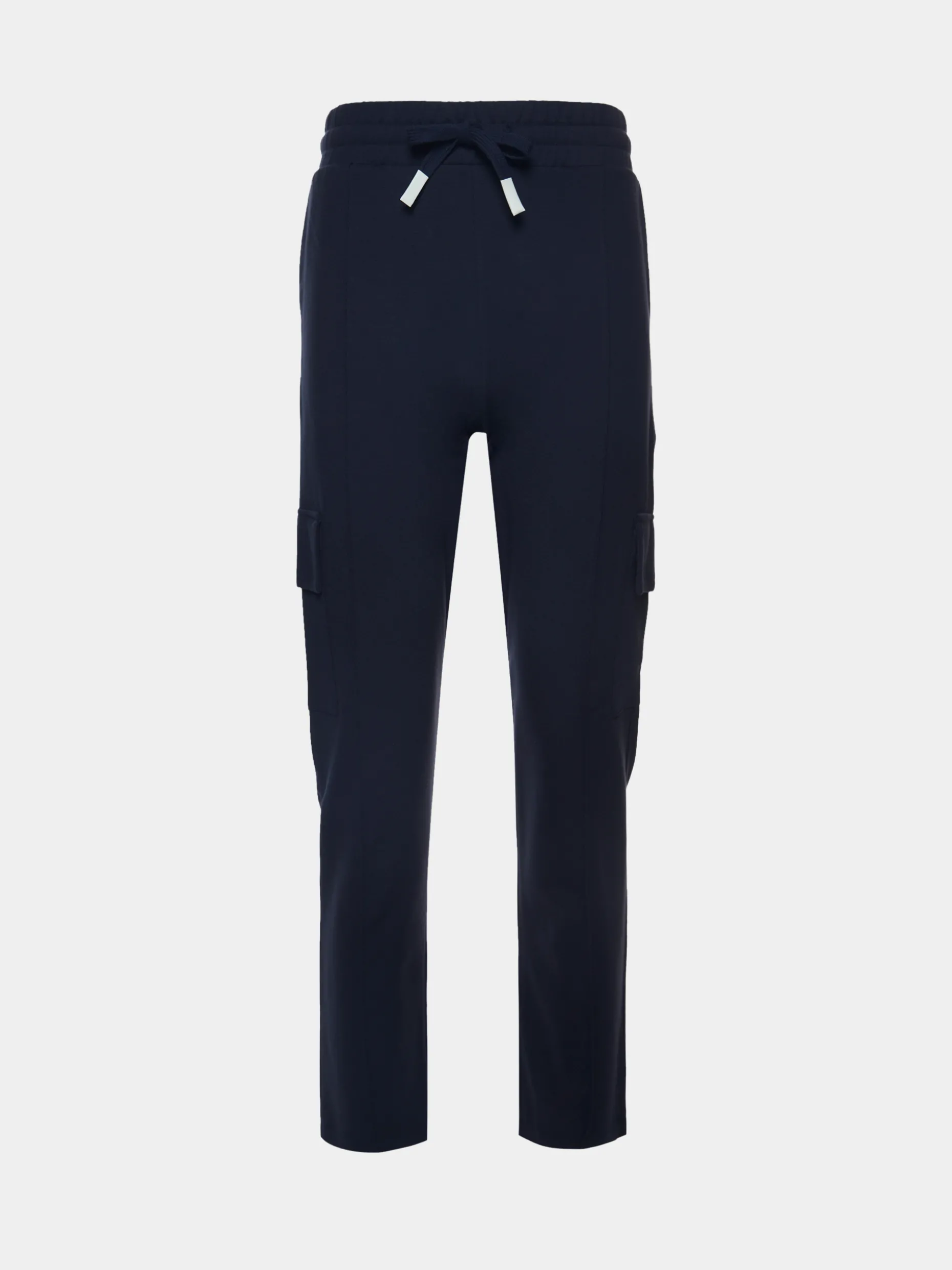 Calças jogger confecionadas em malha com bolsos nas laterais. Cordões à cor com ponteiras em contraste. Bolso traseiro com estampado em contraste.