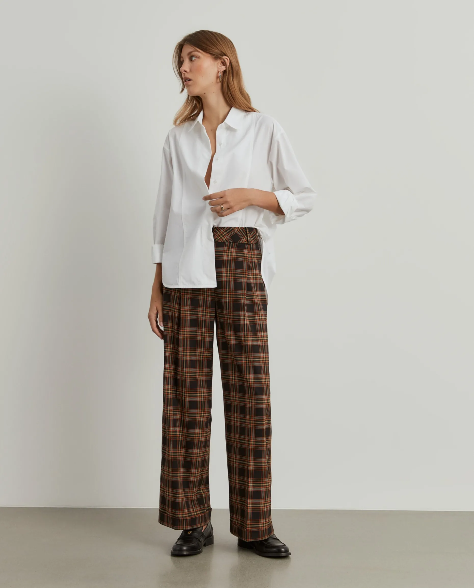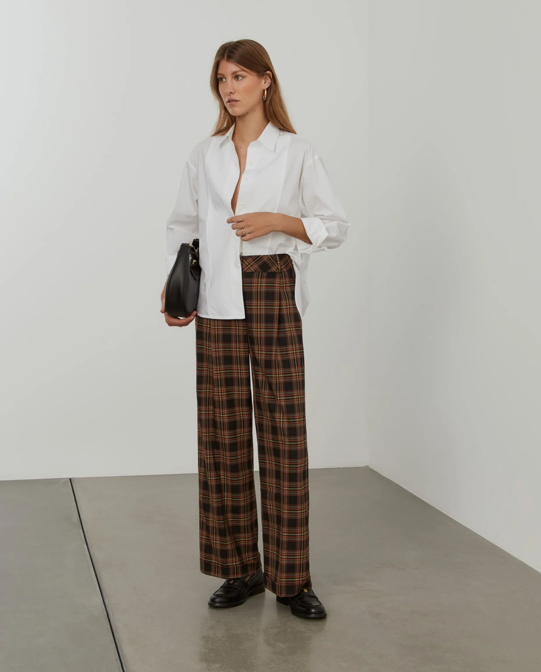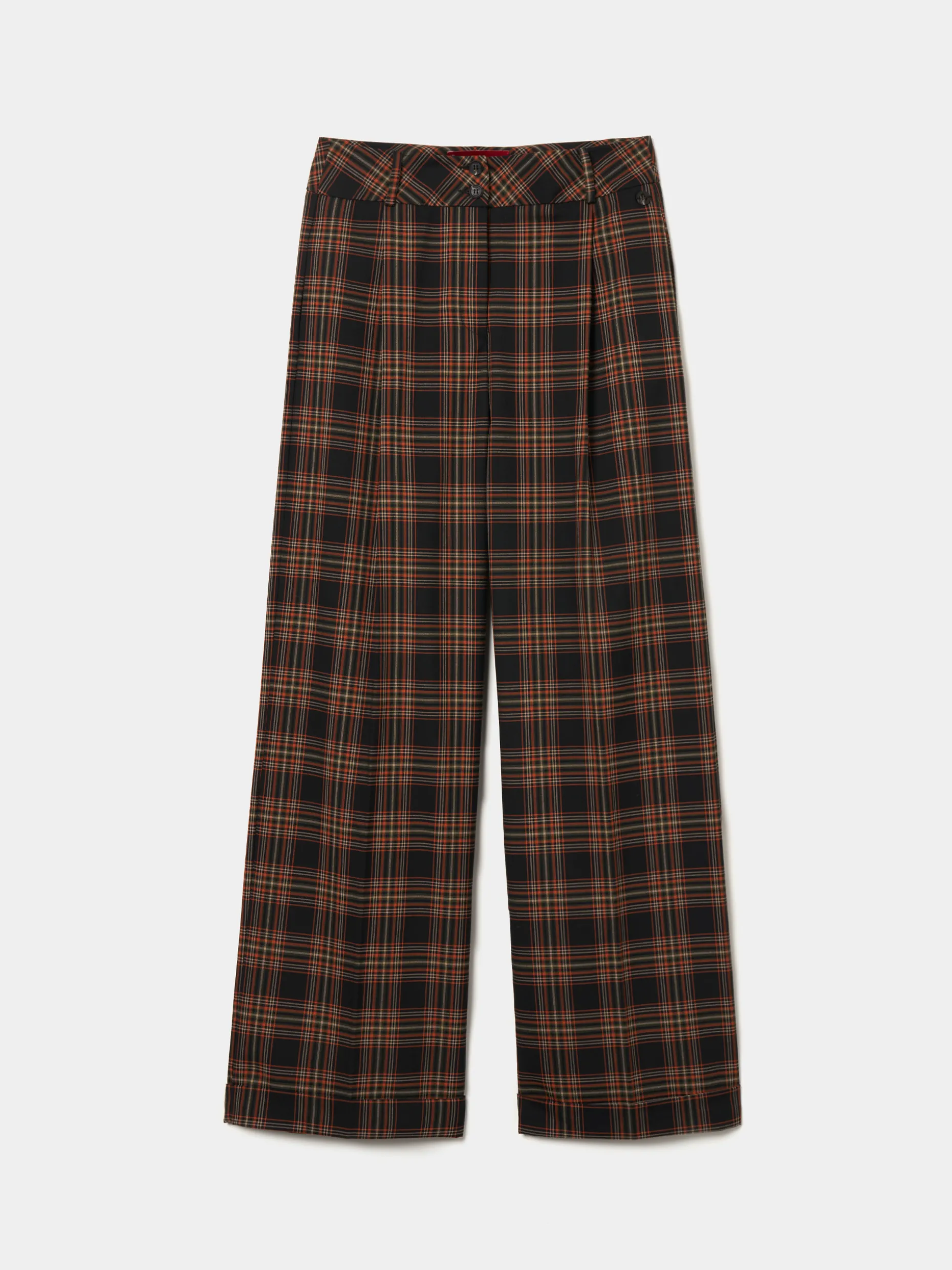 Calças largas xadrez com prega na frente. Apertam na frente com fecho oculto e dois botões. Dois bolsos laterais e dois bolsos na parte posterior.
