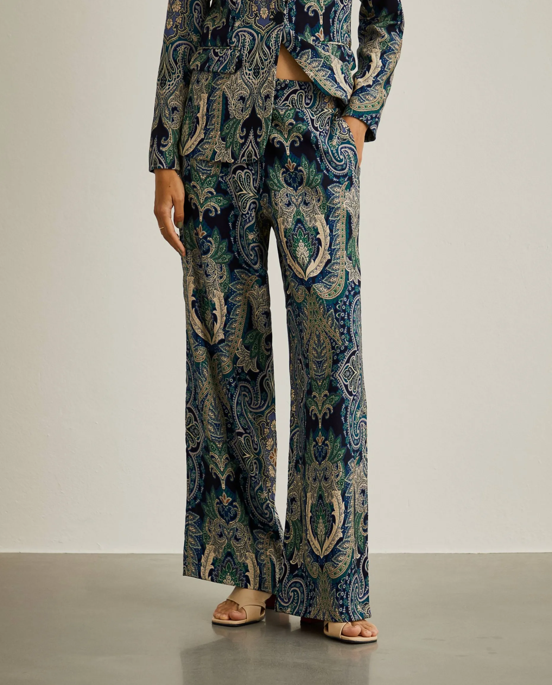 Calças pantalona, de cintura elástica, com estampado de cornucópias para quem aprecia looks originais e mais arrojados. Para um total look, veja também o blazer da mesma coleção.