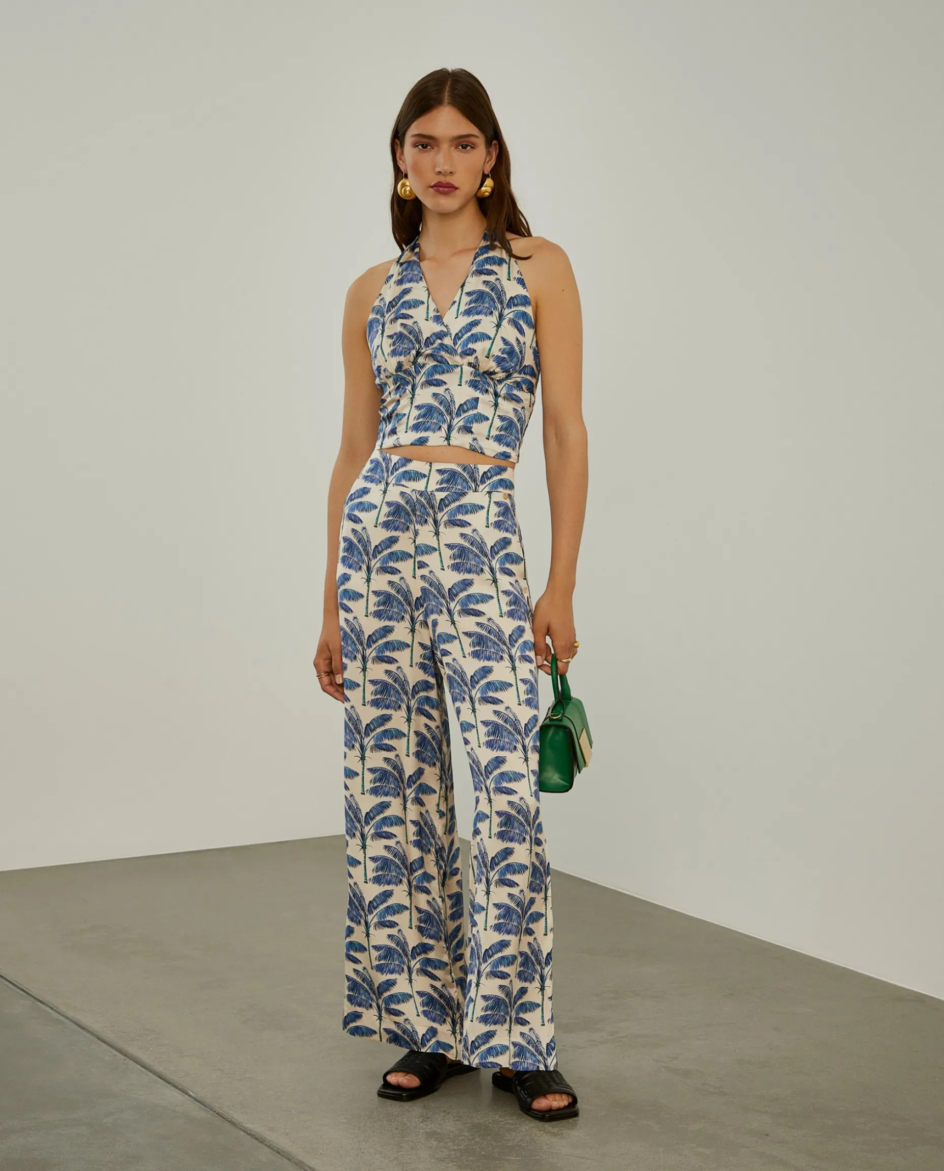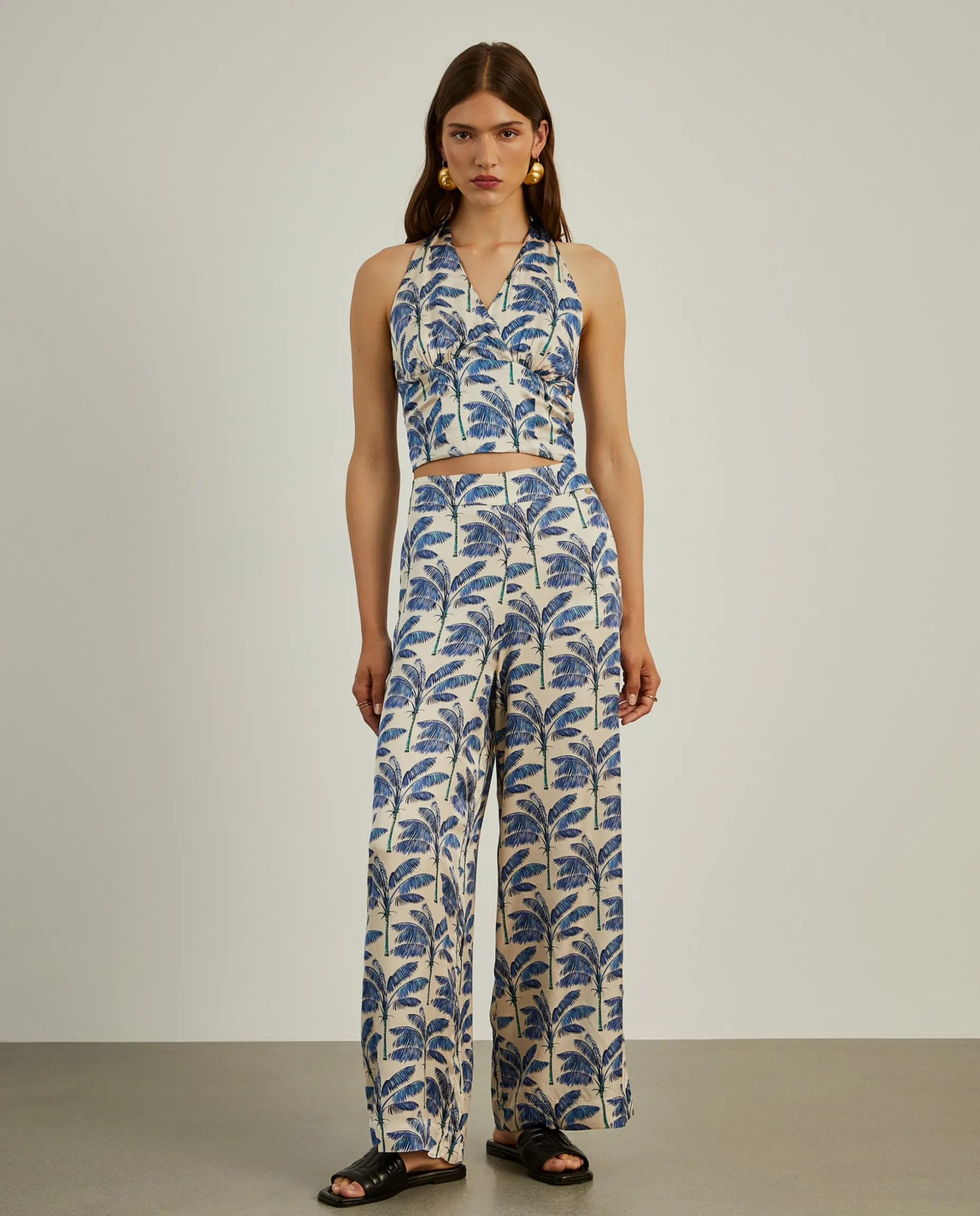 Para um look de verão elegante e com muita personalidade, propomos estas calças pantalona fluidas, de cintura subida, com padrão de palmeiras all over. Apertam atrás através de fecho invisível. Para um total look, veja também a t-shirt e o top da mesma coleção.