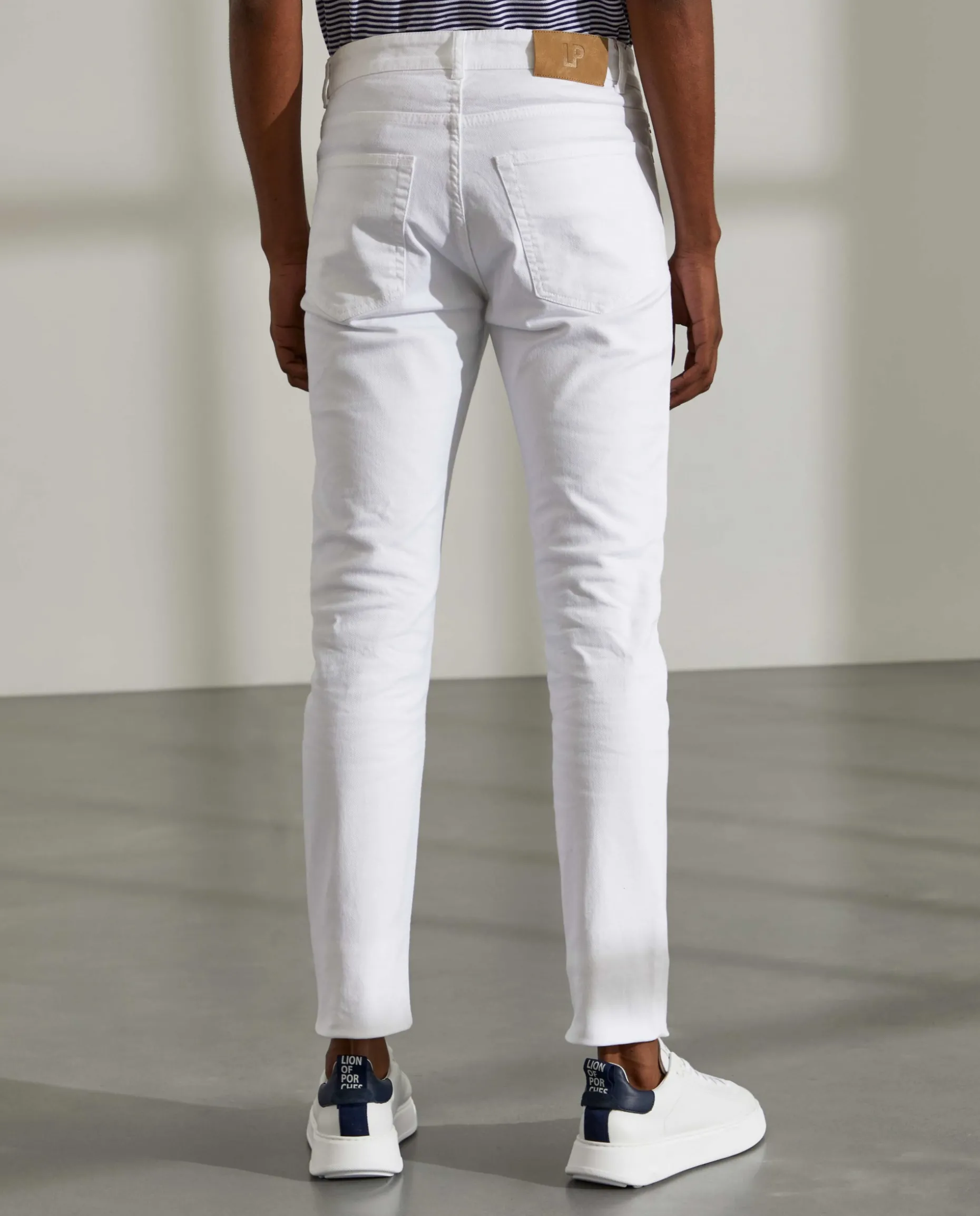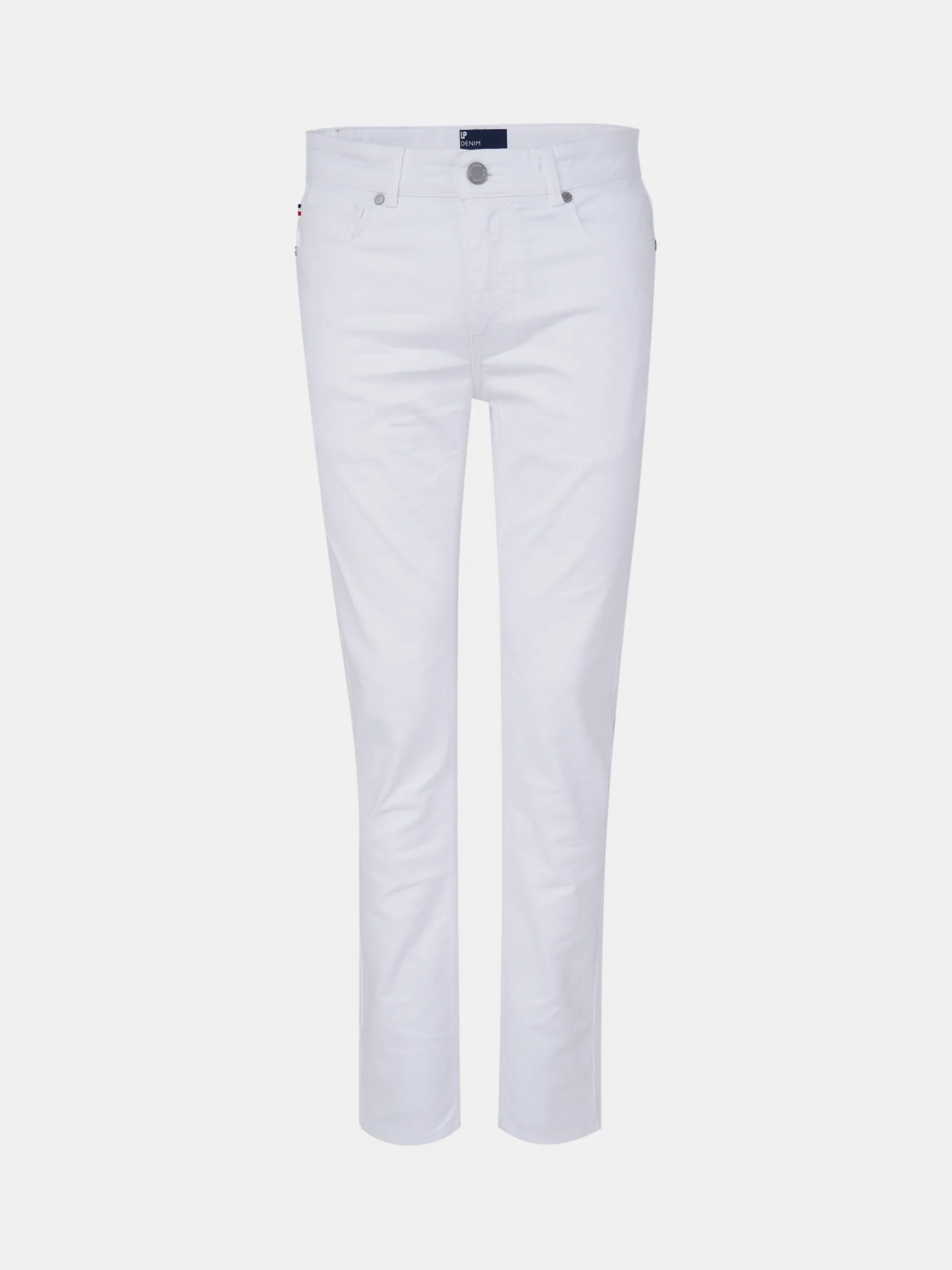 Calças slim fit. Confecionadas com algodão stretch. Com cinco bolsos. Botões e rebites personalizados. Etiqueta personalizadana parte posterior do cinto Fita decorativa no bolso de moedas.