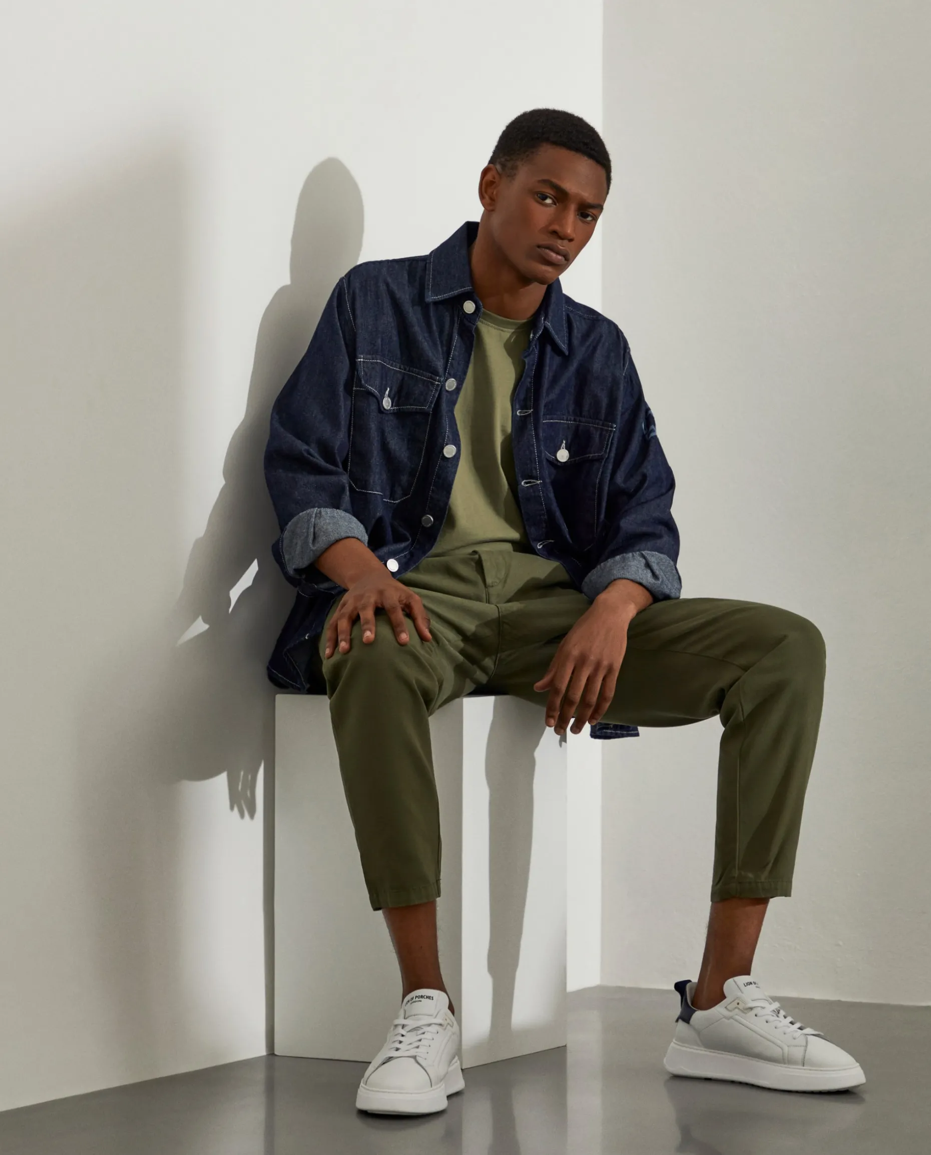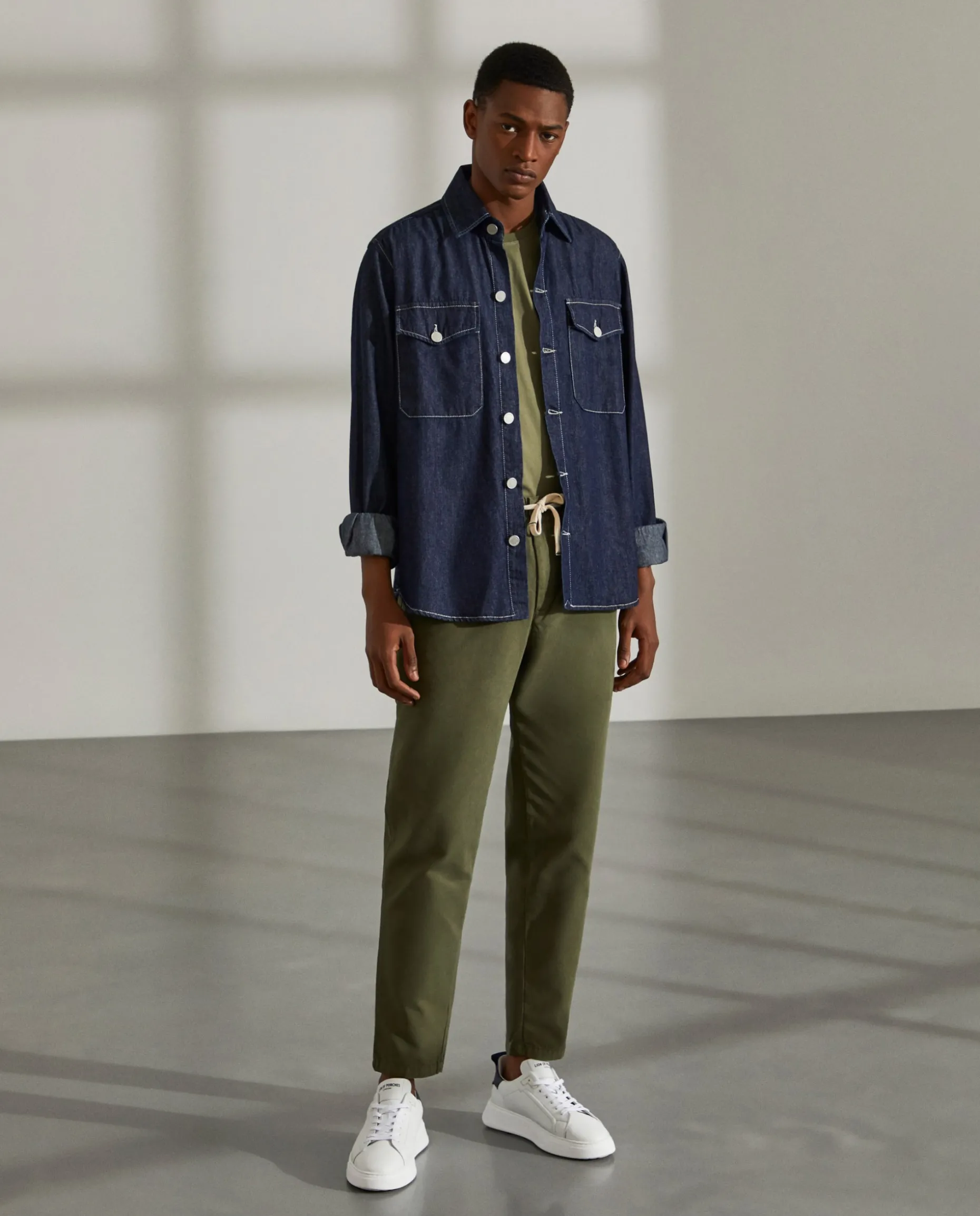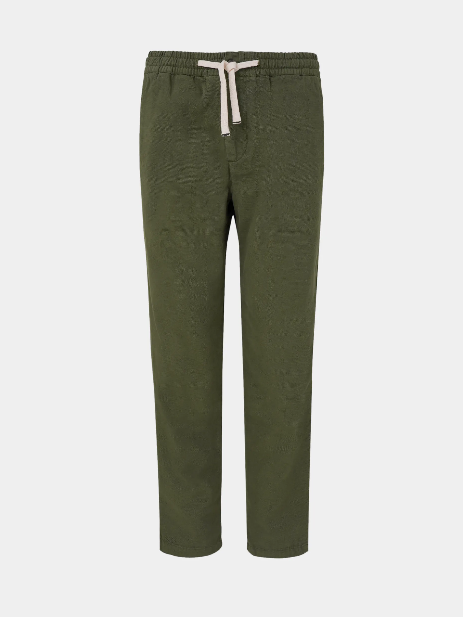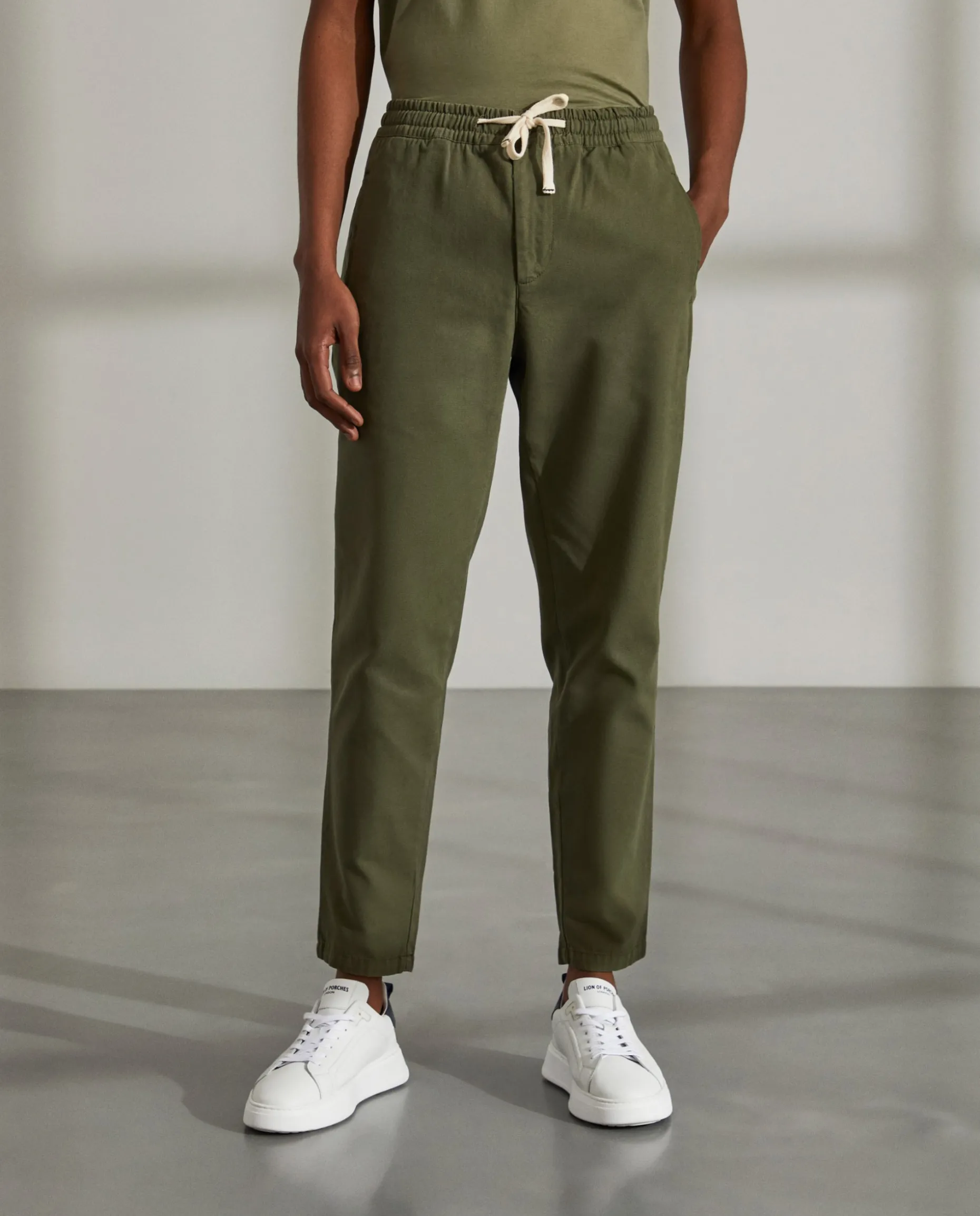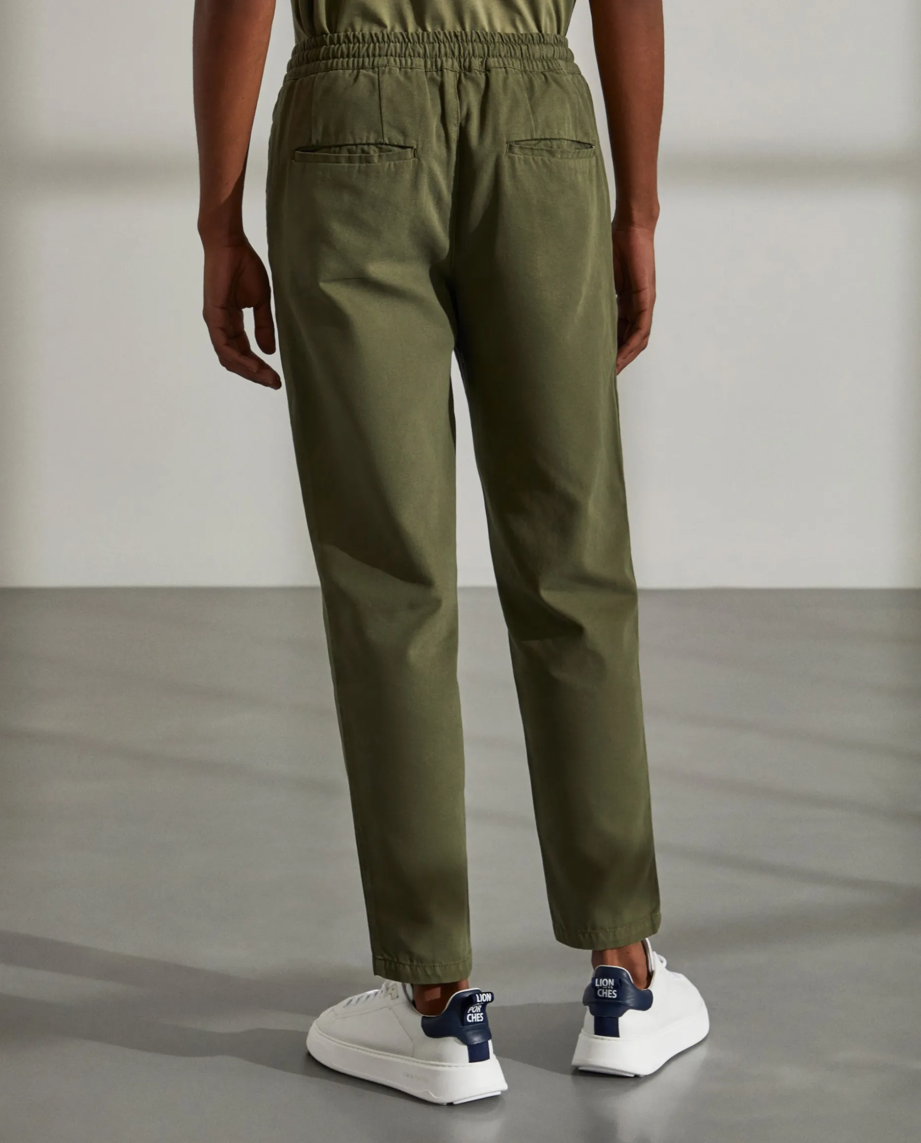 Calças Regular Fit. Confecionadas em 100% de algodão. Cintura com elástico. Apertam com fecho, botão e cordão. Bolsos laterais. Dois bolsos posteriores com fita decorativa no bolso direito.