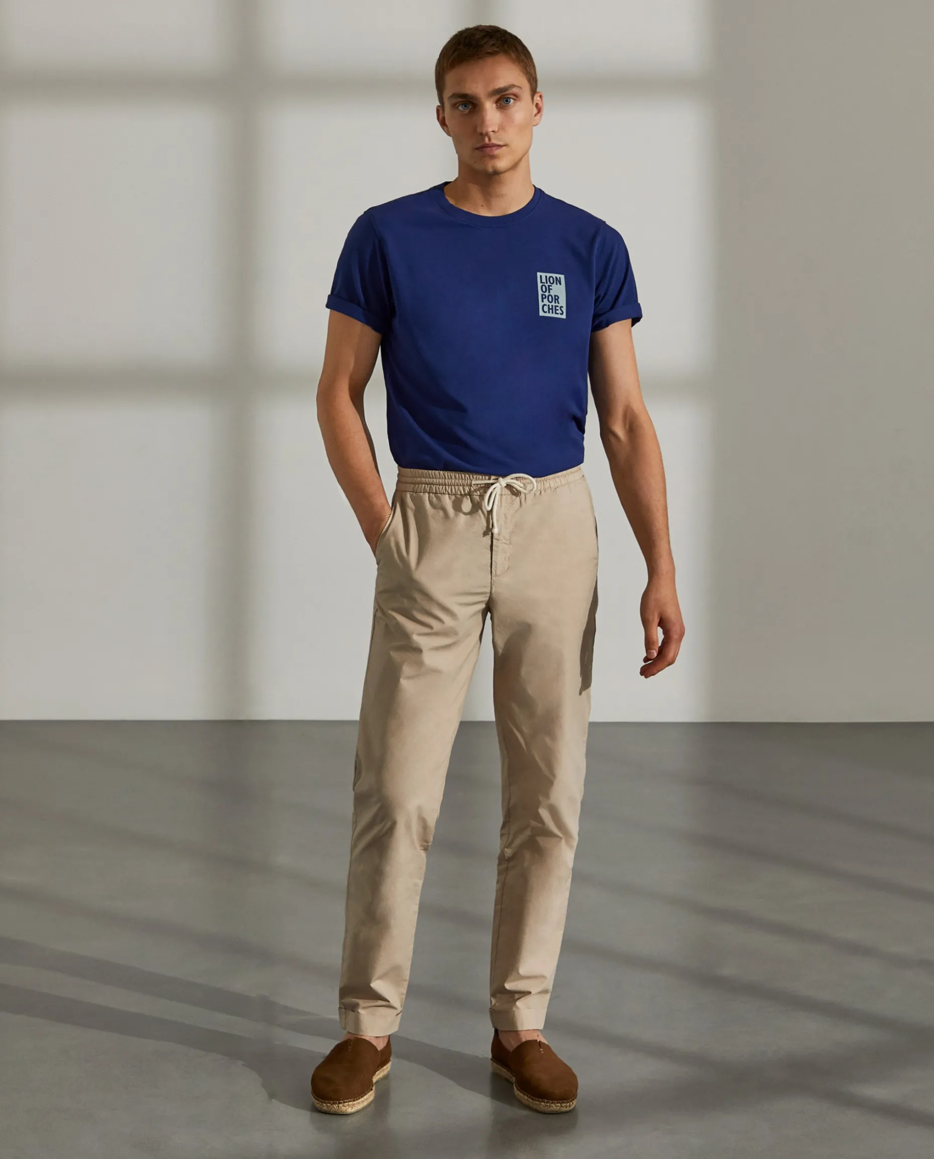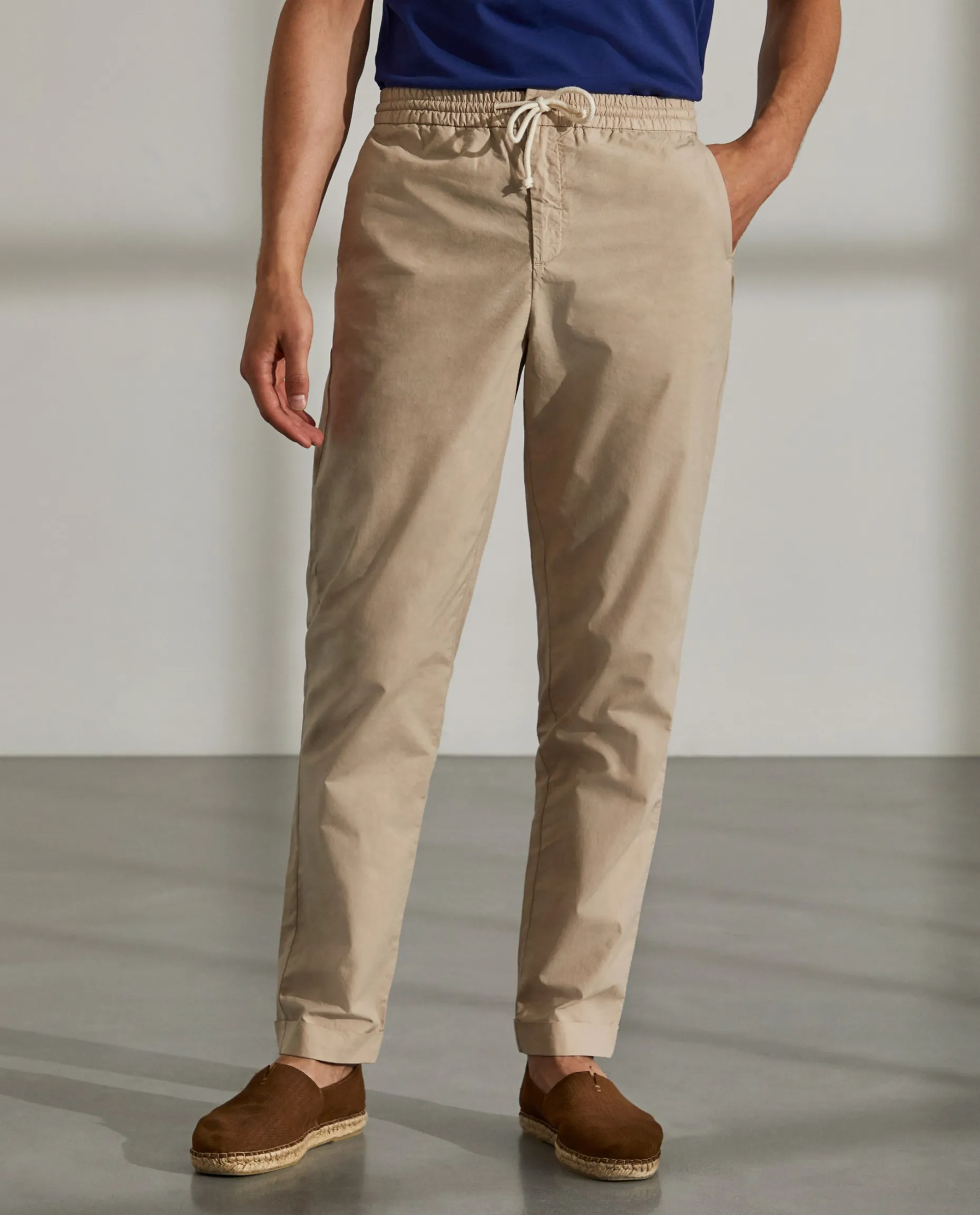 Calças Regular Fit. Condecionadas em algodão. Cintura elástica com fecho, cordão e botão personalizado. Bolsos laterais e dois bolsos posteriores com fita decorativa no bolso direito.
