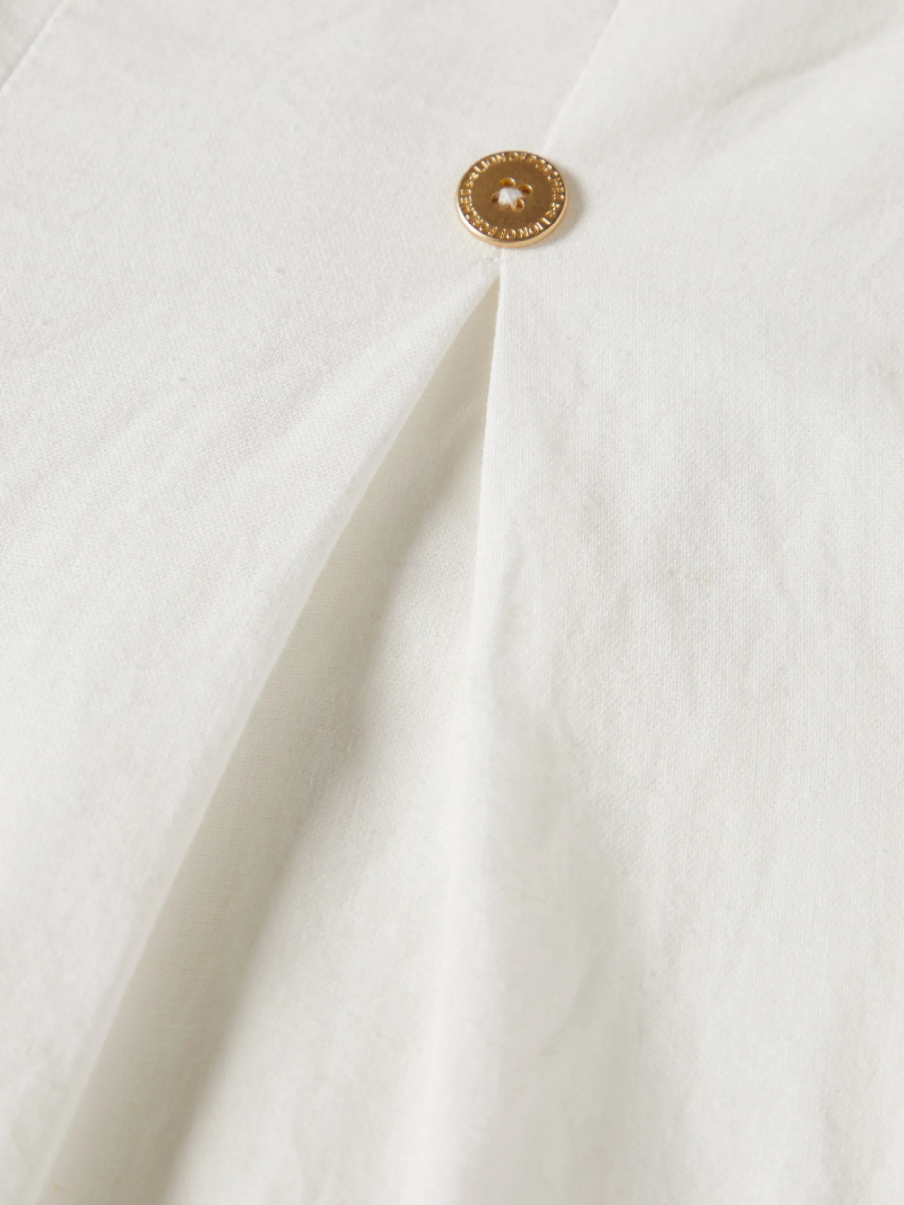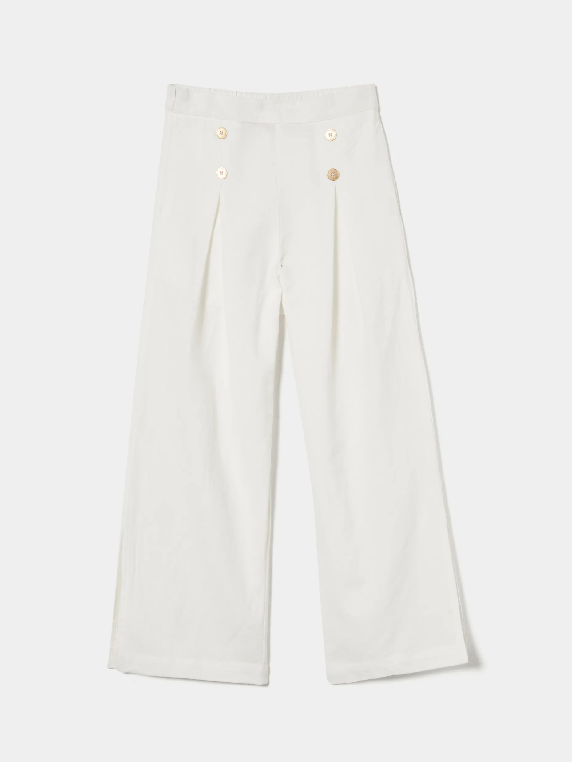 Calças largas com pregas na frente e botões dourados que conferem à peça mais elegância. Com cintura elástica na parte de trás para maior conforto e aberturas laterais na base da perna. São confecionadas com uma mistura de algodão e linho que conferem mais leveza e suavidade à peça.