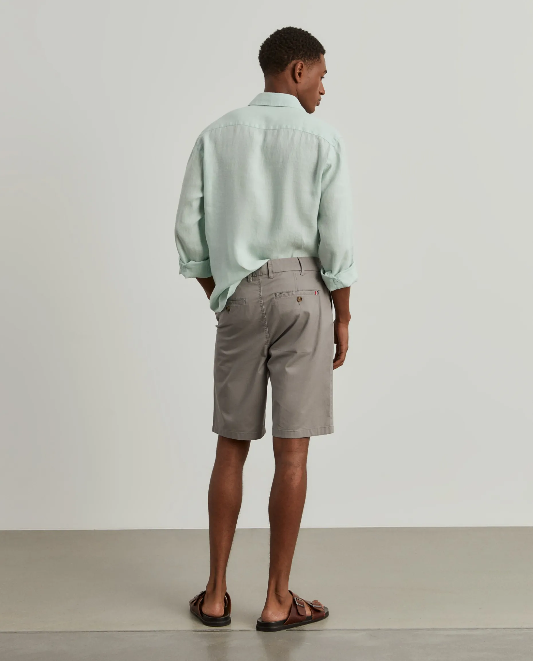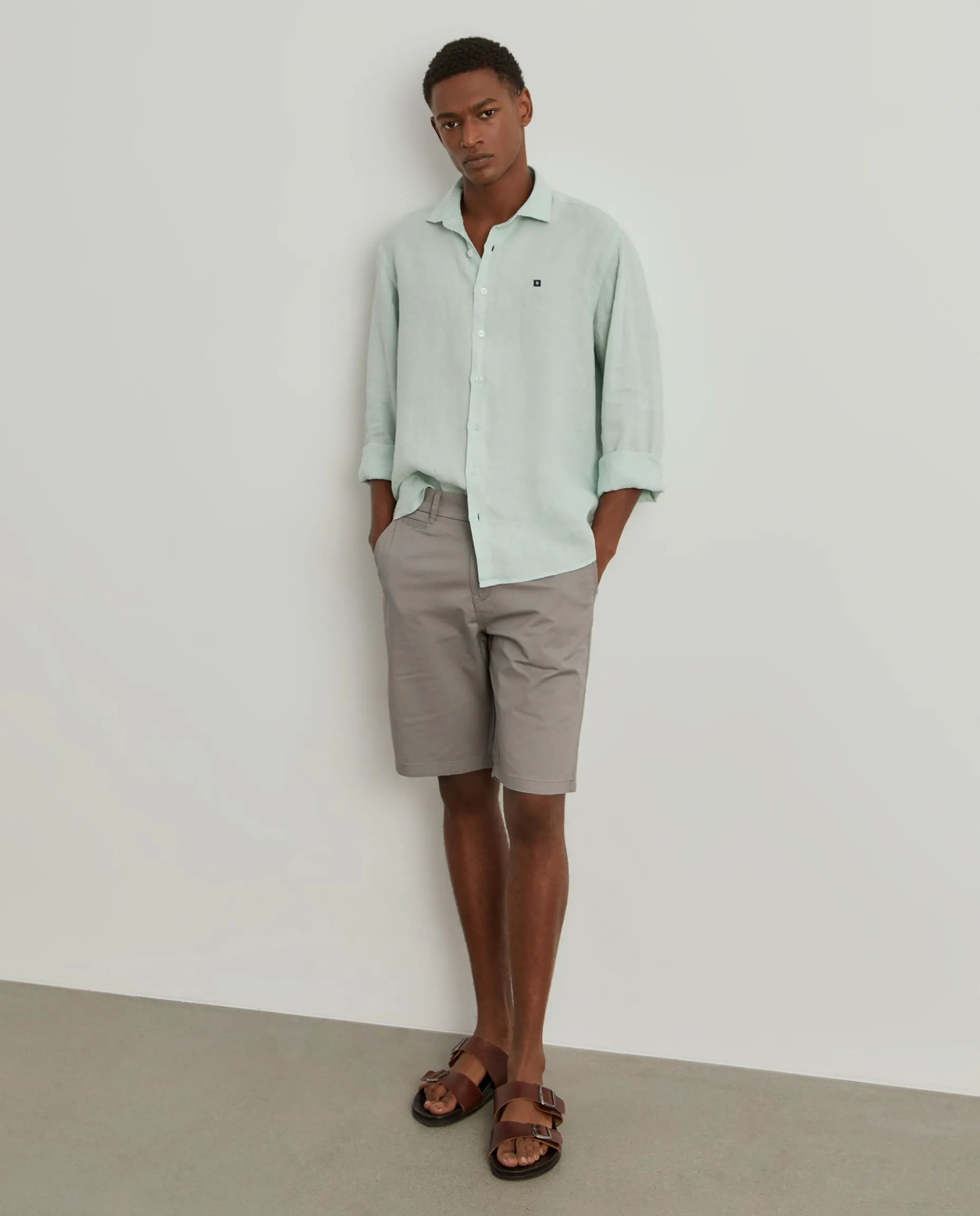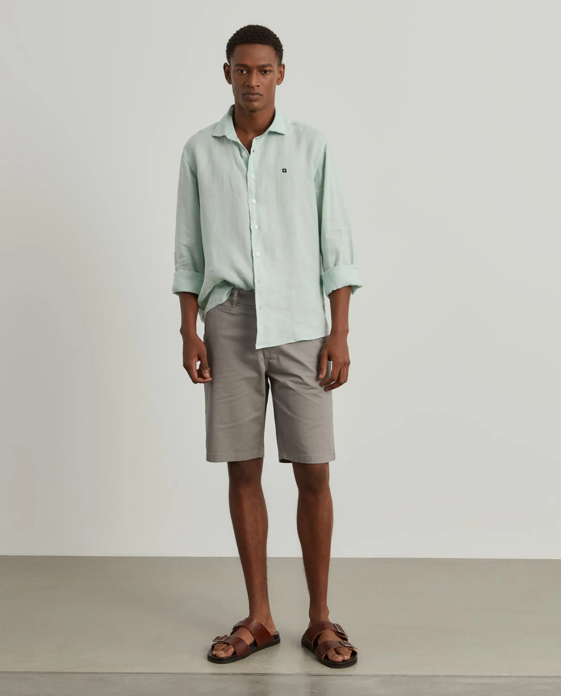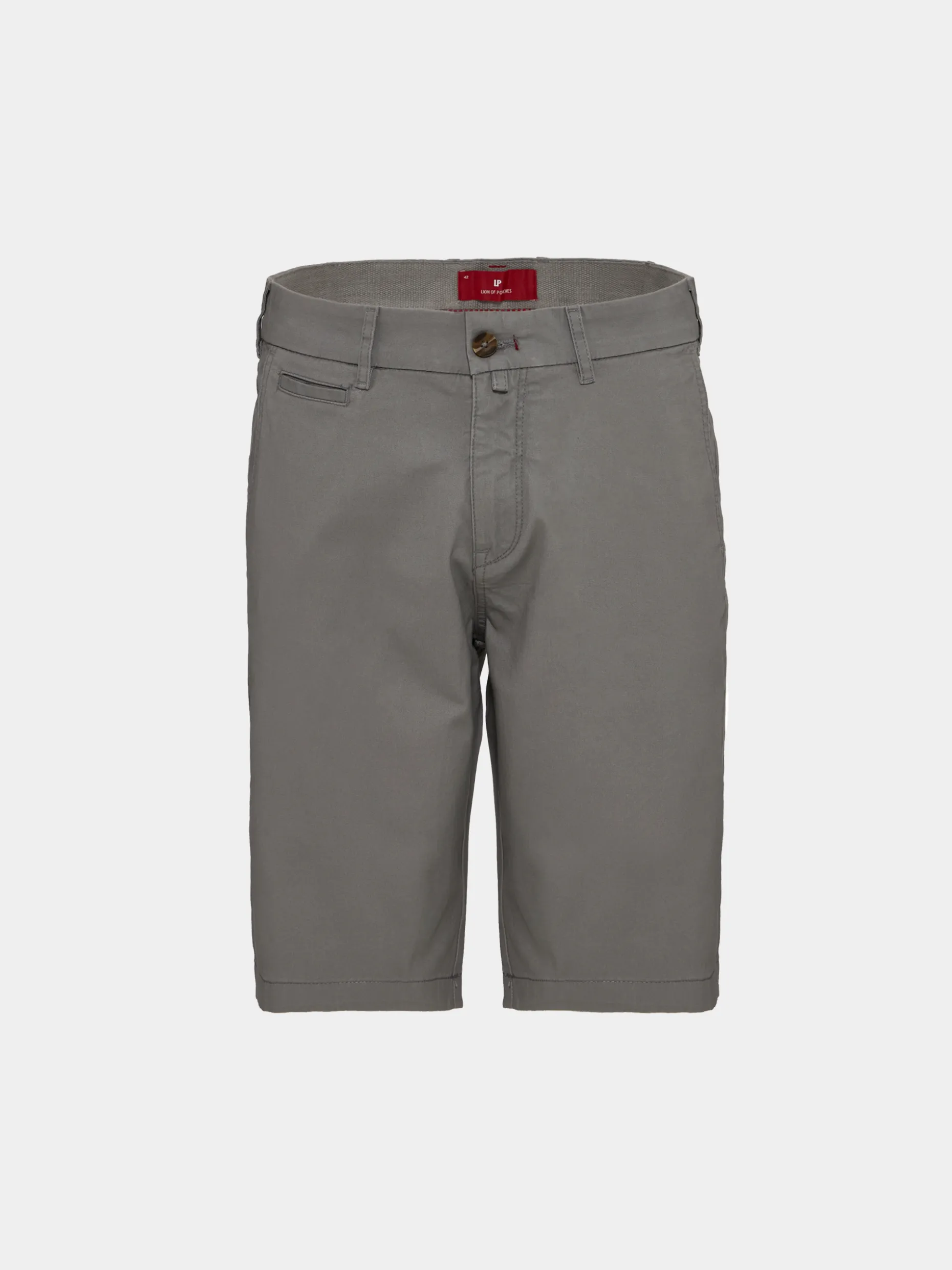 Bermudas. Apertam com fecho e botões personalizados. Bolsos laterais. Dois bolsos de vivo com botões atrás.