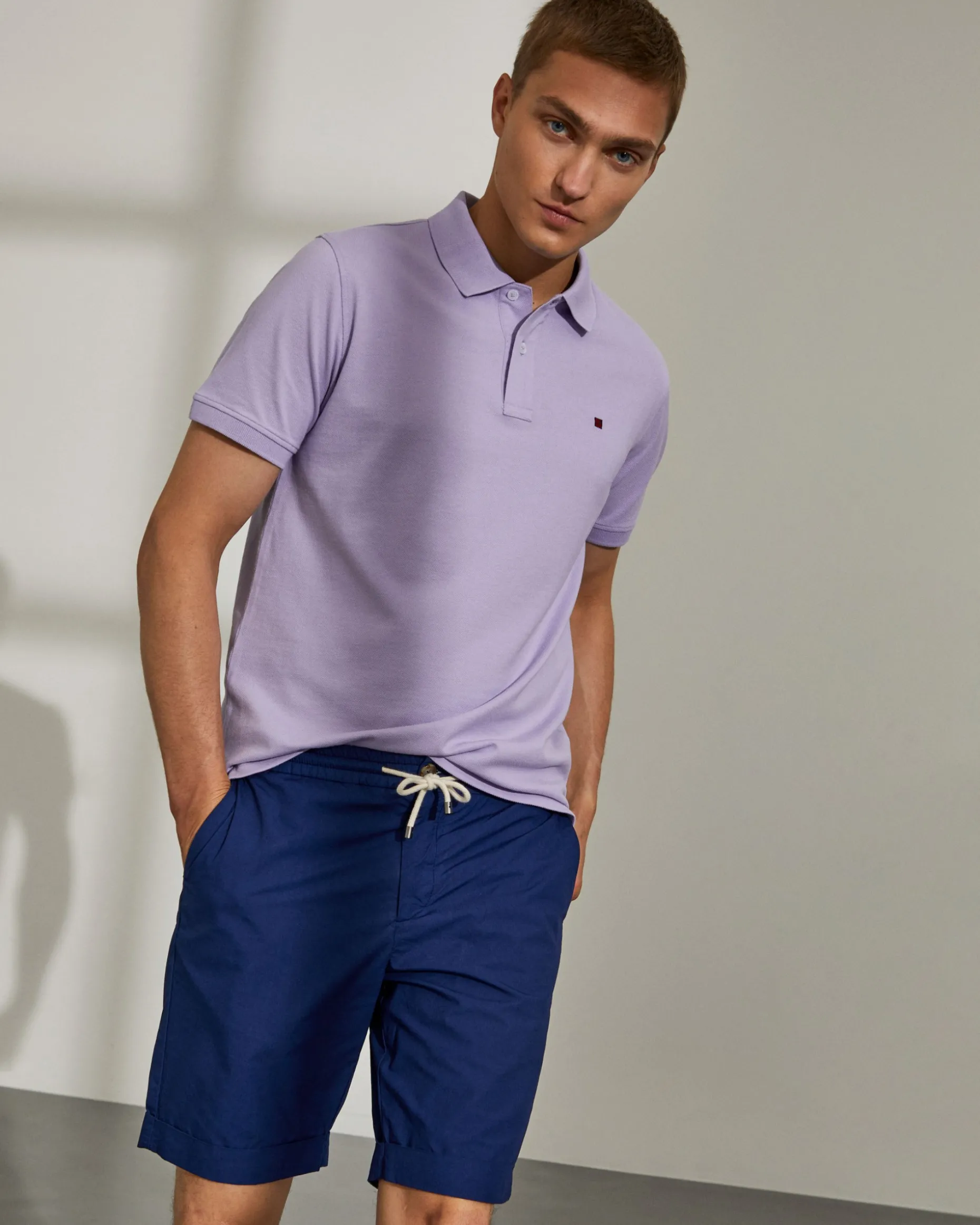 Bermudas confecionadas em algodão. Cintura elástica com fecho, cordão e botão personalizado. Bolsos laterais e bolsos posteriores com fita decorativa no bolso direito.