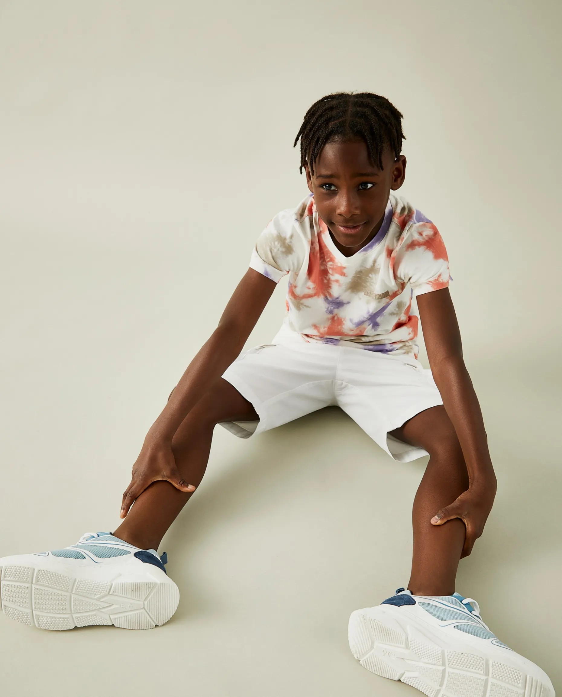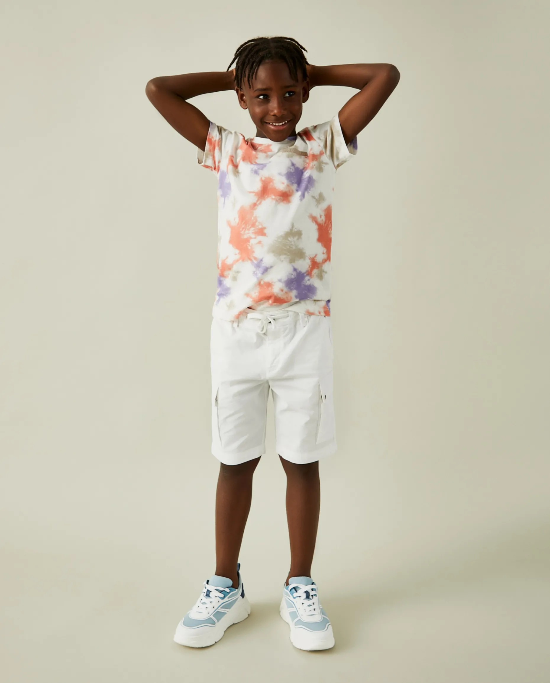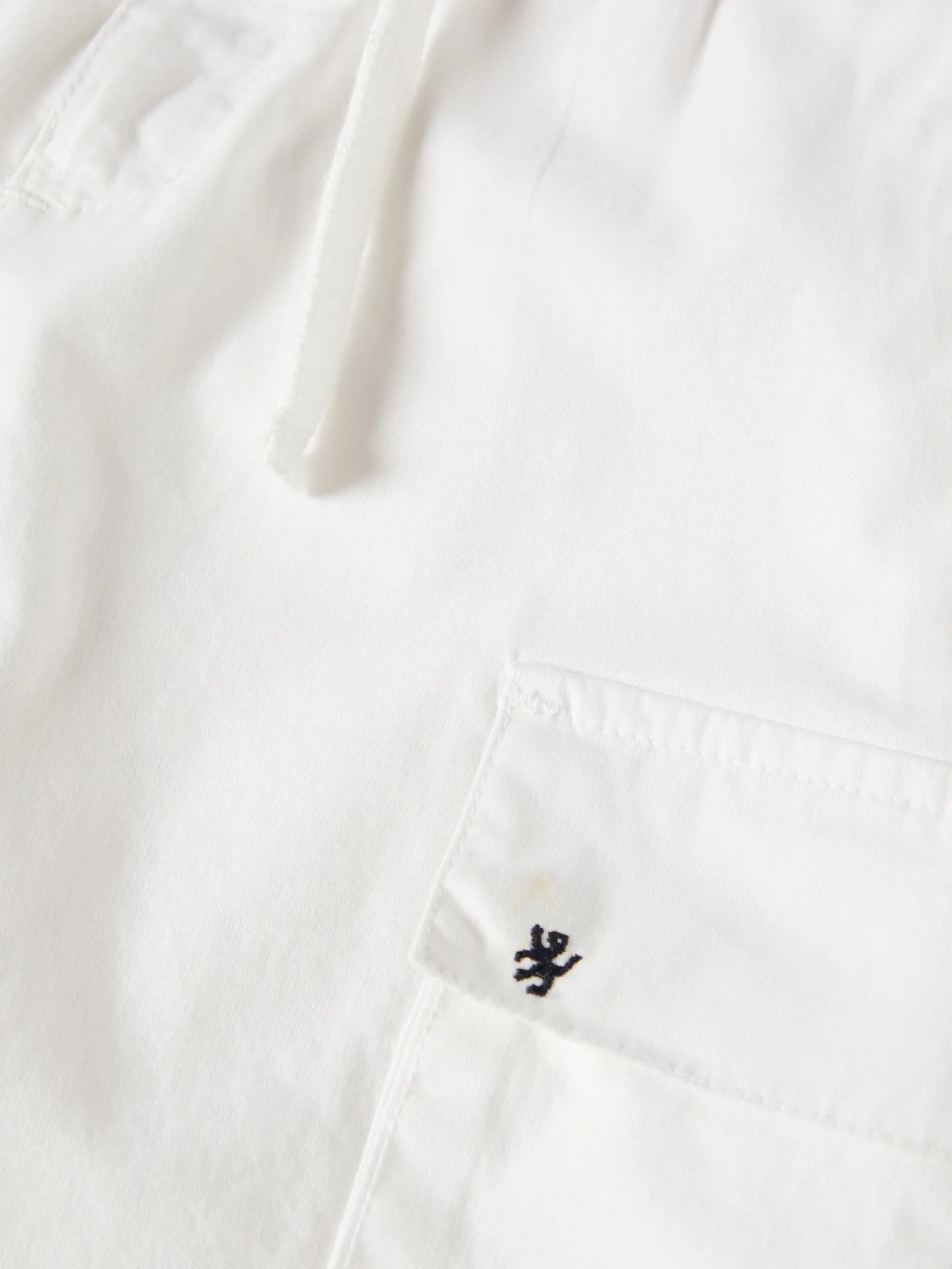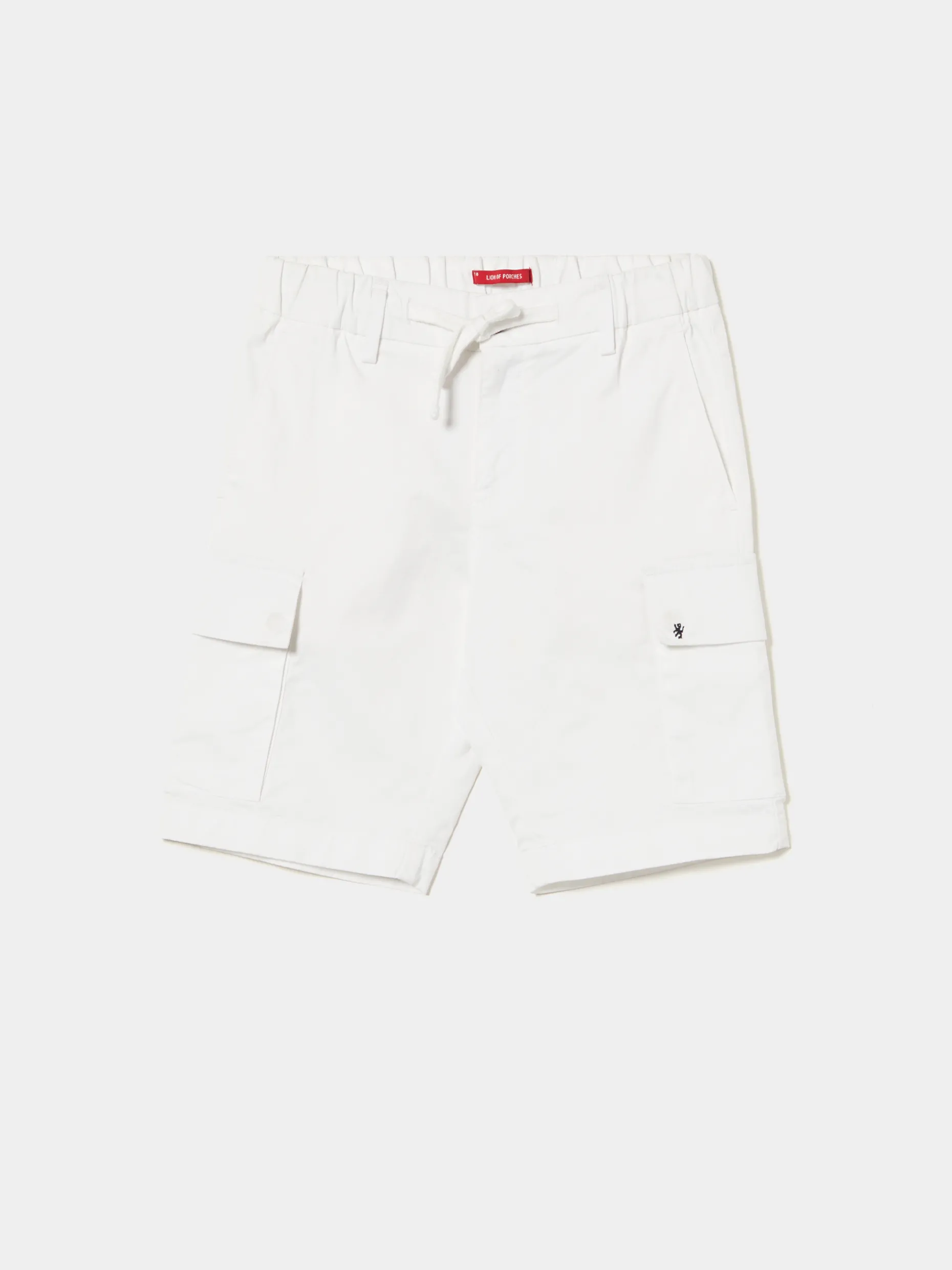 Calções cargo de sarja. Com bolsos de pala laterais, tem cintura elástica e aperto através de botão e fecho de correr, e ainda cordão no mesmo tom. Finaliza com pequeno leão bordado em contraste de cor no bolso. Atrás, também tem bolsos. É confecionado em algodão com uma pequena percentagem de elastano para maior conforto e facilidade de movimentos.
