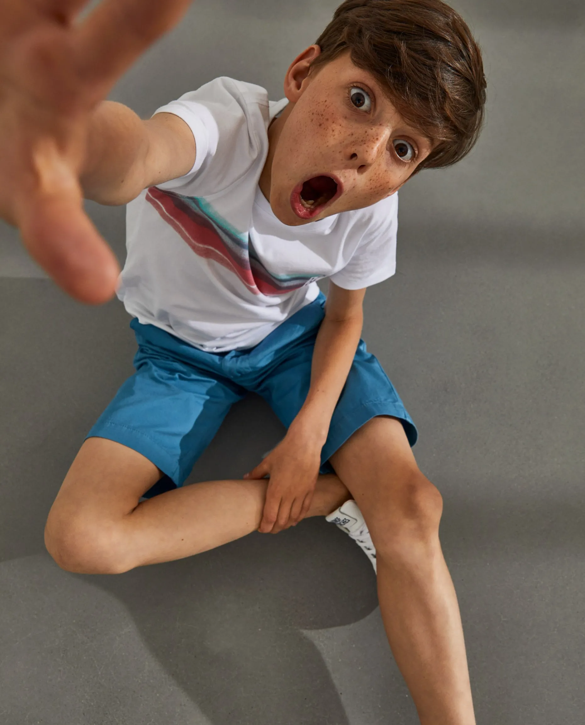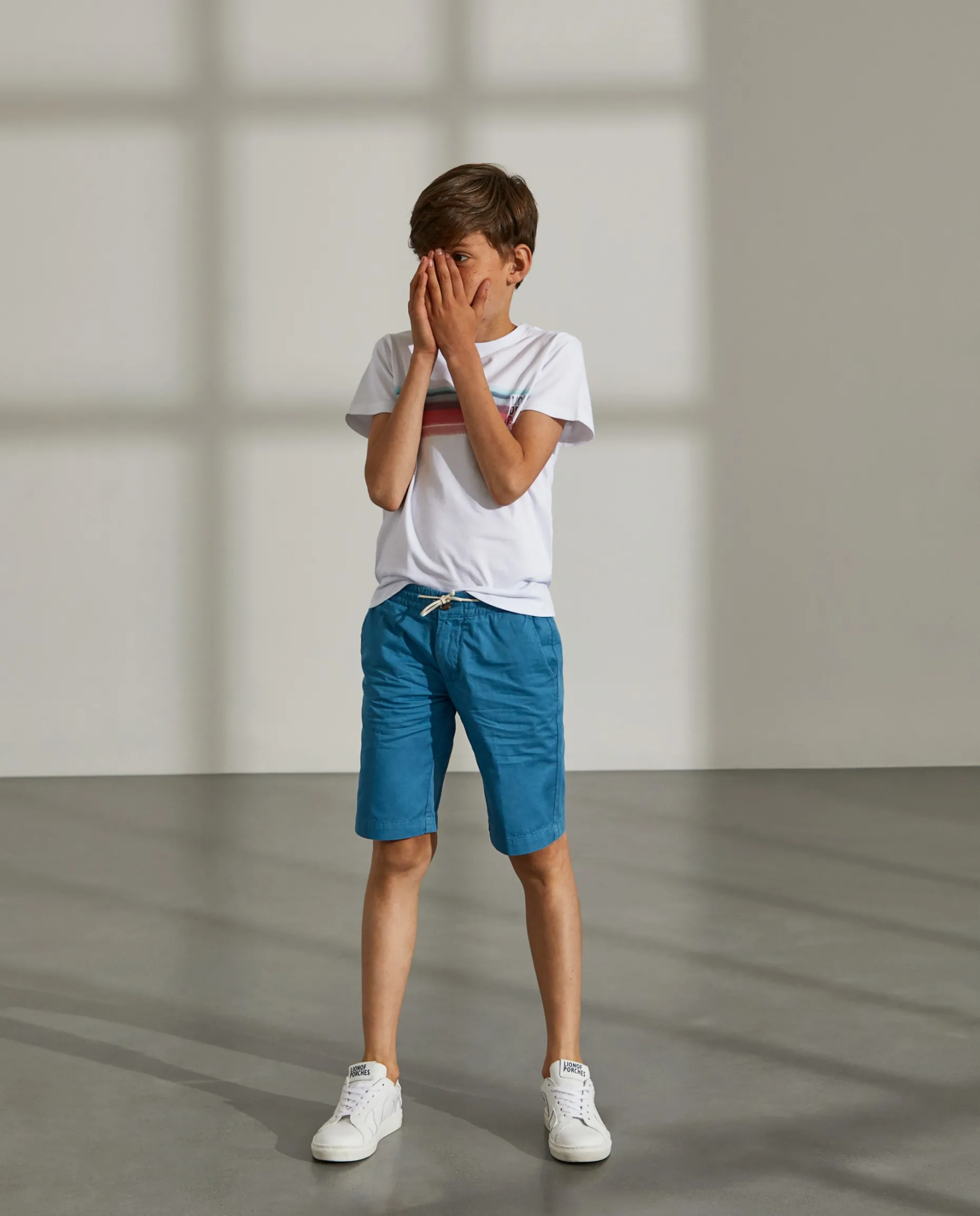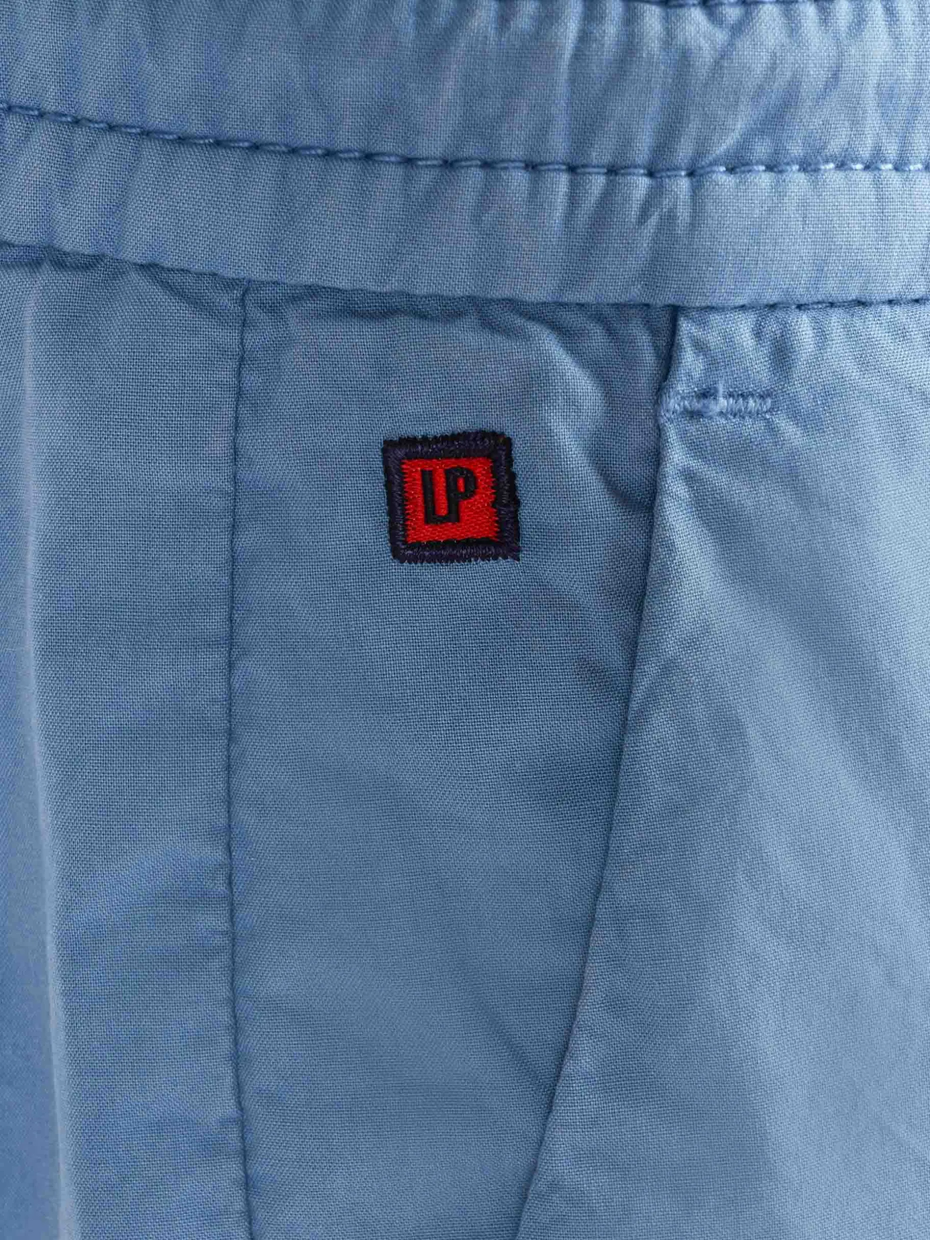 Calções chino com cordões em contraste. Detalhe da fita de riscas no bolso de trás. Etiqueta Lion of Porches bordada perto do bolso da frente.