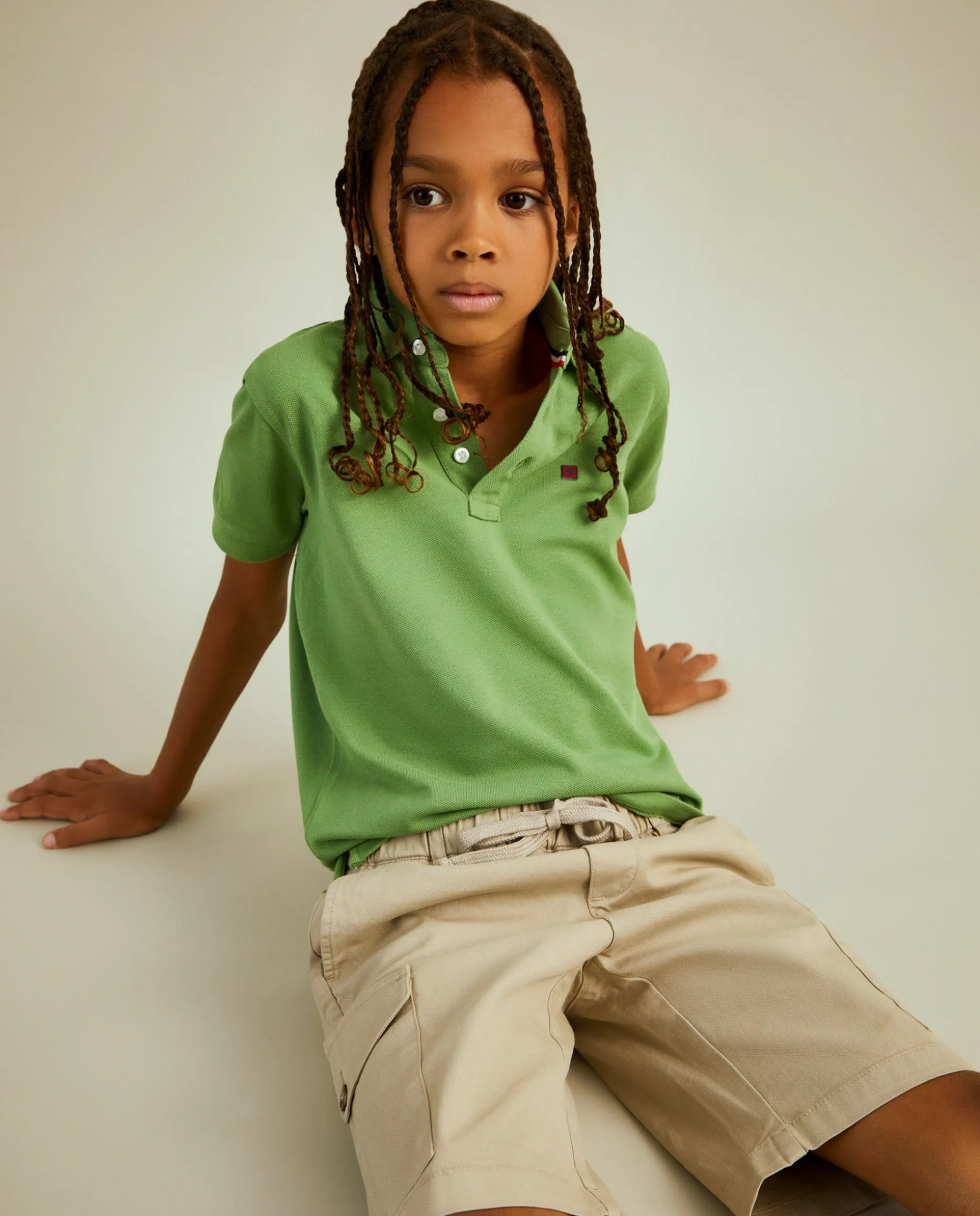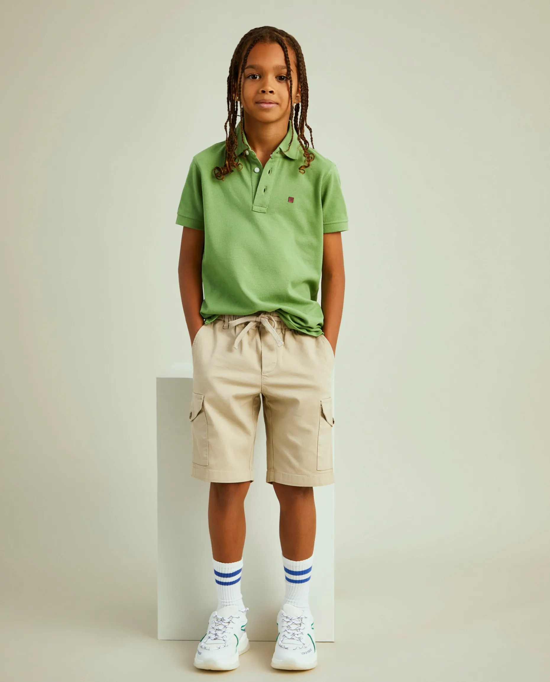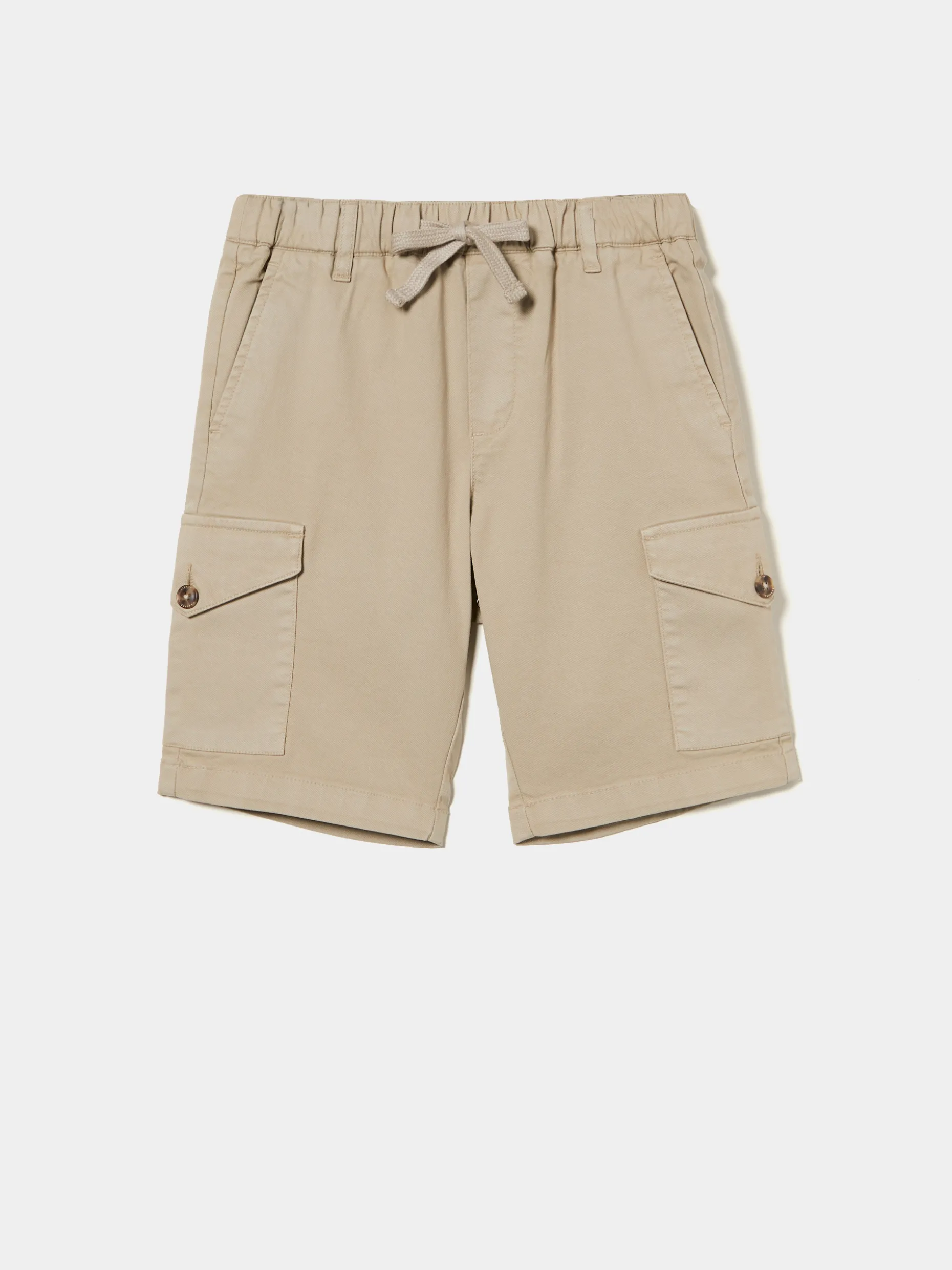 Calções em sarja com bolsos nas laterais. Cinto com elástico e cordões à cor. Bolso de chapa traseiro com botão.