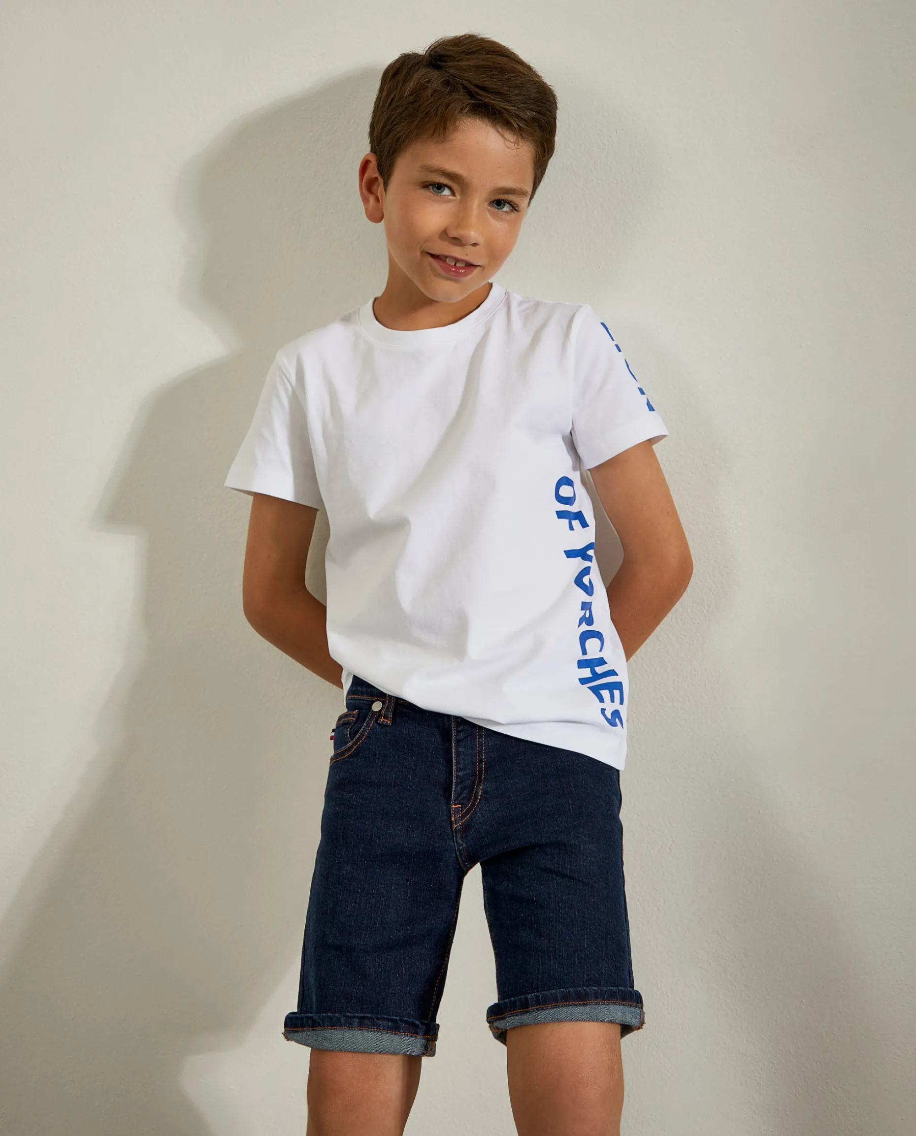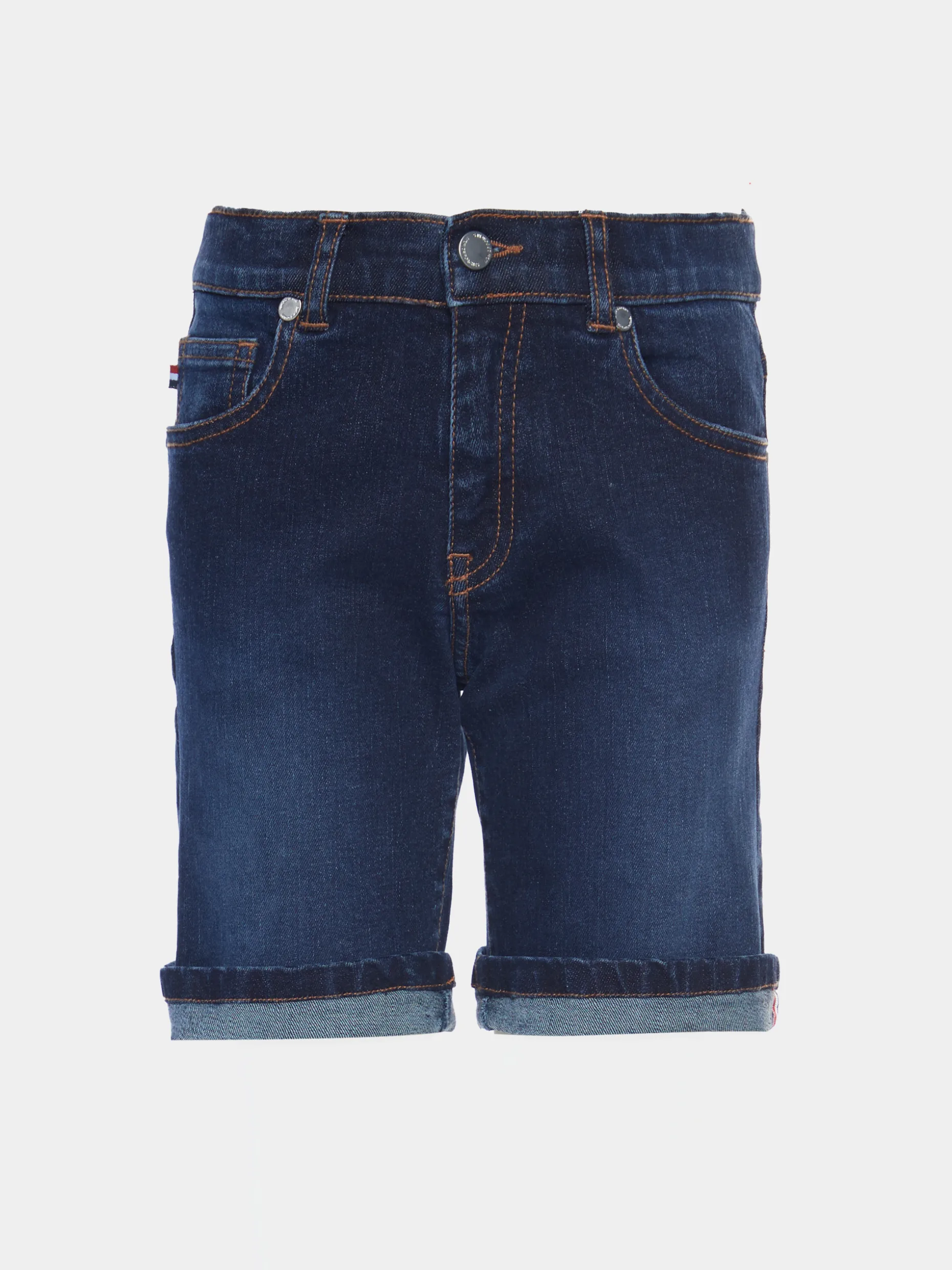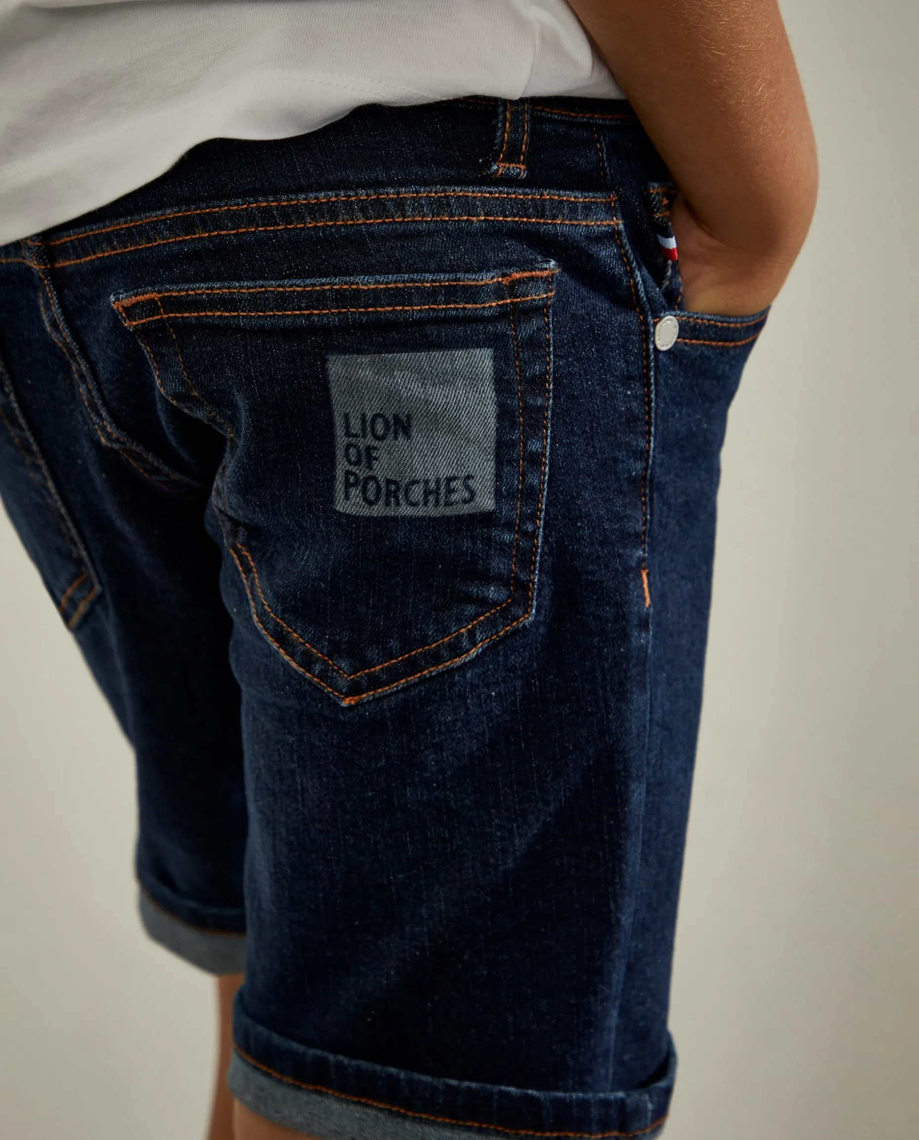 Calções de ganga com estampado a laser no bolso traseiro. Molas e rebites personalizados em prata mate. Detalhe da fita de riscas tricolor no bolso moedas e no interior da perna.