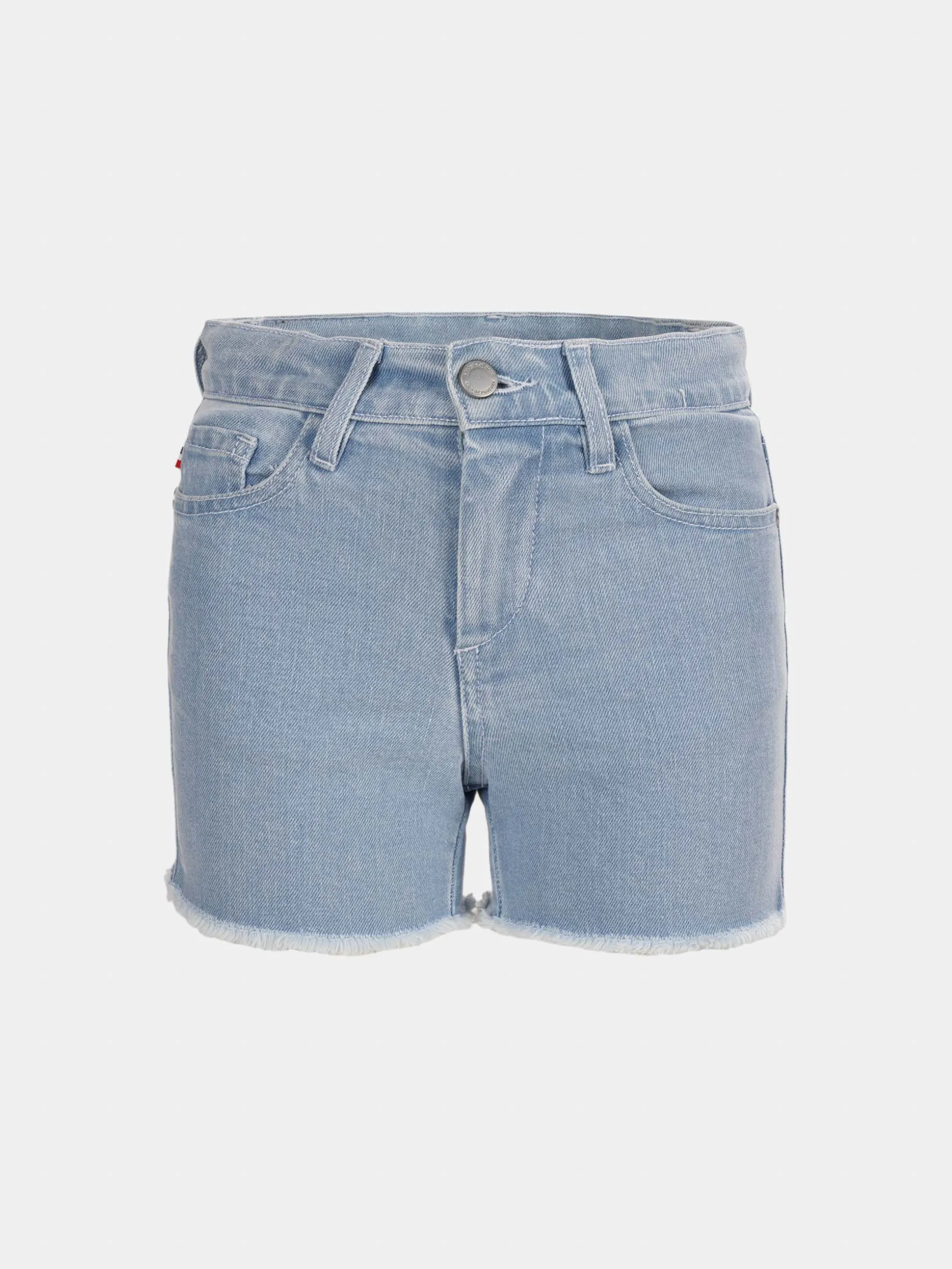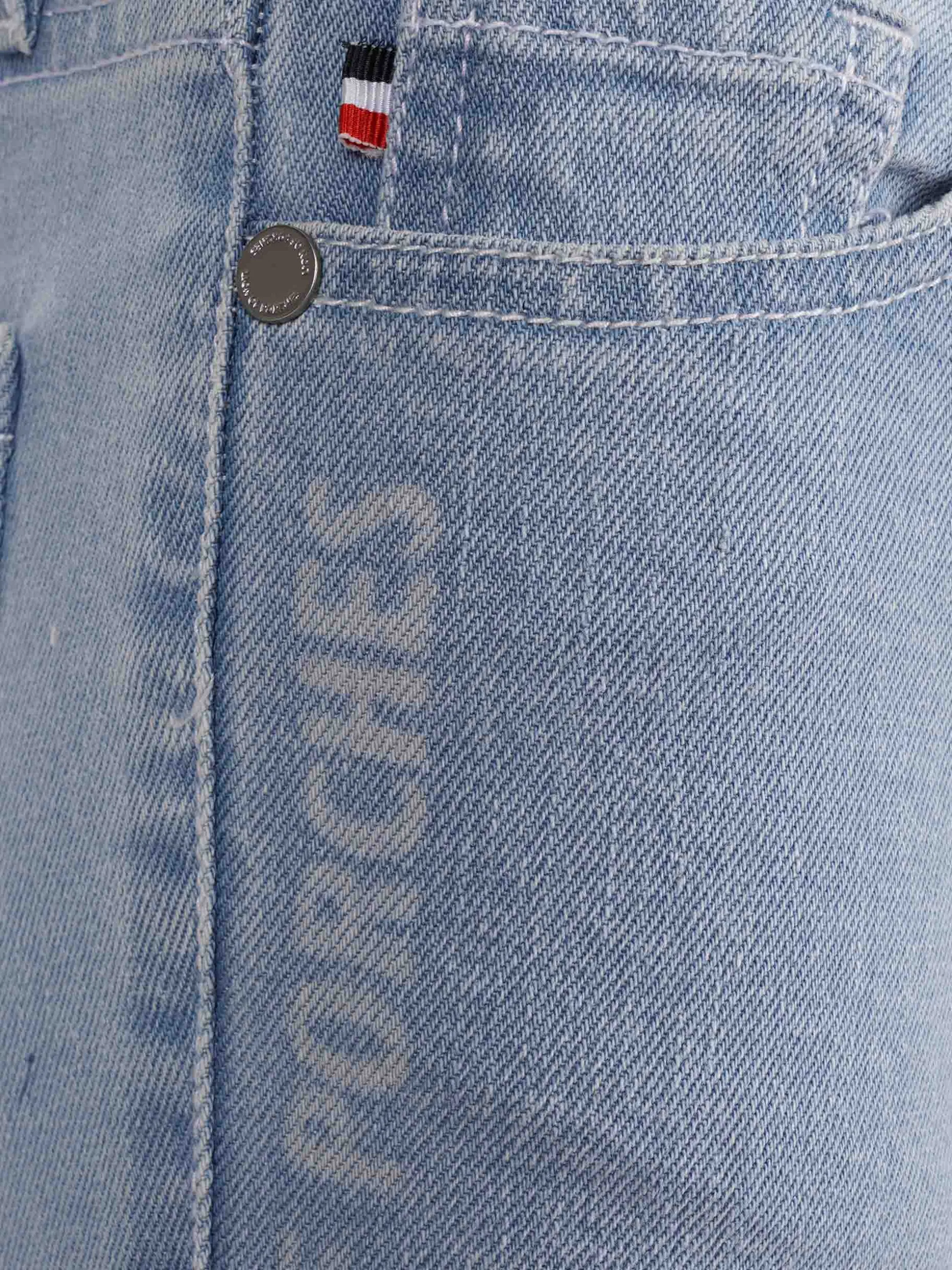 Calção em denim com estampado Lion of Porches a laser na lateral. Detalhe da fita de riscas no bolso da moedas. Etiqueta de pele camel personalizada no cinto na parte de trás.
