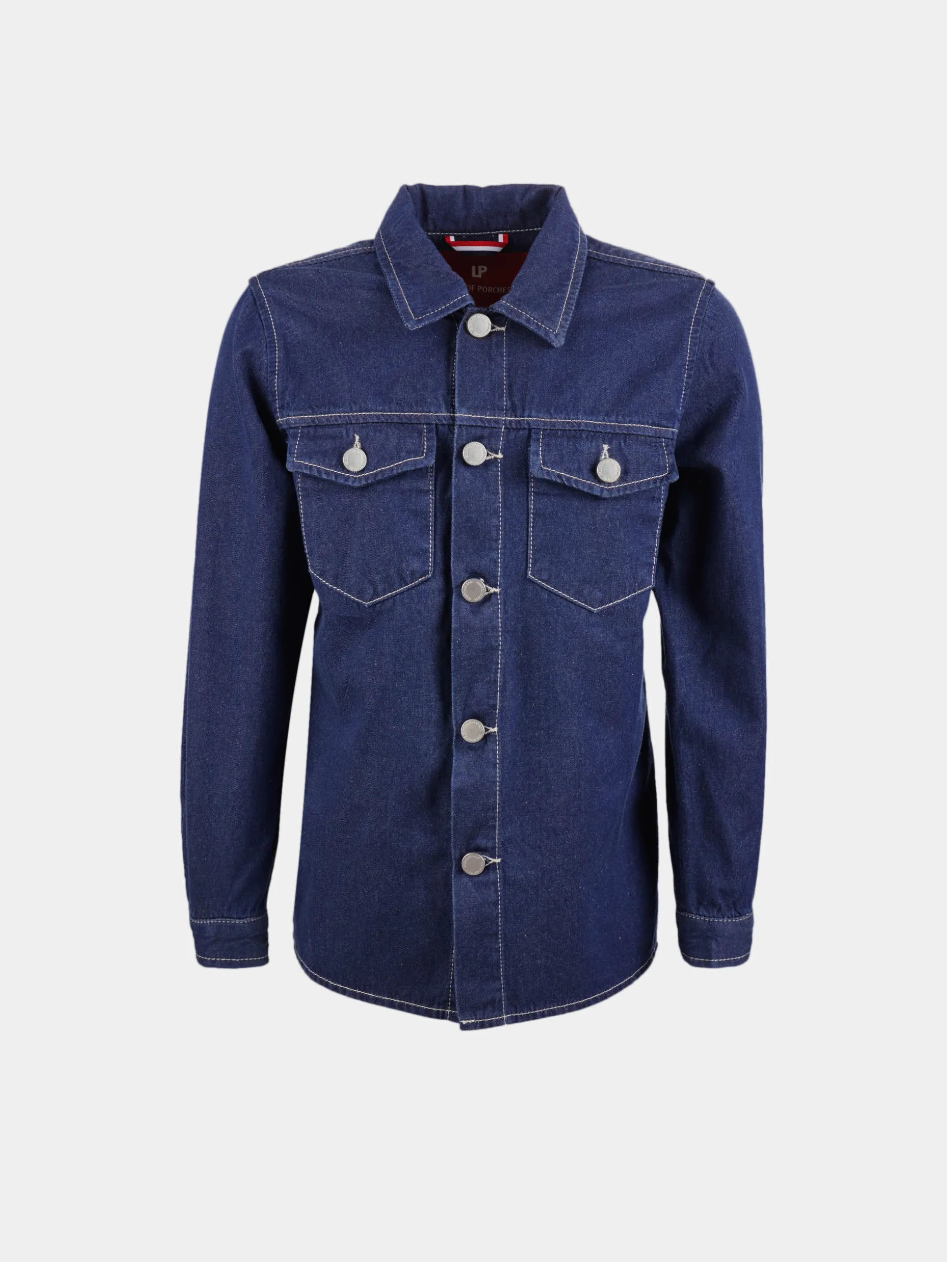 Camisa manga comprida em denim com bolsos na frente. Estampado Lion of Porches a lazer nas costas. Estampado LP a lazer na manga. Penduro interior em fita de riscas. Detalhe da fita de riscas na parte de trás da gola.